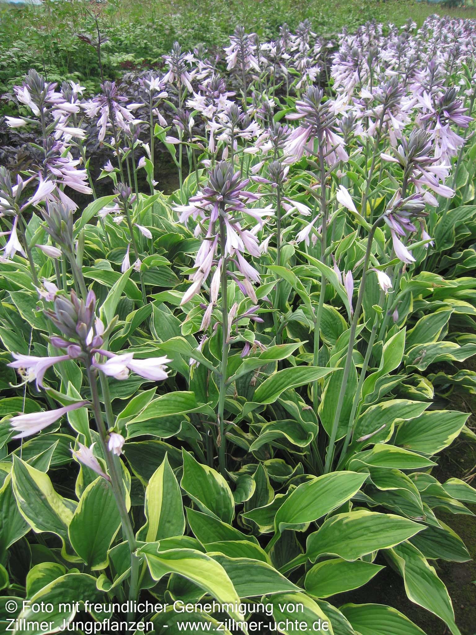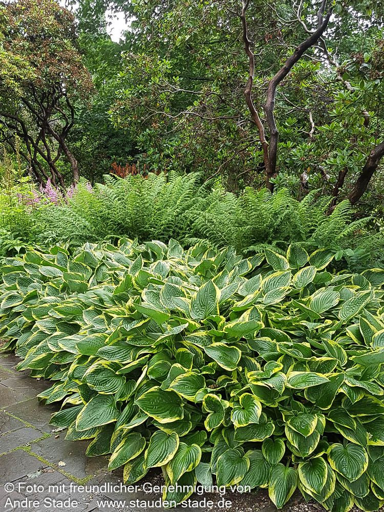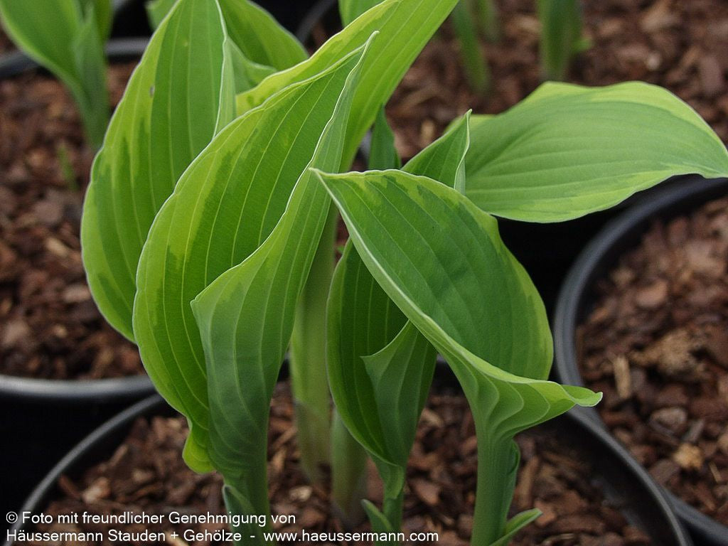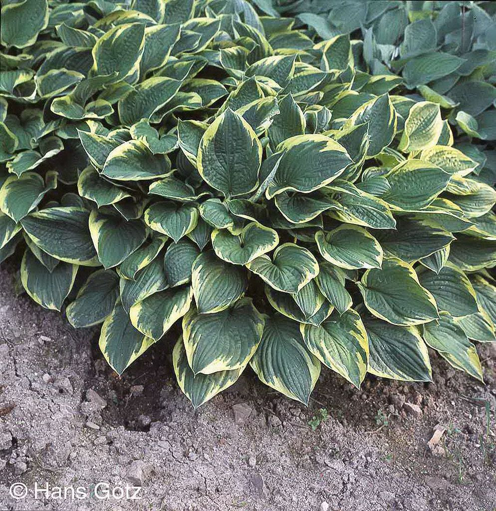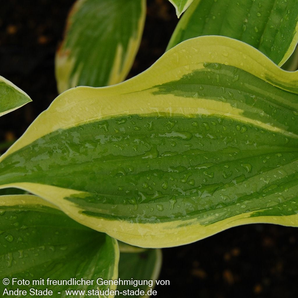 Die Goldrand-Funkie (Hosta x fortunei 'Aureomarginata') ist eine prächtige Blattschmuckstaude, die mit ihrer besonderen gelb-grünen Blattfärbung jeden schattigen Gartenbereich zum Strahlen bringt. Diese Staude des Jahres 2009 entwickelt ein ausladend-bogiges Blattwerk von 40-50 cm Höhe und verzaubert im Hochsommer mit violetten Blütenständen, die 50-70 cm erreichen. Als Sternensorte der deutschen Staudensichtung überzeugt sie sowohl als Beetstaude als auch als Gehölzrandstaude an halbschattigen Standorten. Die winterharte Staude eignet sich hervorragend zu Rhododendron, für Schnittzwecke und sogar als kulinarisch bedeutsame Gartenpflanze auf frischen Böden.
