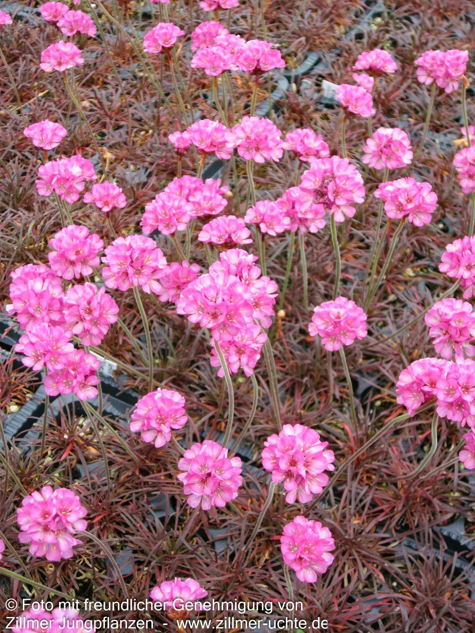 Die Grasnelke (Armeria maritima 'Vesuv') ist eine bezaubernde Staude, die mit ihren leuchtend roten, einfachen Blüten von Mai bis Juli jeden Steingarten zum Strahlen bringt. Diese wintergrüne Züchtung bildet attraktive, halbkugelige Polster mit rötlichgrünem Laub und erreicht eine Blütenhöhe von 15 cm bei einer Blattwerkhöhe von 10 cm. Die robuste Staude gedeiht optimal an sonnigen Standorten auf trockenen Böden und eignet sich hervorragend für Steinanlagen, Felssteppe und Steinfugen. Mit ihrer Winterhärte bis -11 °C und dem wintergrünen Charakter ist diese Grasnelke eine perfekte Wahl für den Bauerngarten. Pflanzen Sie 3-5 Stück pro Tuff mit einem Abstand von 15-20 cm für eine optimale Wirkung.