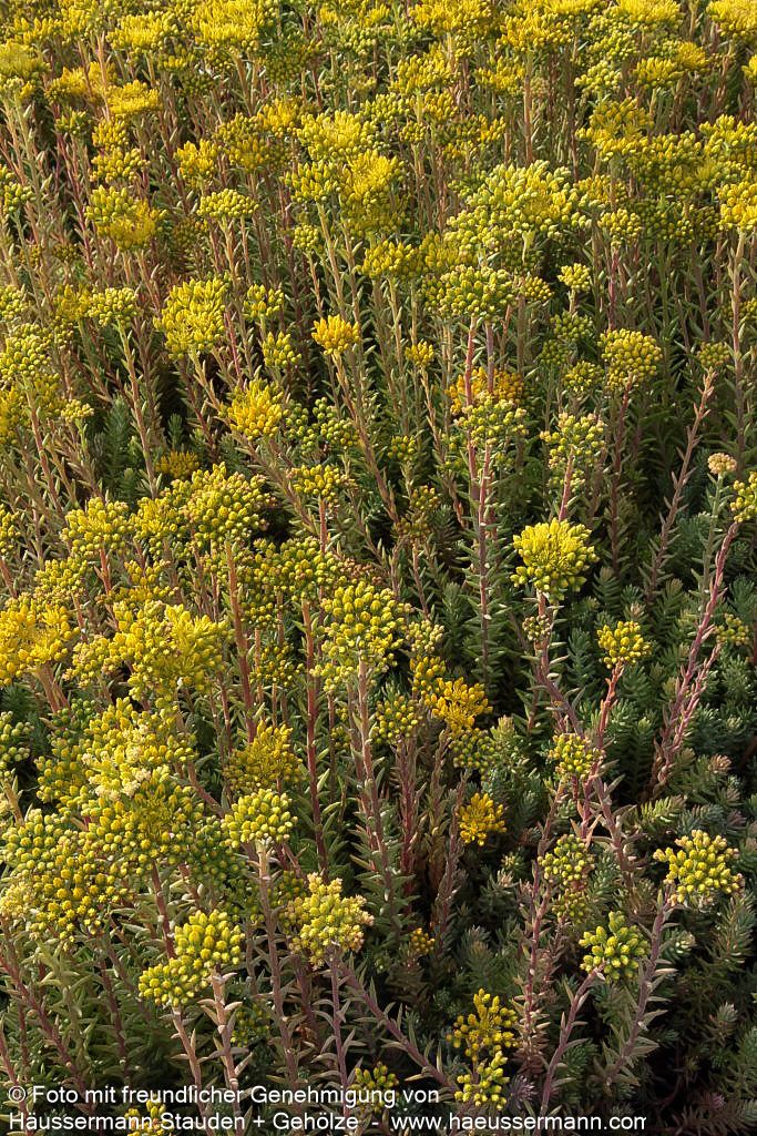 Die Graue Tripmadam (Sedum reflexum Typ Degenberg) ist eine außergewöhnliche Züchtung, die als Staude des Jahres 2000 und erneut 2011 ausgezeichnet wurde. Diese robuste Staude begeistert von Juli bis August mit ihren leuchtend tief-gelben Blüten, die eine Höhe von 20 cm erreichen. Die blaugrünen, wintergrünen Blätter bilden einen reizvollen Kontrast zur goldgelben Blütenpracht. Mit ihrem teppichartigen und kriechenden Wuchs eignet sich diese vielseitige Pflanze perfekt als Bodendecker, für Steinanlagen und die extensive Dachbegrünung. An sonnigen Standorten mit trockenen Böden entfaltet sie ihre volle Schönheit und dient gleichzeitig als wertvolle Insektennährpflanze sowie kulinarische Bereicherung.