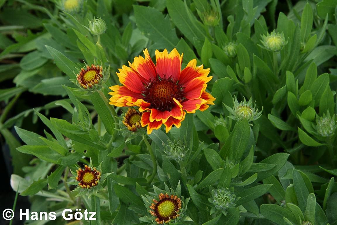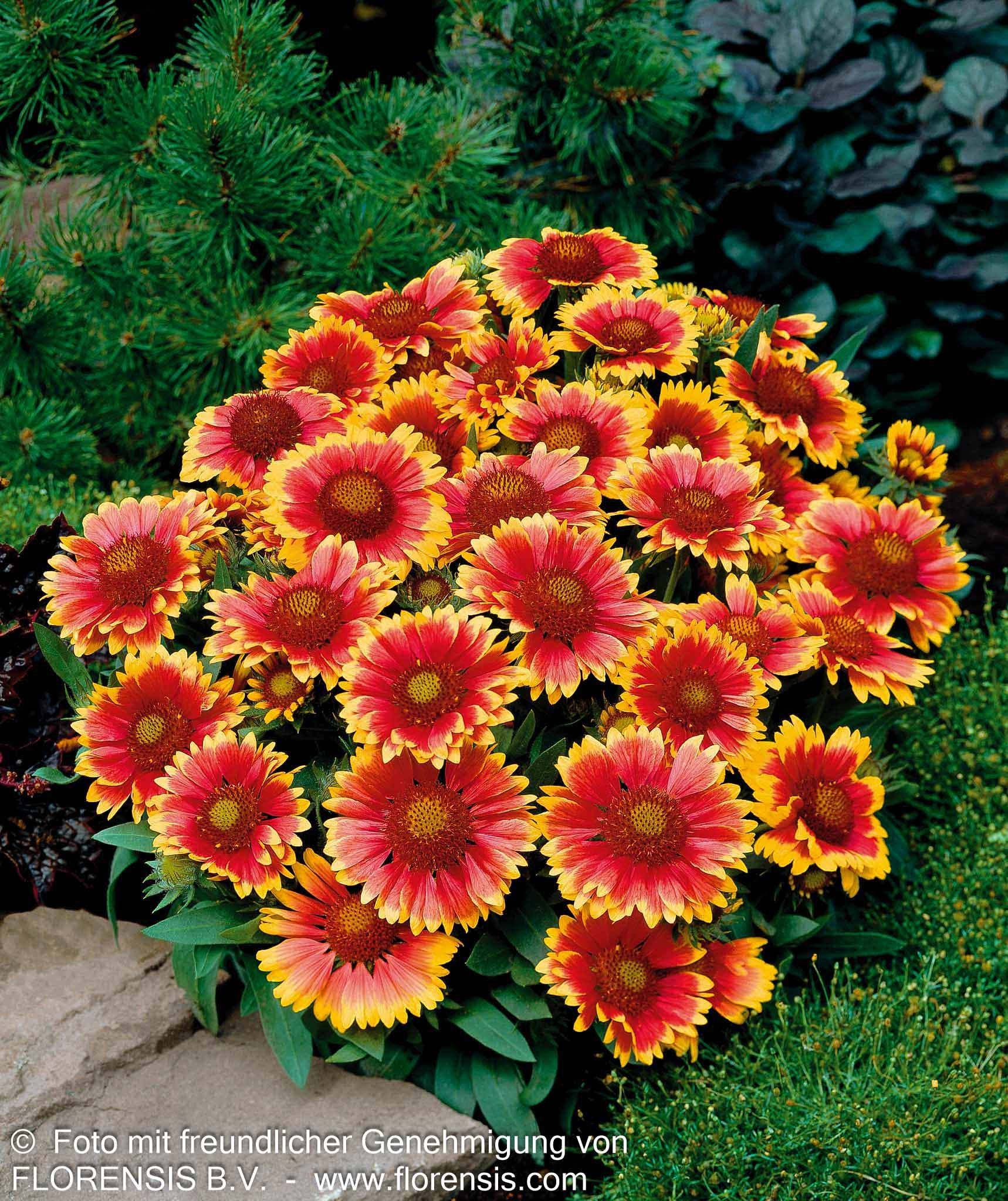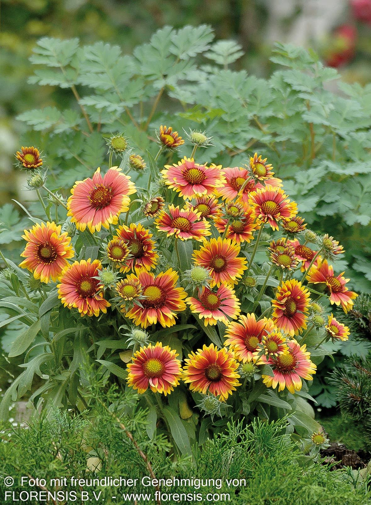 Die Großblumige Kokardenblume (Gaillardia x grandiflora 'Arizona Sun') verzaubert mit ihren leuchtend gelb-roten Blüten von Juni bis September jeden Garten. Diese kompakte Staude erreicht eine Höhe von 30 cm und bildet mit ihren sommergrünen, tiefgrünen Blättern einen attraktiven grundständigen Blattschopf mit aufrechten Stängeln. Als robuste Leitstaude bevorzugt sie sonnige Standorte mit frischen Böden und eignet sich hervorragend für Beetbepflanzungen, Steinanlagen und den authentischen Bauerngarten. Mit ihrer Winterhärte bis -22°C und einem empfohlenen Pflanzabstand von 30 cm ist diese gelb blühende Züchtung eine zuverlässige Bereicherung für jeden Staudengarten.