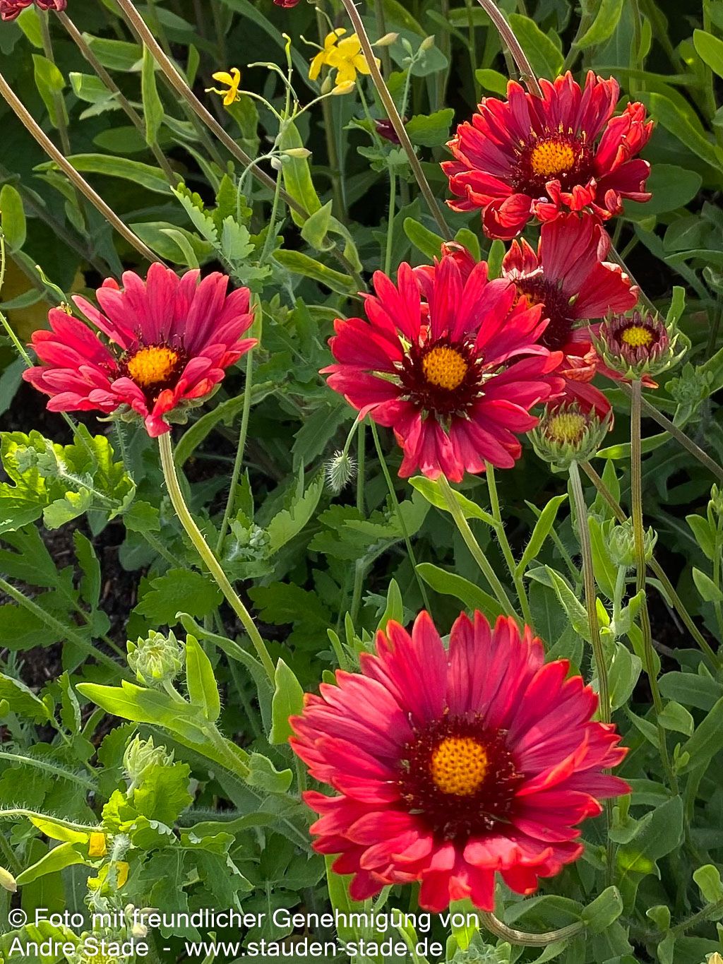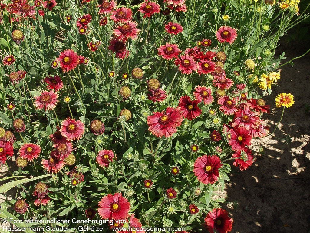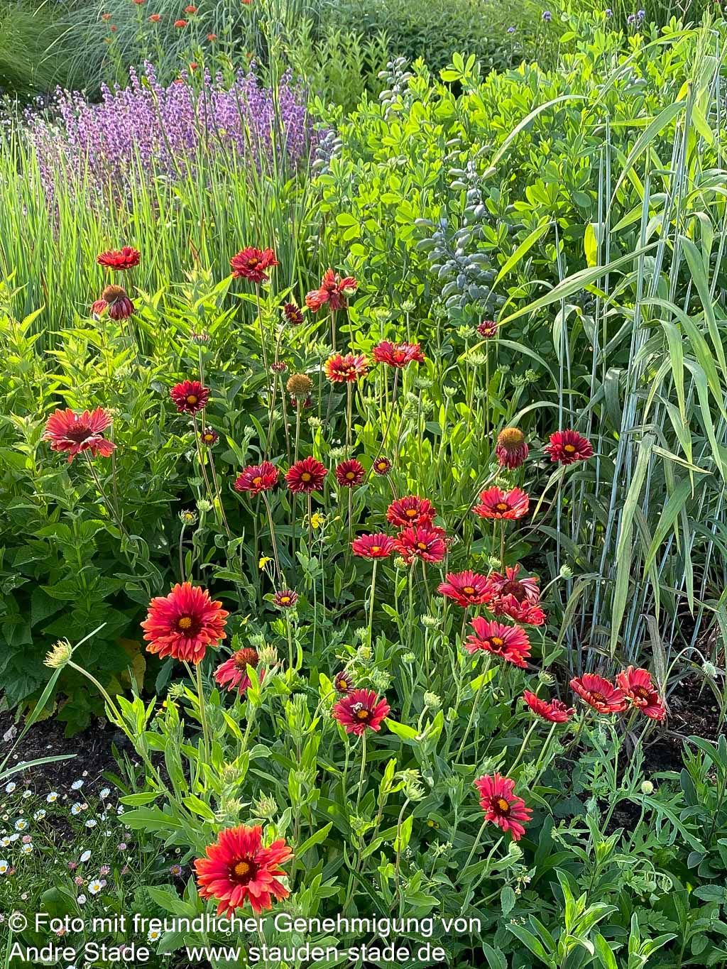 Die Großblumige Kokardenblume (Gaillardia x grandiflora 'Burgunder') verzaubert mit ihren leuchtend tief-roten, einfachen Blüten von Juli bis September jeden Garten. Diese robuste Staude erreicht eine Blütenhöhe von 70 cm und bildet mit ihren aufrechten Stängeln und dem grundständigen Blattschopf eine imposante Erscheinung. Die tief-grünen, sommergrünen Blätter bilden einen perfekten Kontrast zu den strahlenden Blüten. An einem sonnigen Standort mit frischem Boden gedeiht diese Leitstaude prächtig und ist ideal für den Bauerngarten geeignet. Als wertvolle Insektennährpflanze und für die Floristik ist sie ein echter Allrounder mit einer Winterhärte bis -22°C.
