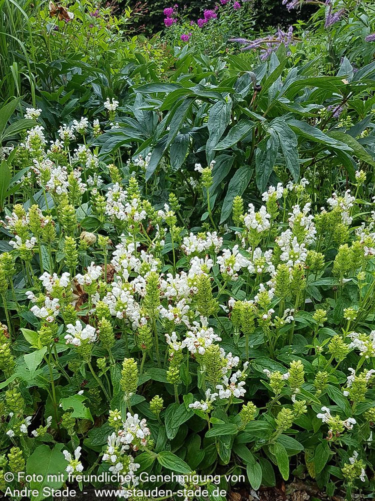 Die Großblütige Braunelle (Prunella grandiflora 'Alba') ist eine außergewöhnliche Sternensorte unter den Stauden, die von Juni bis September mit ihren eleganten weißen Blüten bezaubert. Diese winterharte Staude erreicht eine Blütenhöhe von 10-20 cm und entwickelt sich mit ihrem niederliegenden bis aufsteigenden Wuchs zu einem attraktiven kleinflächigen Bodendecker. Als wertvolle Insektennährpflanze eignet sie sich hervorragend für Gehölzränder und Freiflächen, wo sie bei sonnigen bis halbschattigen Lichtverhältnissen und trockenen bis frischen Böden optimal gedeiht. Dank ihrer Robustheit ist diese Züchtung auch ideal für die extensive Dachbegrünung geeignet.