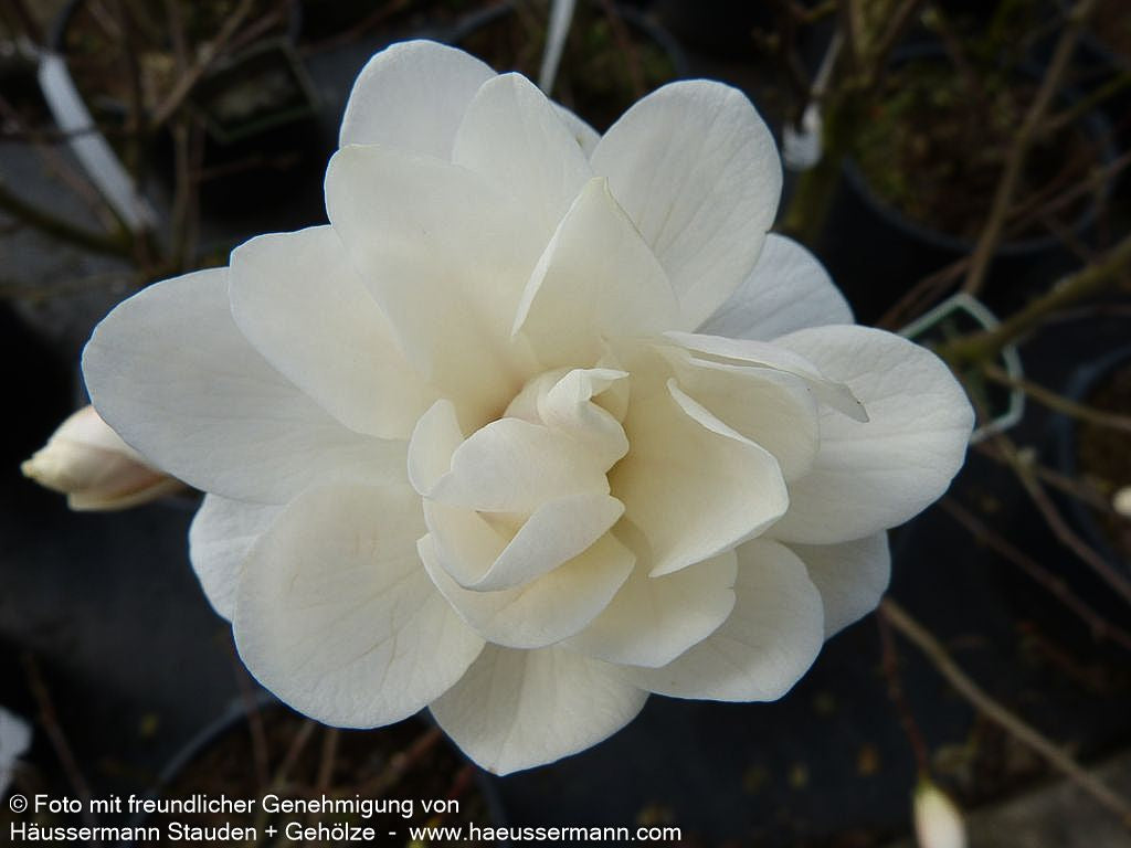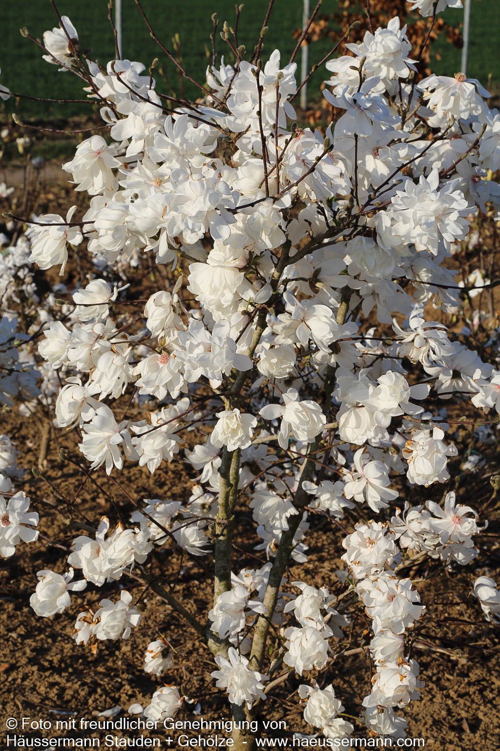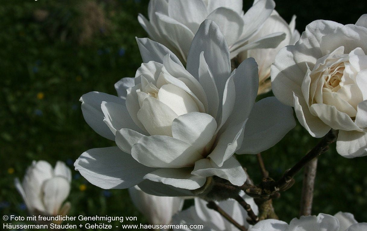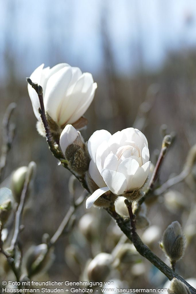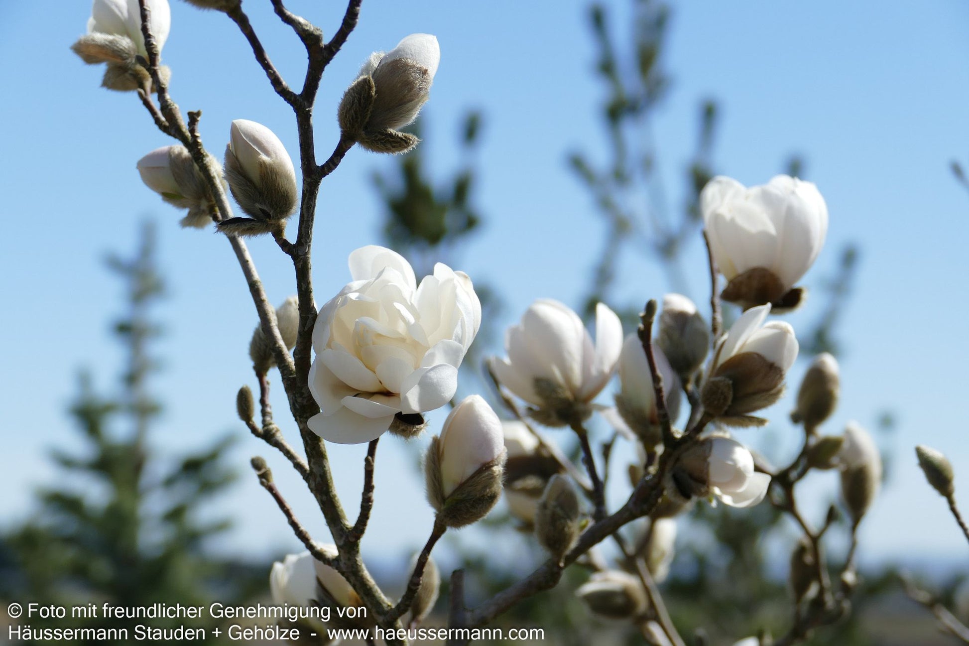 Die Großblütige Stern-Magnolie (Magnolia x loebneri 'Wildcat') ist eine spektakuläre Neuheit unter den Magnolien, die mit ihren dichtgefüllten, weißen Blüten von bis zu 12 cm Durchmesser ein wahres Blütenwunder darstellt. Dieser langsam wachsende, breit aufrecht wachsende Strauch erreicht eine Höhe von 3-4 Metern und gehört zu den Großgehölzen. Von April bis Mai verwandelt sich dieses Laubgehölz in ein beeindruckendes Blütenmeer und bietet als Blütenschmuck einen unvergleichlichen Anblick. Die winterharte Magnolie verträgt Temperaturen bis minus 30 Grad Celsius und gedeiht optimal an sonnigen Standorten mit frischen bis feuchten Böden. Als wertvolles Gartengehölz mit sommergrünem, laubabwerfendem Charakter ist 'Wildcat' eine Bereicherung für jeden anspruchsvollen Garten.