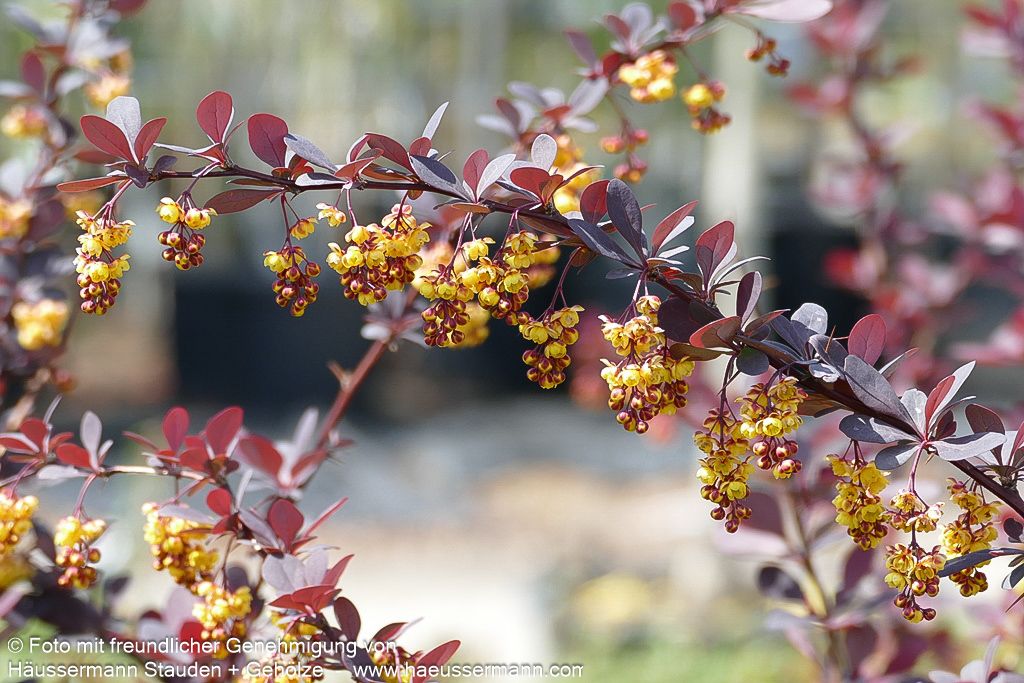 Die Große Blut-Berberitze (Berberis x ottawensis 'Superba') ist ein starkwachsender Strauch, der mit seinem spektakulären dunkelroten Laub zu den wertvollsten Laubgehölzen für den Garten zählt. Dieser breit aufrecht wachsende Strauch erreicht bis zu 4 Meter Höhe und Breite und begeistert im April und Mai mit auffallend gelbroten Blüten. Als mittelhoher Strauch mit besonderer Blattfarbe eignet er sich perfekt für die Einzelstellung oder als imposante Blütenhecke. Das sommergrüne Laub zeigt sich zudem herbstfärbend und sorgt für ganzjährige Attraktivität. Die robuste Berberitze gedeiht sowohl an sonnigen als auch absonnigen Plätzen und kommt mit trockenen bis frischen Böden bestens zurecht.