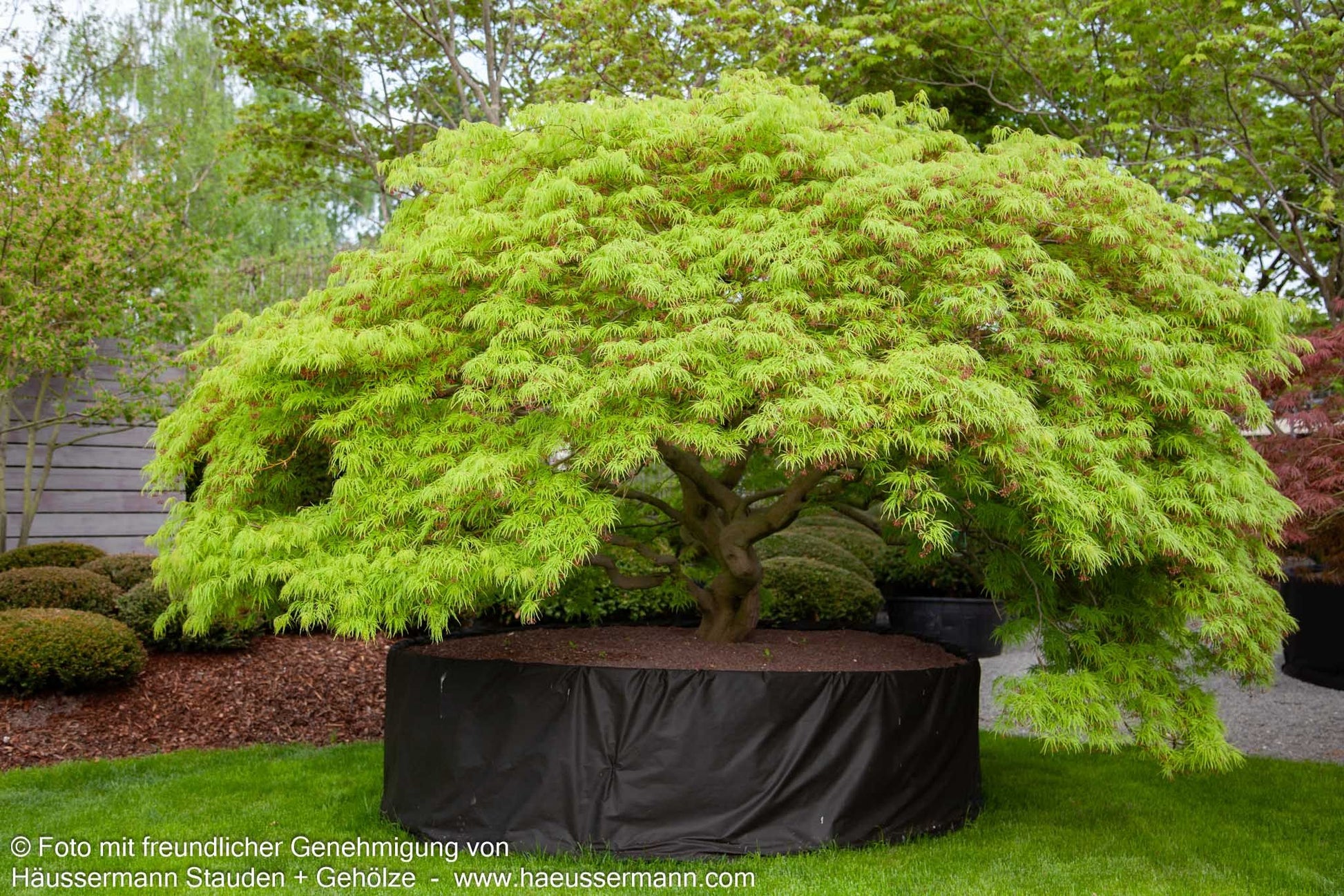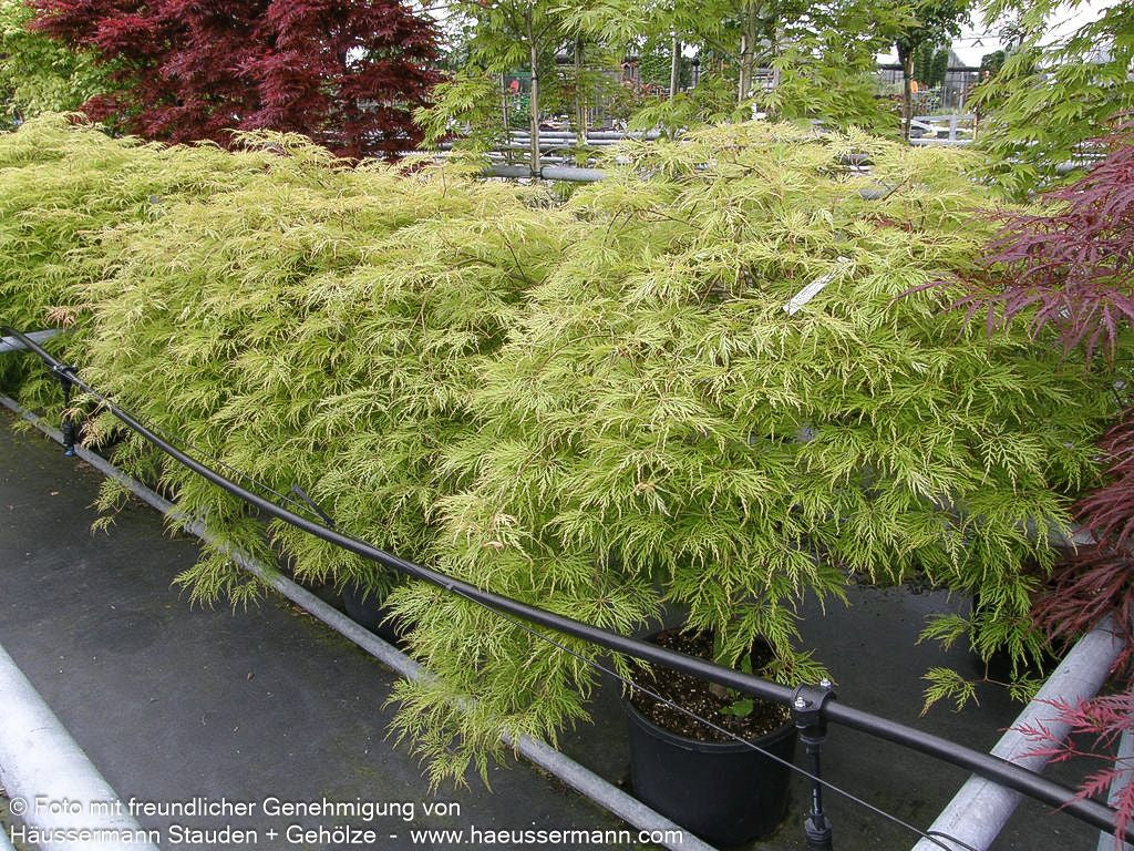 Der Grüne Schlitz-Ahorn (Acer palmatum 'Dissectum') ist ein außergewöhnlicher Japanischer Ahorn mit einer einzigartigen, filigranen Ausstrahlung. Dieser Zierstrauch entwickelt sich langsam zu einem breit ausladenden, flach bis halbkugeligen Strauch von bis zu 2 Metern Höhe und 3 Metern Breite. Seine tiefgeschlitzten, hellgrünen Blätter verleihen ihm eine malerische, bizarre Struktur und schaffen ein faszinierendes Spiel von Licht und Schatten. Im Herbst verwandelt sich das besondere Laub in ein leuchtendes Gelb und macht dieses herbstfärbende Gehölz zu einem wahren Blickfang. Die dezenten Blüten erscheinen von Mai bis Juni. Dieses wertvolle Gartengehölz gedeiht optimal an sonnigen bis halbschattigen Standorten mit frischen bis feuchten Böden und eignet sich perfekt als Solitär, für Grabstätten oder als Kübelpflanze.