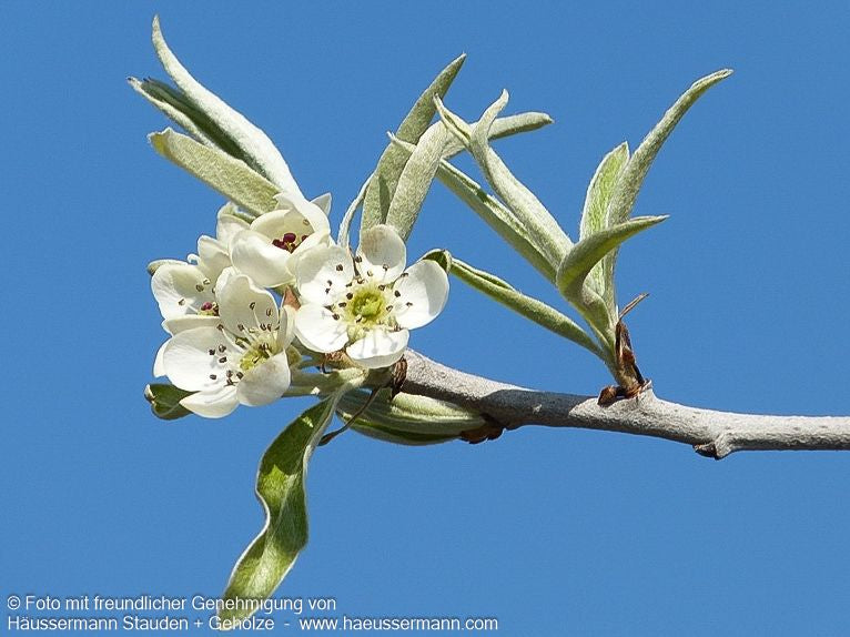 Die Hängende Weidenblatt-Birne (Pyrus salicifolia 'Pendula') ist ein außergewöhnlicher Zierbaum mit malerisch überhängenden Zweigen und silbrig-grauen Blättern, der jeden Garten in eine romantische Oase verwandelt. Dieses sommergrüne Laubgehölz erreicht als Großgehölz eine Höhe von 3-7 Metern und besticht durch seine elegante Hängeform. Von April bis Mai schmückt sich der Baum mit einem zauberhaften weißen Blütenschmuck, gefolgt von einem attraktiven Fruchtschmuck. Die besondere silbrig-graue Blattfarbe macht dieses Gehölz zu einem wahren Blickfang. An einem sonnigen Standort mit trockenen bis frischen Böden gedeiht sie prächtig und dient gleichzeitig als wertvolle Insektennährpflanze und Vogelnährpflanze für die heimische Tierwelt.