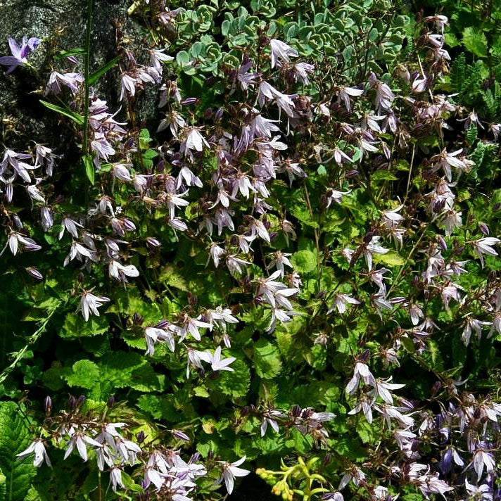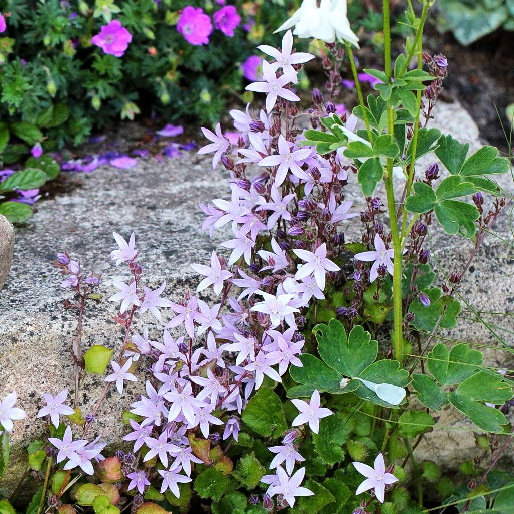 Die Hängepolster-Glockenblume (Campanula poscharskyana 'Lisduggan') verzaubert mit ihren zarten violettrosa, einfachen Blüten, die von Juni bis September unermüdlich erscheinen. Diese robuste Staude wurde als Staude des Jahres 2001 ausgezeichnet und gehört zu den begehrten Sternesorten der deutschen Staudensichtung – ein Qualitätssiegel, das für sich spricht.