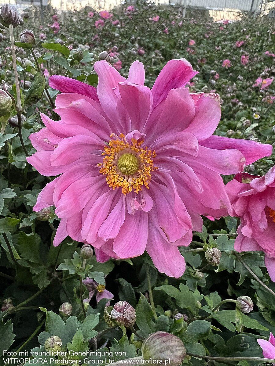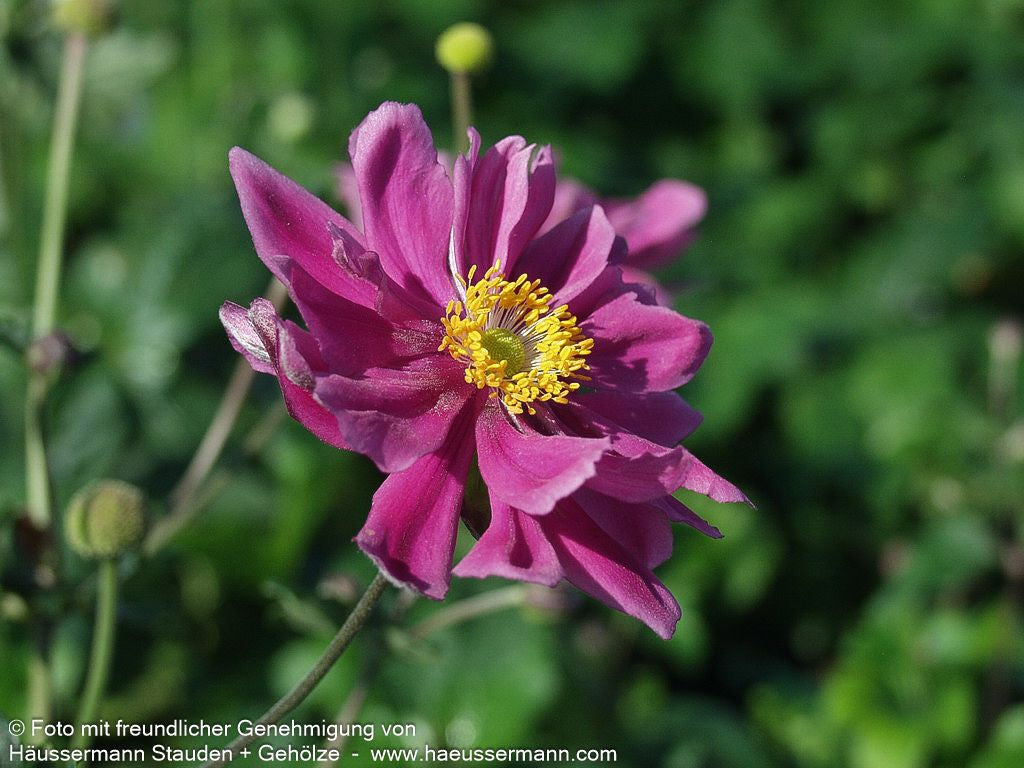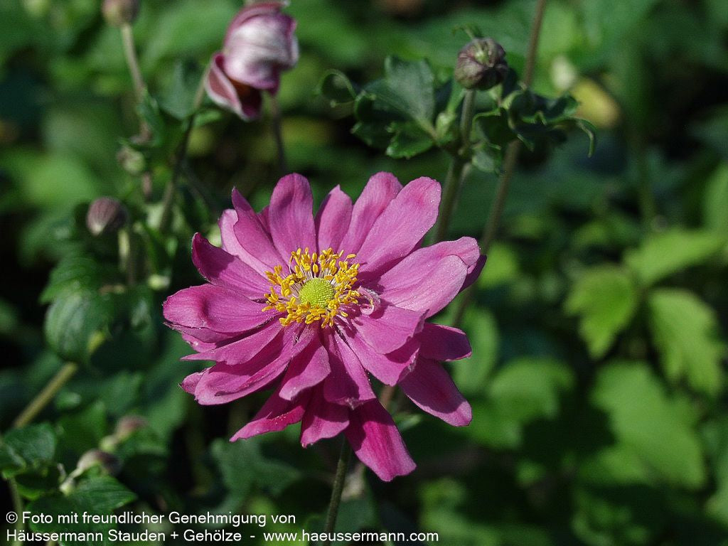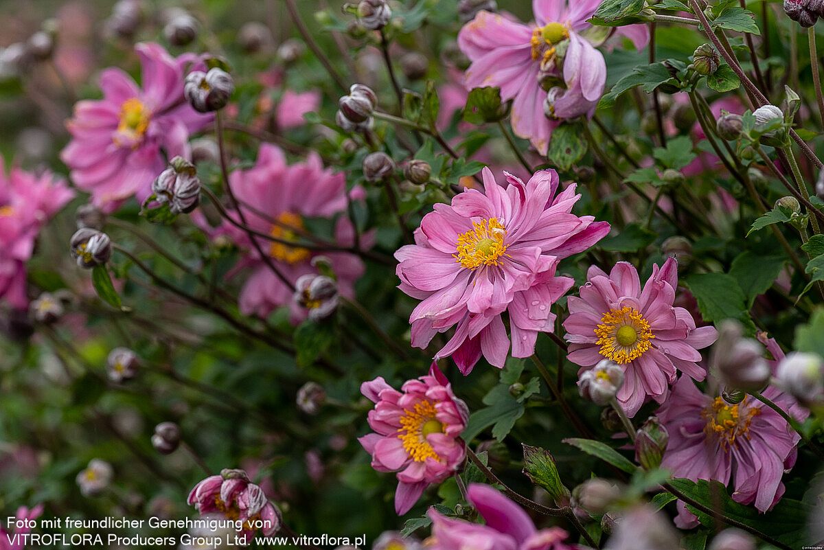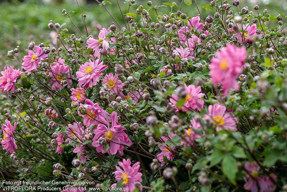 Die Herbst-Anemone (Anemone japonica 'Bressingham Glow') verzaubert mit ihren purpurrosa gefüllten Blüten und wurde nicht ohne Grund zur Staude des Jahres 2005 gekürt. Diese elegante Sternensorte erreicht eine beeindruckende Blütenhöhe von 80 bis 100 cm und blüht von August bis Oktober. Mit ihren tief-grünen, sommergrünen Blättern und der ausladenden Wuchsform gedeiht sie optimal an halbschattigen Standorten mit frischem Boden. Diese winterharte Staude ist perfekt für den Bauerngarten, als Insektennährpflanze und für die Floristik geeignet – ein echter Allrounder für anspruchsvolle Gärtner!