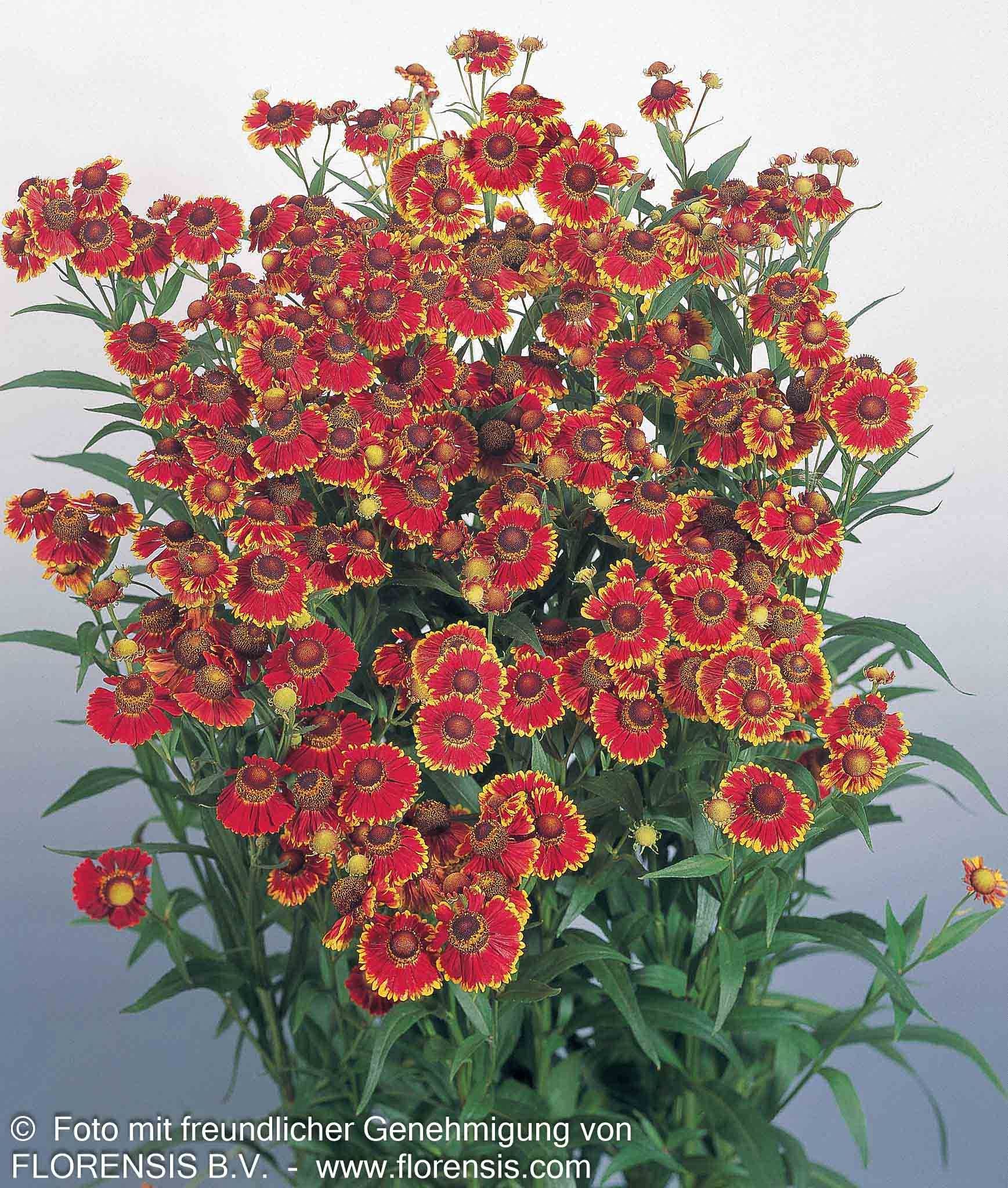 Die Herbst-Sonnenbraut (Helenium autumnale 'Helena Red') verzaubert mit ihren leuchtend roten, einfachen Blüten von August bis Oktober und erreicht dabei eine imposante Höhe von 80 bis 120 cm. Diese prächtige Staude wurde nicht umsonst zur Staude des Jahres 2008 gekürt und begeistert mit ihren tief-grünen, sommergrünen Blättern. An einem sonnigen Standort mit frischem Boden entfaltet diese robuste Züchtung ihre volle Pracht und ist mit ihrer Winterhärte bis -39°C bestens für unsere Breiten geeignet. Als wertvolle Insektennährpflanze ist sie eine Bereicherung für jeden Bauerngarten und sorgt für einen farbenfrohen Herbstabschluss im Staudenbeet.