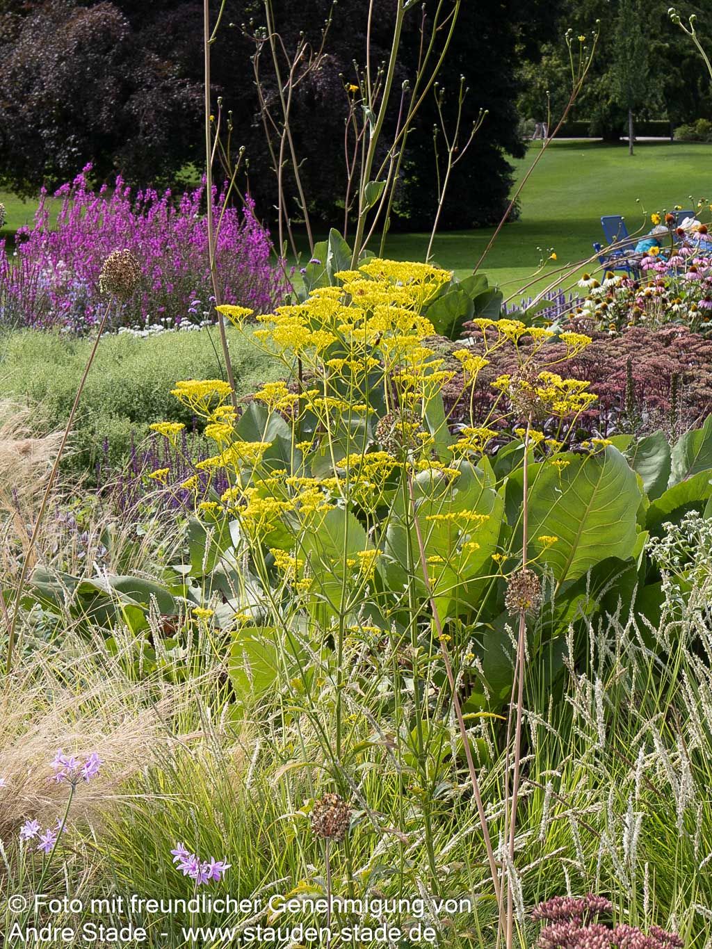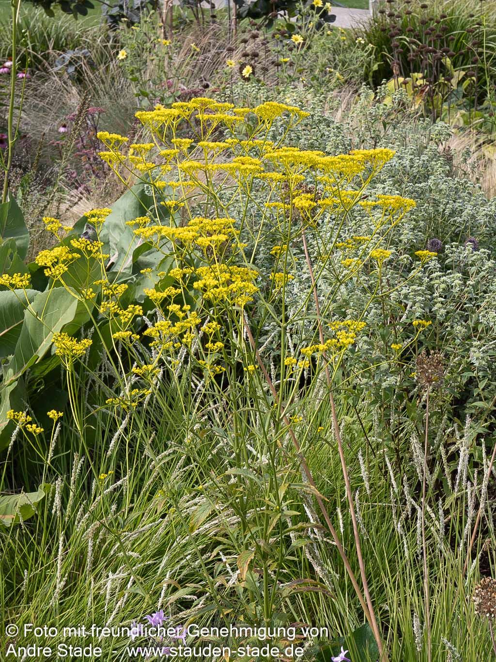 Der Hohe Goldbaldrian (Patrinia scabiosifolia) ist eine außergewöhnliche Staude aus fernen Ländern, die mit ihren goldgelben Trugdolden von Juli bis August begeistert. Diese robuste Wildstaude erreicht eine beeindruckende Höhe von 60-100 cm und entwickelt aufrechte Stängel mit einem grundständigen Blattschopf. Besonders reizvoll sind die grünen Blätter, die im Herbst eine leuchtende Herbstfärbung entwickeln. Der Hohe Goldbaldrian gedeiht optimal an sonnigen Standorten auf frischen, lehmig-humosen Böden und ist winterhart bis -17°C. Als vielseitige Gehölzrandstaude und Freiflächenstaude eignet sie sich hervorragend für Naturgärten, wo sie als Gerüststaude in Gruppen von 3-5 Stück gepflanzt wird.
