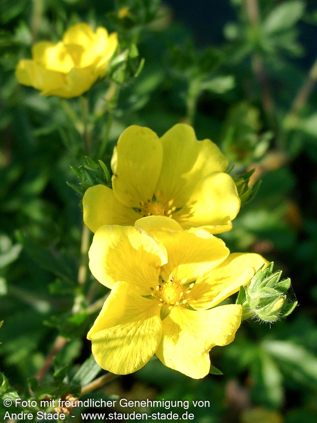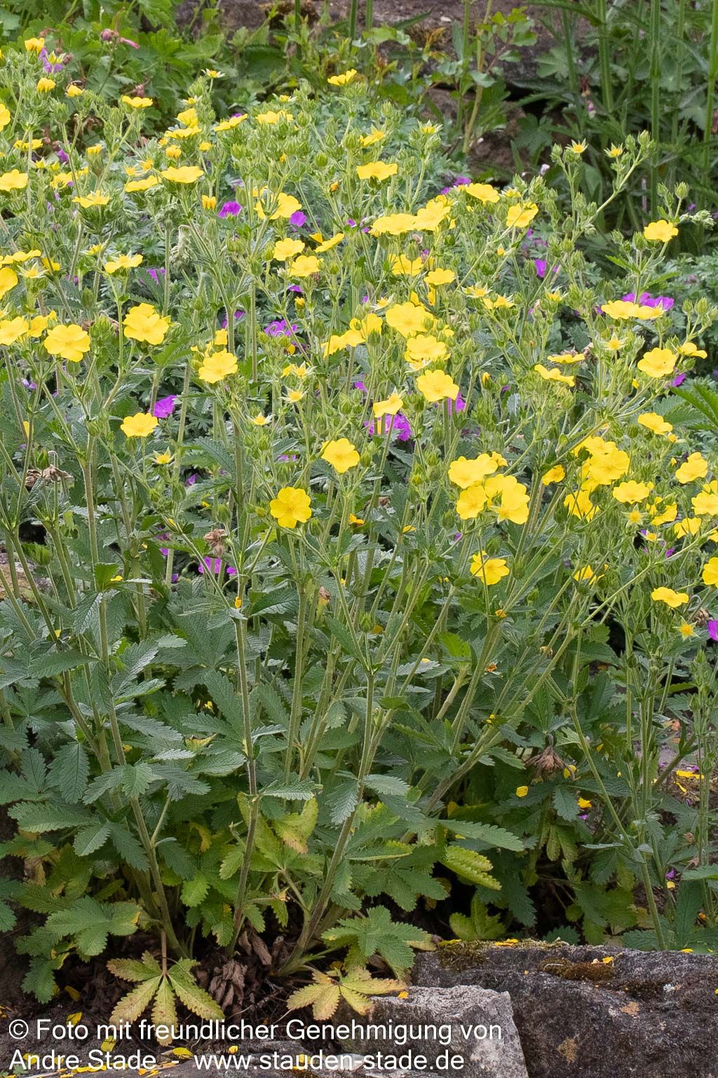 Das Hohe Fingerkraut (Potentilla recta) ist eine robuste heimische Staude, die mit ihren leuchtend hell-gelben, einfachen Blüten von Juni bis August begeistert. Diese pflegeleichte Staude erreicht eine Blütenhöhe von 40 bis 50 cm und entwickelt aufrechte Stängel mit grundständigem Blattschopf. Die attraktiven graugrünen Blätter bilden einen wunderschönen Kontrast zu den strahlenden Blüten. Als wertvolle Insektennährpflanze eignet sich diese sonnige Schönheit perfekt für Freiflächenpflanzungen, Steinanlagen und die Felssteppe. Dank ihrer Vorliebe für trockene Böden und ihrer außergewöhnlichen Winterhärte bis -34°C ist sie eine zuverlässige Bereicherung für jeden naturnahen Garten.