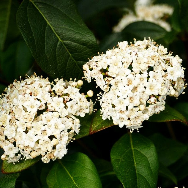 Der Immergrüne Schneeball (Viburnum tinus 'Purpureum') verzaubert Ihren Garten mit einer außergewöhnlich langen Blütezeit von November bis April. Dieser dichtbuschige Strauch entwickelt sich zu einem kompakten mittelhohen Gehölz von bis zu 1,5 m Höhe und Breite mit breit aufrechtem Wuchs. Besonders reizvoll ist der Blütenschmuck: Aus roten Knospen entfalten sich weiße bis weißlichrosa Blüten mit einfacher Füllung. Das wintergrüne Laub zeigt sich in elegantem Dunkelgrün und überrascht mit einem attraktiven roten Austrieb.