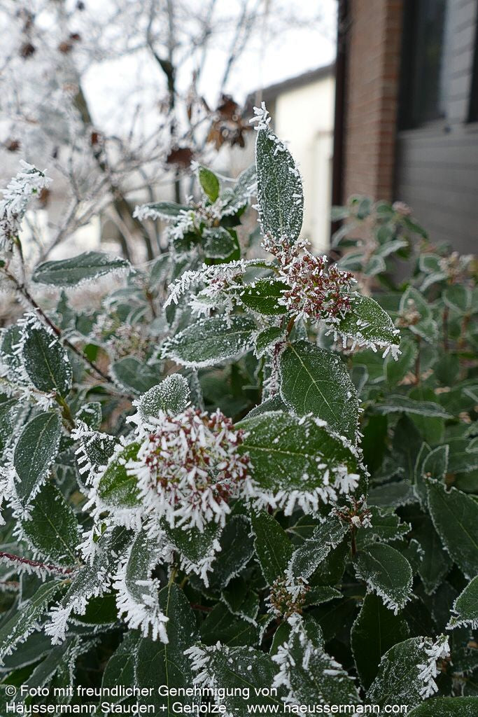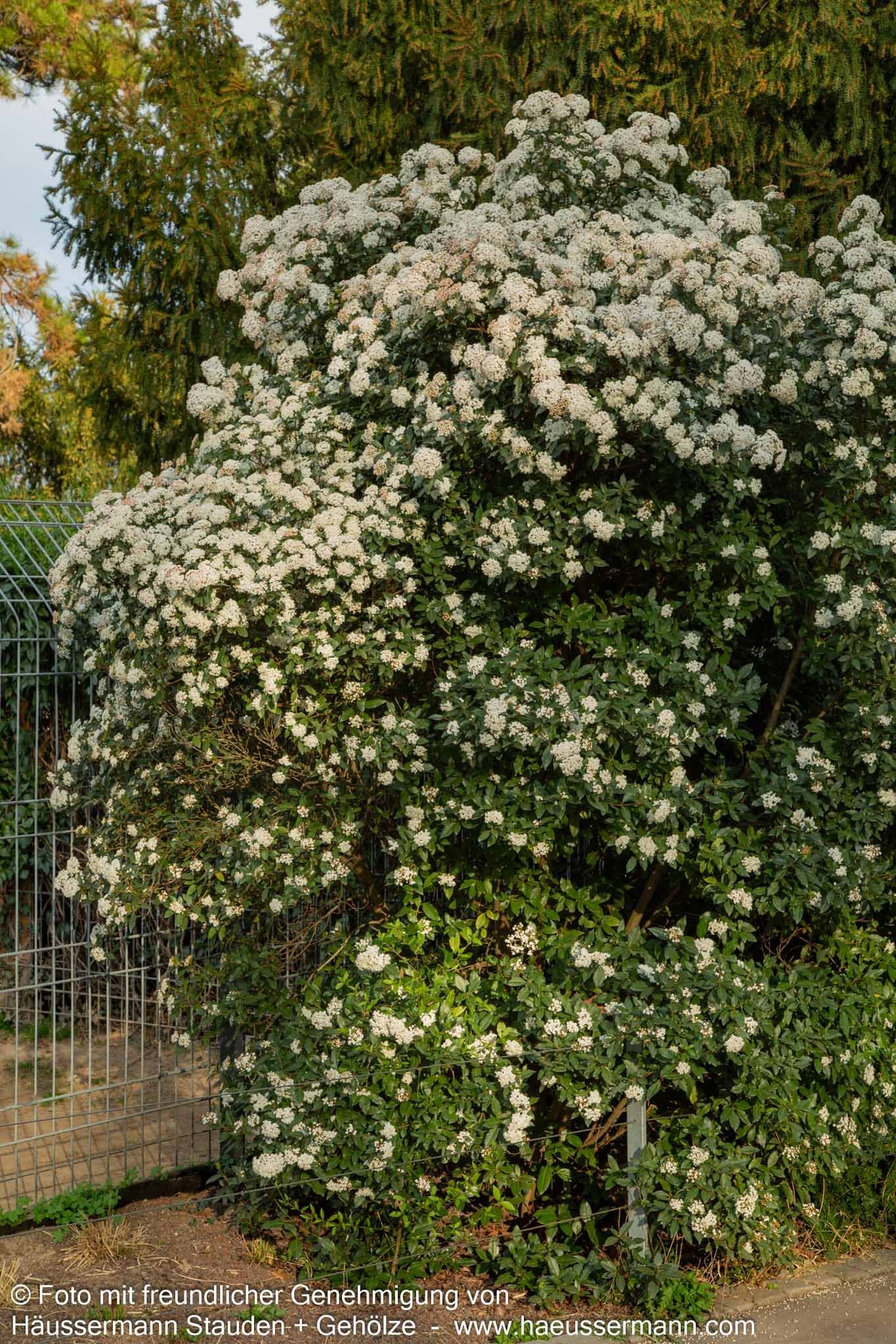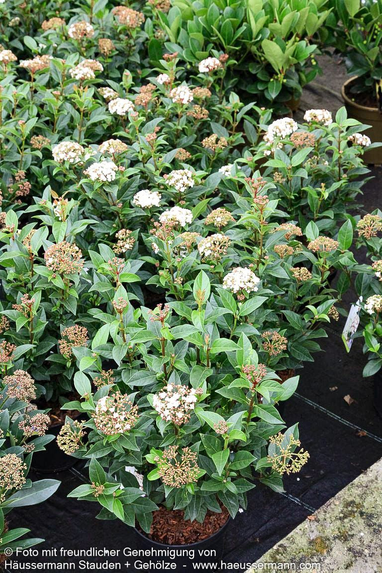 Der Immergrüne Schneeball (Viburnum tinus) ist ein faszinierender Laubstrauch, der mit seiner außergewöhnlich langen Blütezeit von November bis April begeistert. Dieser dichtbuschige, breit aufrecht wachsende Strauch erreicht eine Höhe und Breite von 1,5 bis 2,5 Metern und gehört zu den attraktiven Kleingehölzen. Seine leicht duftenden, rosaweißlichen Blüten sorgen für herrlichen Blütenschmuck in der kalten Jahreszeit. Die wintergrünen, dunkelgrünen Blätter verleihen dem Garten auch außerhalb der Blütezeit Struktur. Viburnum tinus gedeiht optimal an sonnigen bis halbschattigen und absonnigen Standorten mit frischen Bodenverhältnissen und bevorzugt milde Lagen.