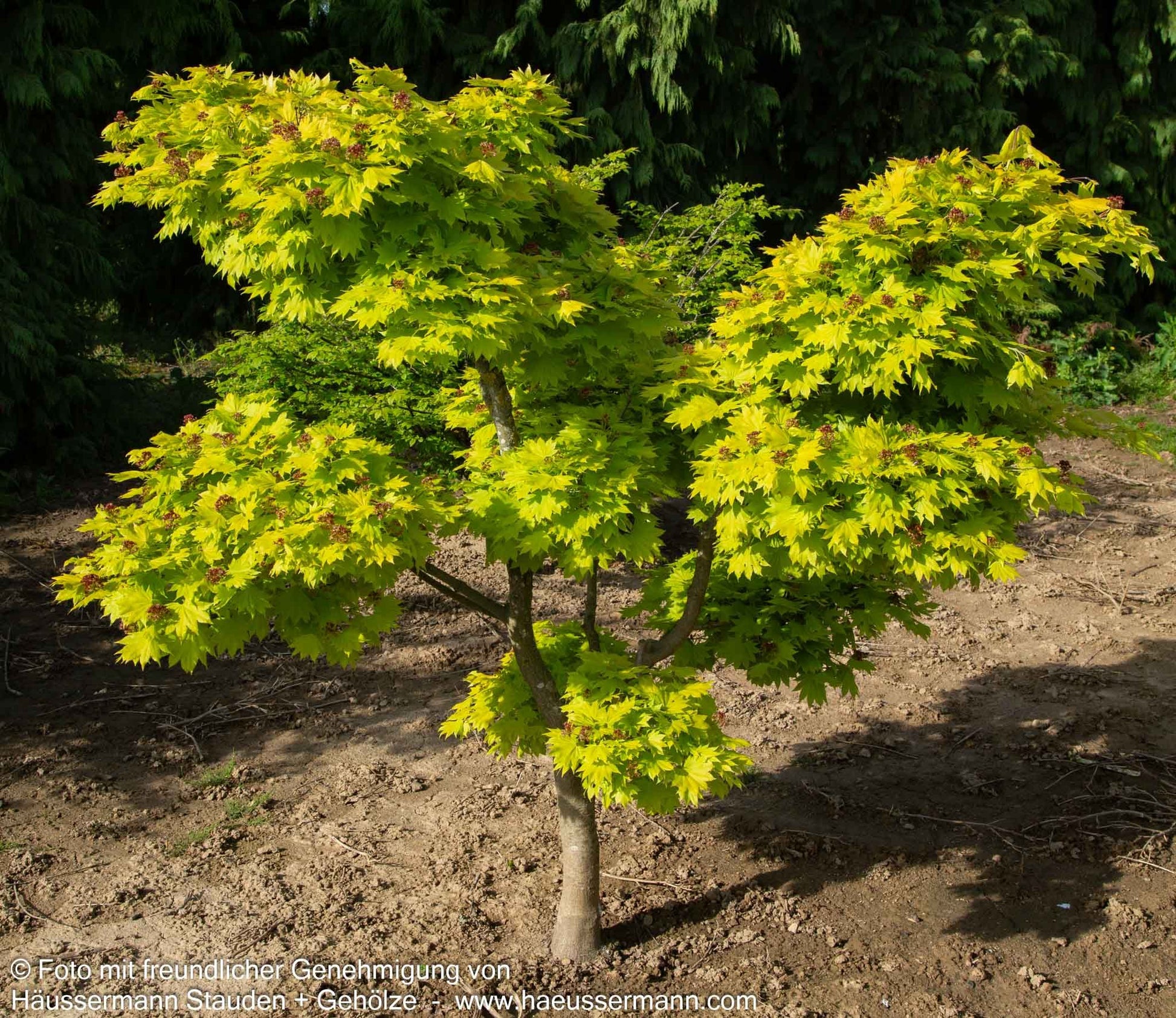 Der Japanische Gold-Ahorn (Acer shirasawanum 'Aureum') ist eine außergewöhnliche Rarität für anspruchsvolle Gartenliebhaber. Dieser mittelhohe Zierstrauch besticht durch seine leuchtend hellgelben Blätter im Austrieb, die sich im Herbst in ein faszinierendes Spektrum von gelb bis orangerötlich verwandeln. Mit seiner breit aufrechten und malerisch bizarren Wuchsform erreicht er eine Höhe von bis zu 2,5 Metern. Als wertvolles Gartengehölz unter den Japanischen Ahornen gedeiht er optimal an halbschattigen bis wechselsonnigen oder absonnigen Standorten mit frischen bis feuchten Böden. Die besondere Blattform und die spektakuläre Herbstfärbung machen diesen Zierstrauch zu einem echten Blickfang in jedem geschützten Garten.