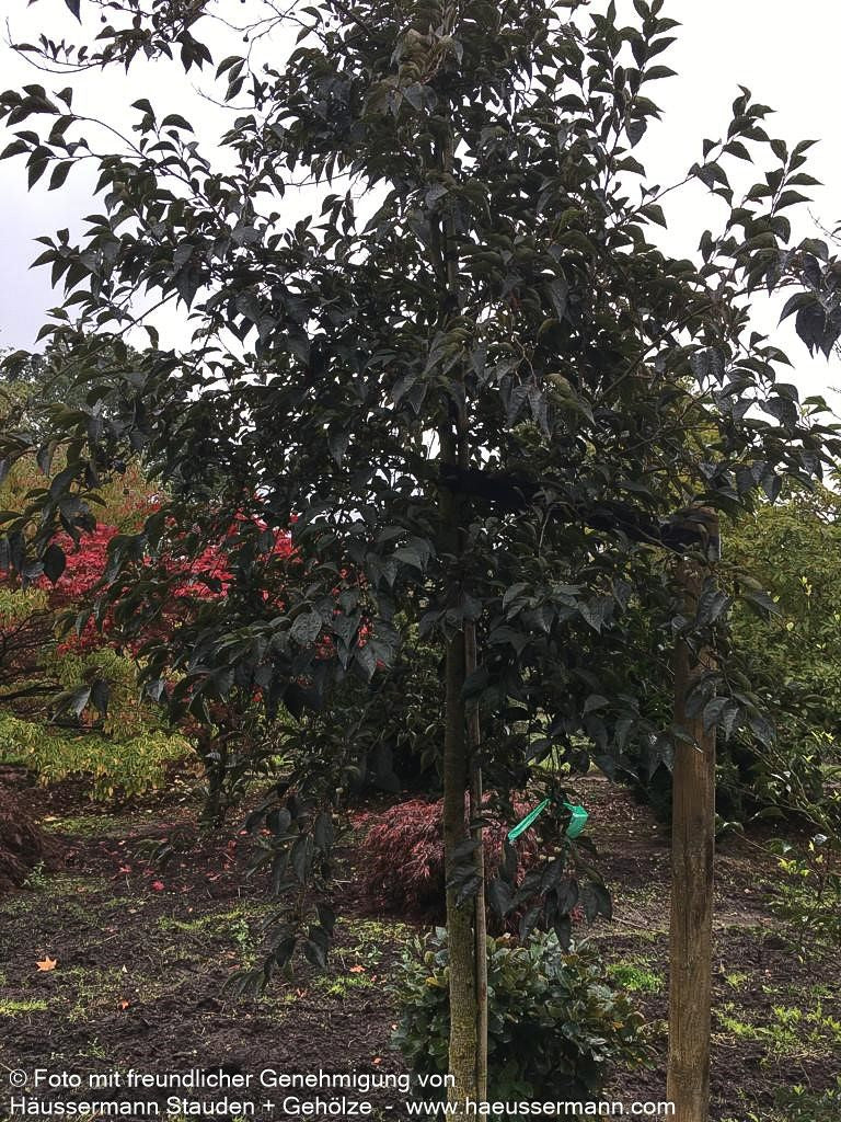 Der Japanische Storaxbaum (Styrax japonicus 'Evening Light') ist ein außergewöhnliches Laubgehölz, das durch seine spektakulären Kontraste verzaubert. Dieser mittelhohe Großstrauch wächst breit aufrecht und erreicht eine kompakte Höhe von 2-3 Metern. Im Juni und Juli entfaltet sich ein atemberaubender Blütenschmuck: Zahlreiche große, weiße einfache Blüten mit leuchtend gelben Staubgefäßen hängen elegant an langen Stielen und bilden einen faszinierenden Kontrast zu den schwarzgrünen bis schwarzroten Blättern. Dieses sommergrüne Gehölz gedeiht optimal an absonnigen Standorten auf frischem Boden und ist bis -20°C winterhart. Als eines der wertvollsten Gartengehölze verleiht diese fremdländische Rarität jedem Garten eine edle, unverwechselbare Ausstrahlung.