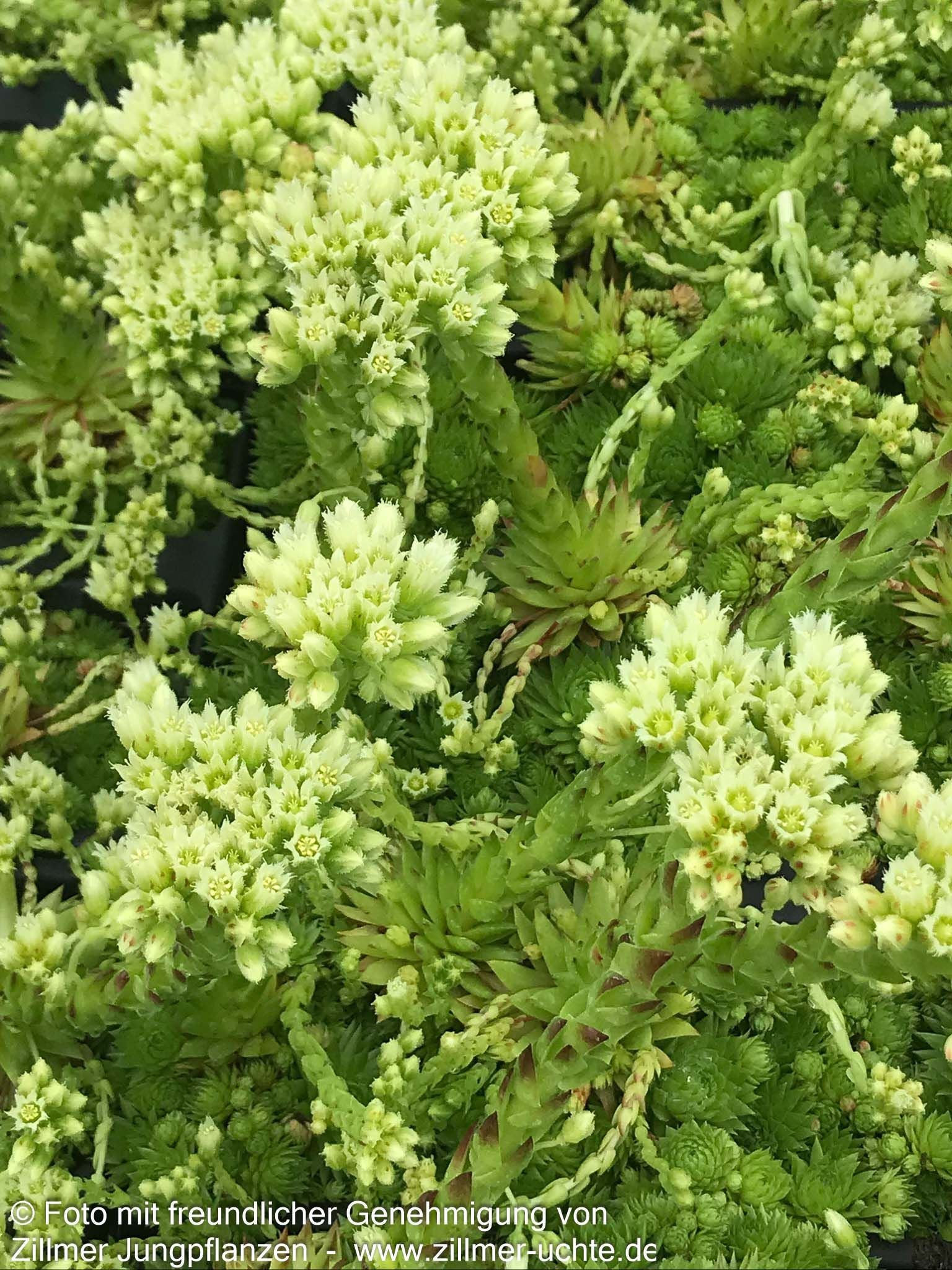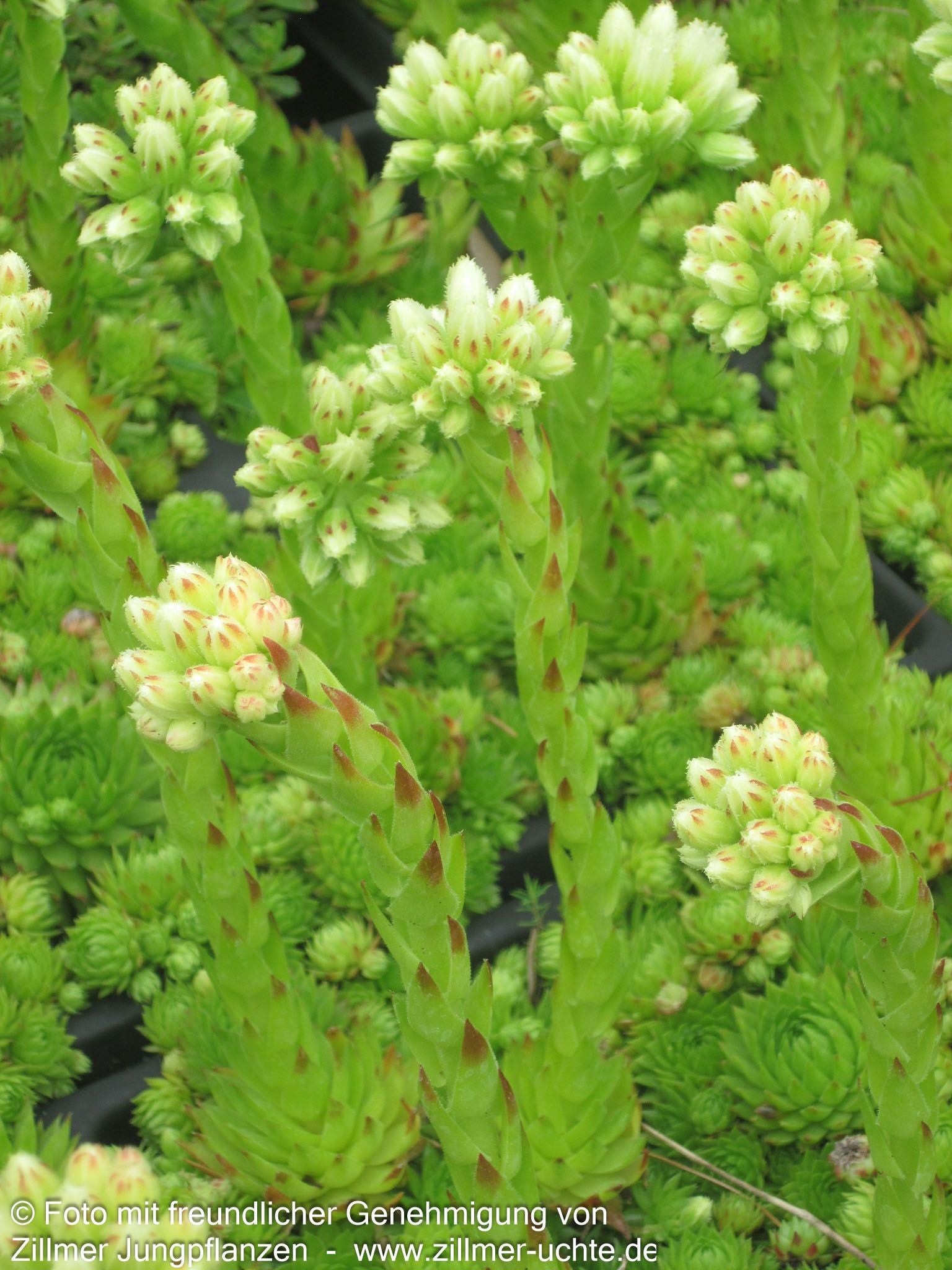 Der Jupiterbart (Jovibarba globifera ssp. globifera) ist eine bezaubernde heimische Staude, die mit ihrer rosettenartigen und polsterbildenden Wuchsform jeden Steingarten bereichert. Diese robuste Sukkulente entwickelt von Juni bis August grünlichweiße, einfache Blüten, die bis zu 15 cm hoch werden und als wertvolle Insektennährpflanze dienen. Das hell-grüne, wintergrüne Blattwerk erreicht eine kompakte Höhe von 3-5 cm und bleibt das ganze Jahr über attraktiv. Dank ihrer Winterhärtezone Z5 übersteht sie problemlos Temperaturen bis -28°C. Der Jupiterbart gedeiht optimal an sonnigen Standorten mit trockenen Böden und eignet sich hervorragend für Steinfugen, Mauerkronen und das Alpinum. Als Gerüststaude pflanzen Sie am besten 3-5 Stück pro Tuff mit einem Abstand von 10-20 cm. Diese vielseitige Staude ist auch ideal für die extensive Dachbegrünung geeignet.