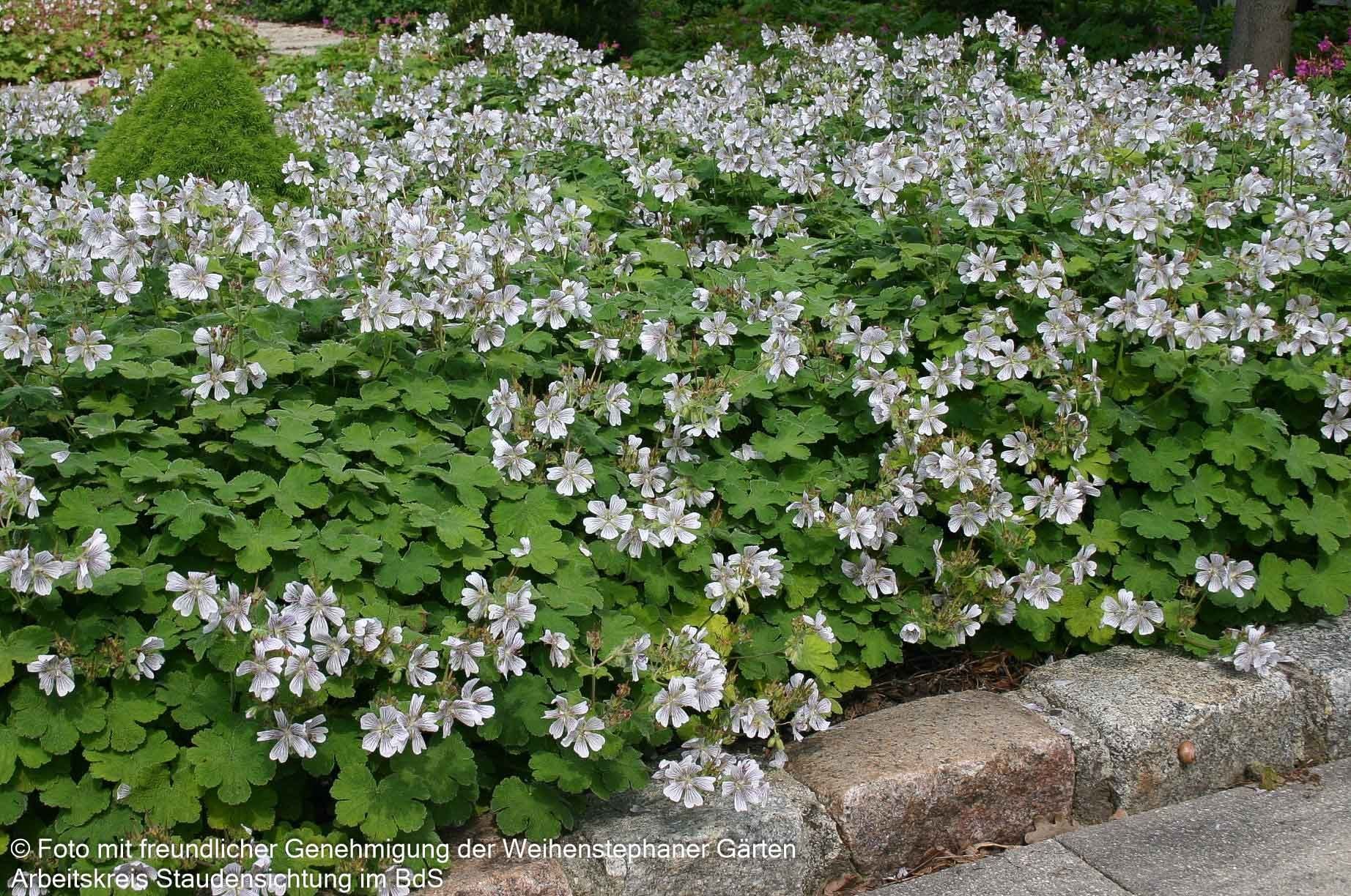 Der Kaukasus-Storchschnabel (Geranium renardii) ist eine außergewöhnliche Staude mit charakteristischen graugrünen Blättern und bezaubernden weißen, einfachen Blüten, die von Juni bis Juli erscheinen. Diese preisgekrönte Sternensorte der deutschen Staudensichtung wurde 2004 zur Staude des Jahres gekürt und überzeugt mit ihrer kissenartigen Wuchsform. Der robuste Storchschnabel gedeiht perfekt an sonnigen Standorten auf trockenen bis frischen Böden und eignet sich hervorragend für Steinanlagen, Felssteppen und als kleinflächiger Bodendecker. Mit seiner außergewöhnlichen Winterhärte bis -28°C und dem rhizombildenden Wuchsverhalten ist diese 20-25 cm hohe Staude eine Bereicherung für jeden Steingarten.
