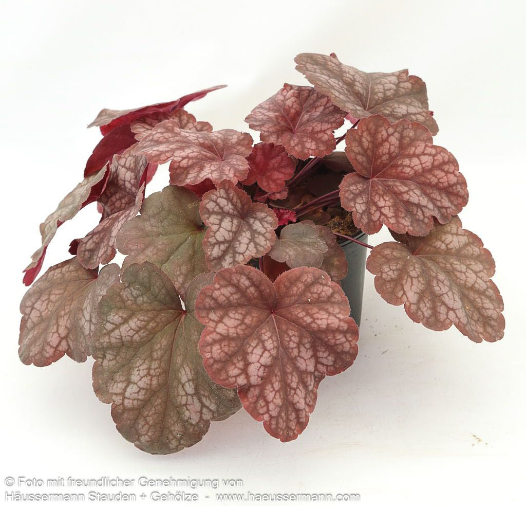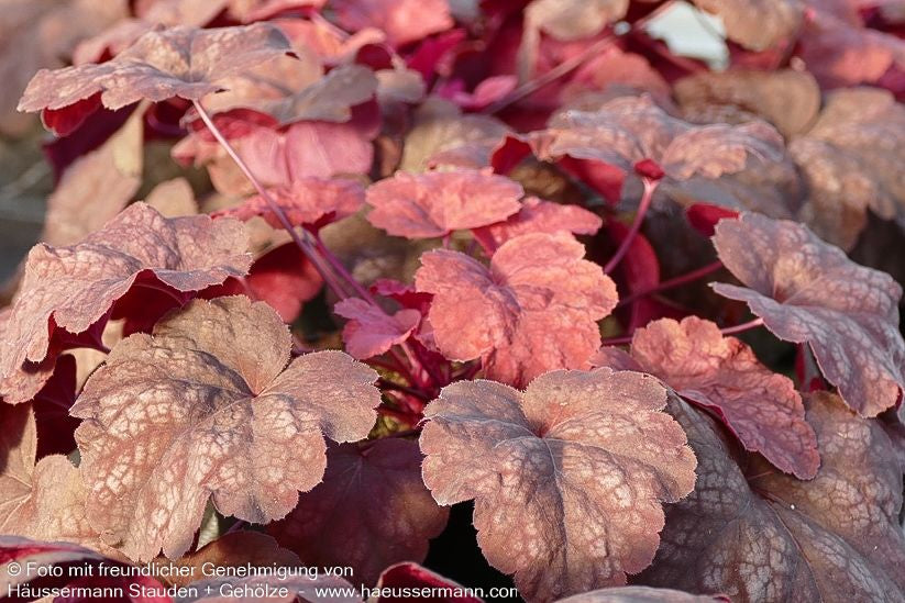 Das Kleinblütige Silberglöckchen Heuchera micrantha 'Amber Lady' ist eine außergewöhnliche Staude, die mit ihrem großen mattrosa-orangefarbenen Laub und der zarten rotbraunen Zeichnung jeden Garten zum Leuchten bringt. Diese wintergrüne Züchtung entwickelt von Juni bis Juli cremeweiße, einfache Blüten auf 40 cm hohen Stielen und eignet sich perfekt als Gehölzrandstaude oder Beetstaude. An halbschattigen, wechselsonnigen Standorten mit frischem Boden entfaltet diese wintergrüne Schönheit ihre volle Pracht. Als Gerüststaude gepflanzt in Gruppen von 3-5 Stück harmoniert sie besonders schön mit Rhododendron und anderen Gehölzen.
