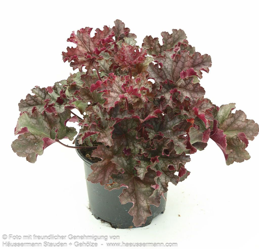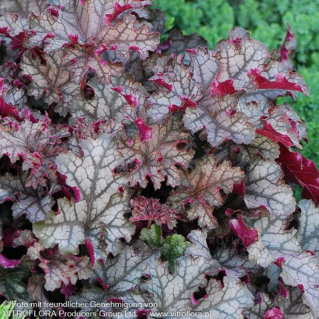 Das Kleinblütige Silberglöckchen (Heuchera micrantha 'Can Can') ist eine spektakuläre Blattschmuckstaude, die mit ihren herzförmigen, violettroten Blättern und der stark gewellten Blattstruktur jeden Garten bereichert. Diese Sternensorte entwickelt eine halbkugelige Wuchsform und erreicht eine Blattwerkhöhe von 10-20 cm. Von Mai bis August erscheinen die zarten rosa Blüten in 40-60 cm Höhe und locken als Insektennährpflanze zahlreiche Bestäuber an. Das wintergrüne Laub sorgt auch in der kalten Jahreszeit für Struktur im Garten. Diese robuste Staude gedeiht optimal an halbschattigen Standorten mit frischen Böden und ist bis -22°C winterhart. Als Gehölzrandstaude harmoniert sie perfekt mit Rhododendren und anderen Gehölzen.