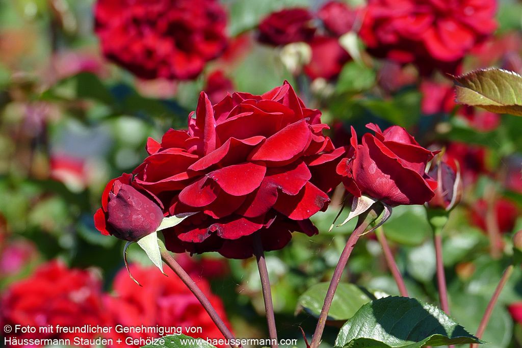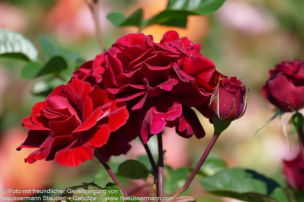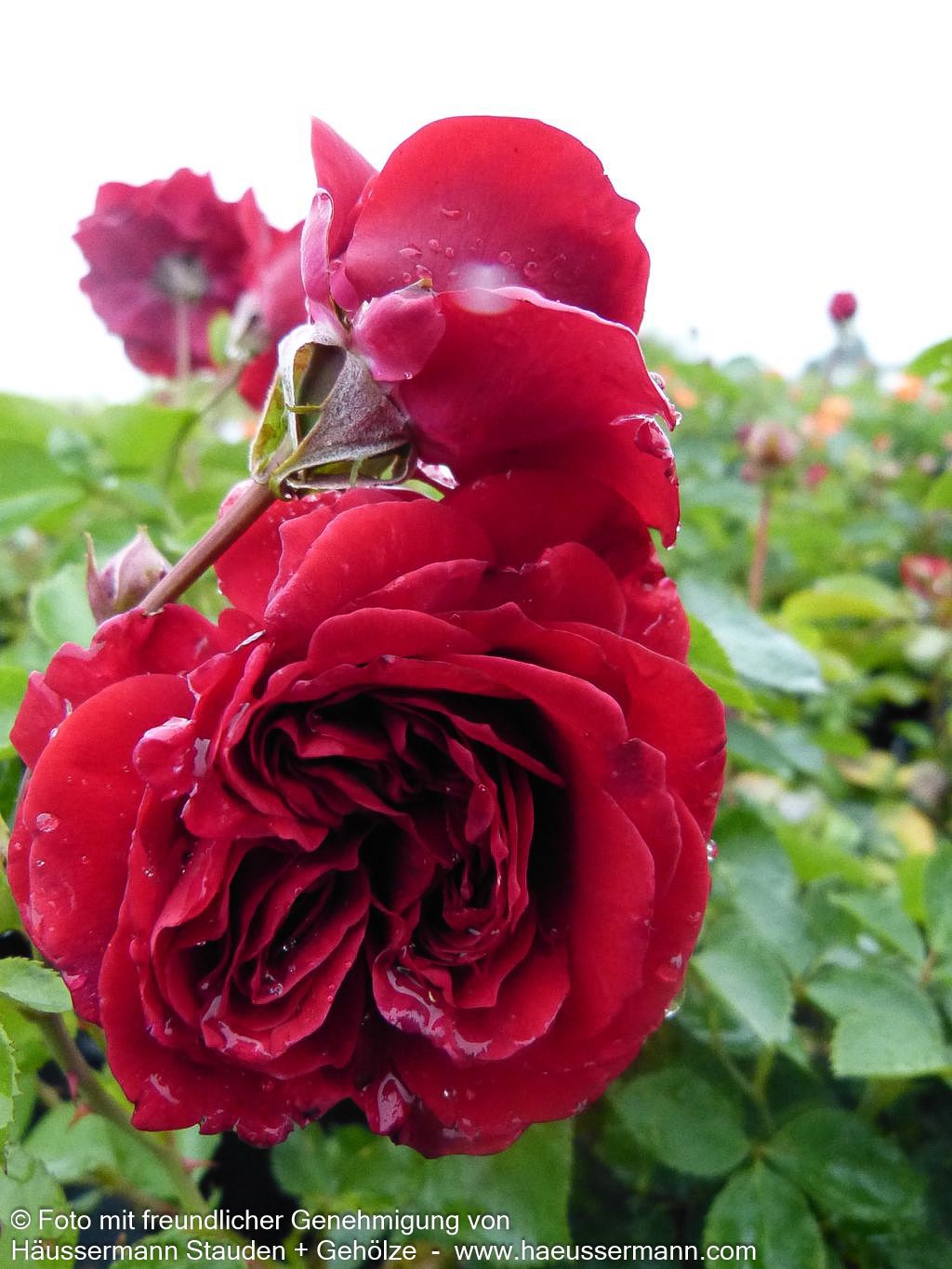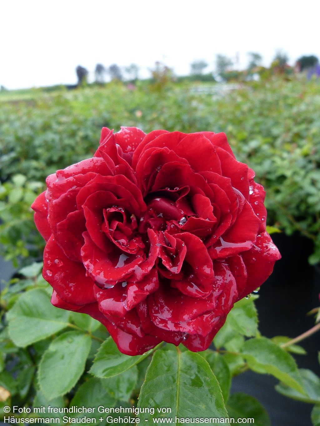 Die Kletterrose 'Naheglut' (Rosa 'Naheglut' KL IV) verzaubert von Juni bis zum ersten Frost mit ihren mittelgroßen, dicht gefüllten Blüten in samtiger dunkelroter Farbpracht. Diese beeindruckende Kletterrose erreicht an einer Rankhilfe eine majestätische Höhe von 250-350 cm und verströmt dabei einen zarten, angenehm leichten Duft. Mit ihrer langen Blütezeit von Juli über August und September bis in den Oktober hinein ist sie ein wahres Highlight für jeden Rosengarten. Die robuste Laubgehölz-Rose zeigt gute bis mäßige Mehltauresistenz sowie gute bis mäßige Rußtauresistenz und gedeiht optimal an einem sonnigen, warmen Standort.