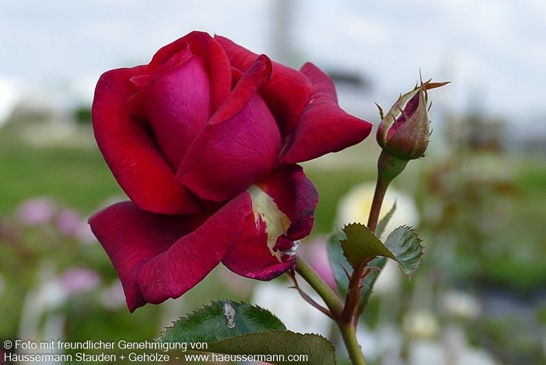 Die Kletterrose 'Red Flame' -R- (Rosa 'Red Flame' KL VI) verzaubert mit ihren gefüllten edelrosenartigen Blüten in samtigem Dunkelrot und einem intensiven fruchtigen Himbeerduft. Diese außergewöhnlich blühwillige Kletterrose erfreut Sie mit ihrer prächtigen roten Blütenfülle von Juni über Juli, August und September bis in den Oktober hinein. Mit einer Wuchshöhe von 200-300 cm an einer Rankhilfe und ihrer buschigen, gut verzweigten Wuchsform ist diese Laubgehölz-Rose ideal für Pergolen und Zäune. Besonders überzeugt die stark duftende 'Red Flame' durch ihre ausgezeichnete Blattgesundheit mit guter Mehltauresistenz und guter Rußtauresistenz.