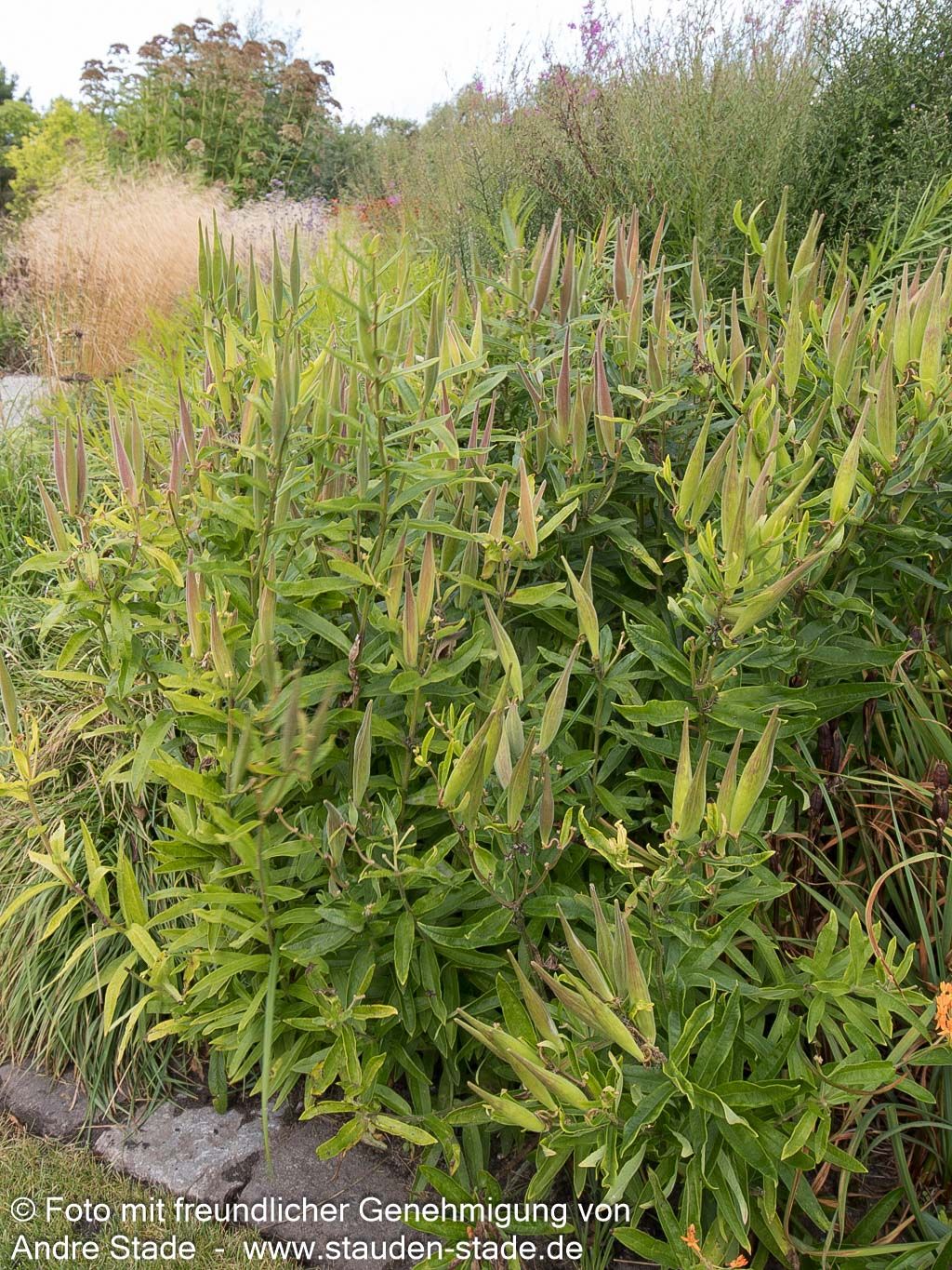 Die Knollige Seidenpflanze (Asclepias tuberosa) ist eine außergewöhnliche Staude mit leuchtend orangegelben Blüten, die von Juni bis August eine wahre Farbexplosion in Ihren Garten bringt. Diese robuste Freiflächenstaude erreicht eine imposante Blütenhöhe von 50 bis 100 cm und gedeiht optimal an sonnigen Standorten mit trockenen Böden. Als wertvolle Insektennährpflanze lockt sie Schmetterlinge und Bienen magisch an, während ihre einfachen Blüten sich hervorragend für Schnittzwecke eignen. Die sommergrünen Blätter bilden einen schönen Kontrast zu den strahlenden Blüten, und im Herbst entwickelt diese Heilpflanze einen attraktiven Fruchtschmuck. Mit ihrer Winterhärte bis -11°C ist sie eine Bereicherung für jeden naturnahen Garten.