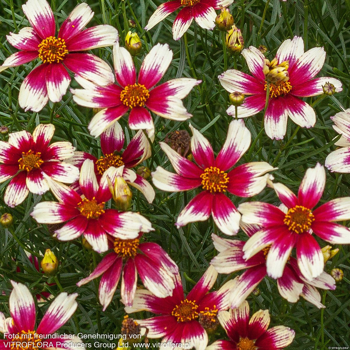 Das Kompakte Mädchenauge (Coreopsis verticillata 'Sunstar Rose') verzaubert mit seiner außergewöhnlichen weinroten Blütenpracht mit weißen Spitzen von Juni bis September. Diese kompakte Staude erreicht eine Höhe von 30-35 cm und präsentiert ihre leuchtenden Blüten über hell-grünem, sommergrünem Laub. Als vielseitige Beetstaude eignet sie sich hervorragend für Freiflächen und Steinanlagen. Der sonnige Standort und frische bis feuchte Böden lassen diese robuste Schönheit optimal gedeihen. Als Leitstaude setzt sie markante Akzente und bereichert jeden Garten mit ihrer langanhaltenden Blütezeit.