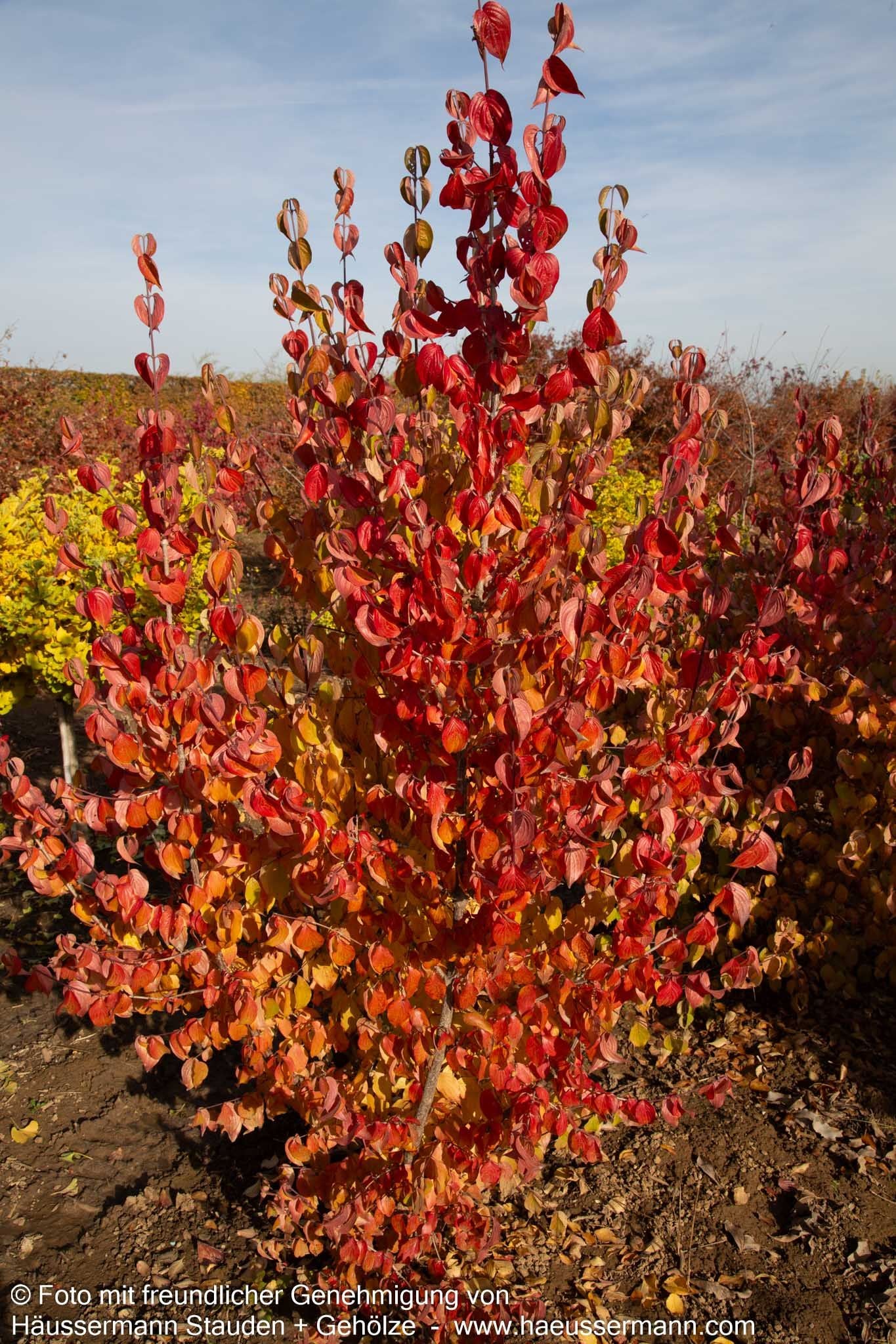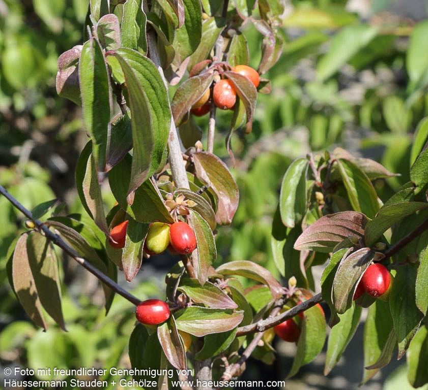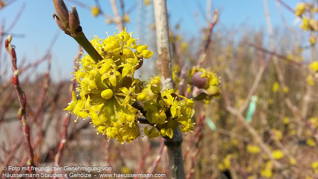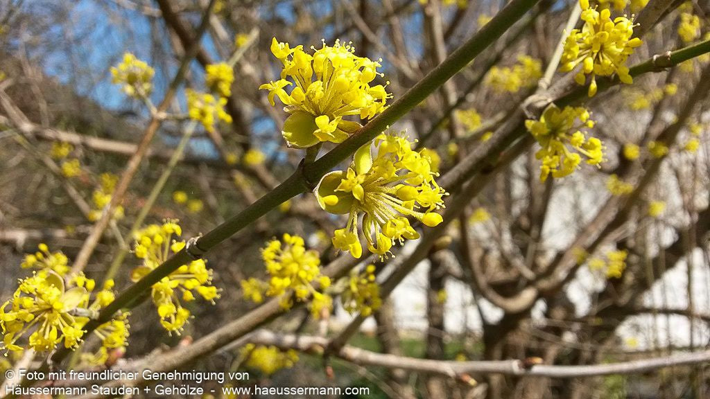 Die Kornelkirsche (Cornus mas) ist ein wertvolles heimisches Wildgehölz, das als sparrig verzweigter Großstrauch eine Höhe von 5-7 Metern erreicht und mit seiner breit aufrechten Wuchsform beeindruckt. Bereits im März und April zeigt dieses sommergrüne Laubgehölz seinen spektakulären Blütenschmuck mit leuchtend gelben, kugeligen Doldenblüten, die als wichtige Insektennährpflanze frühe Nahrung für Bienen bieten. Im August entwickeln sich aus den Blüten 2 cm große, eiförmige rote Früchte, die nicht nur einen attraktiven Fruchtschmuck darstellen, sondern auch roh genießbar sind oder zu köstlicher Marmelade und Likör verarbeitet werden können. Dieses anspruchslose naturnahe Wildgehölz gedeiht an sonnigen, halbschattigen bis absonnigen Standorten und toleriert sowohl trockene als auch frische bis feuchte Böden. Als robustes Großgehölz eignet sich die Kornelkirsche hervorragend für hochwachsende Hecken und bereichert jeden Garten mit ihrer außergewöhnlichen Hitze- und Trockenheitstoleranz.
