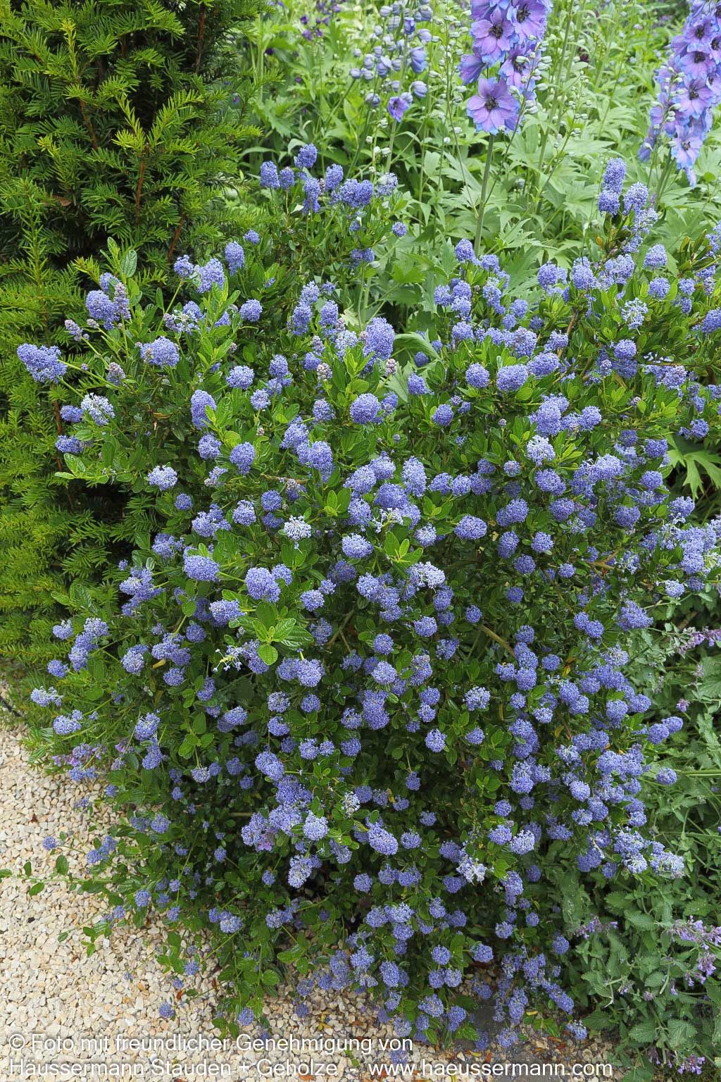 Die Kriechende Säckelblume (Ceanothus thyrsiflorus repens) ist ein bezaubernder bodendeckender Strauch, der mit seinem glänzenden, wintergrünen Laub und den zahlreichen violettblauen Blüten von Juni bis August jeden Garten bereichert. Dieses Laubgehölz erreicht eine kompakte Größe von bis zu einem Meter in Höhe und Breite und wächst dabei breit ausladend. Als Kleingehölz eignet sich diese Pflanze perfekt für geschützte Lagen in sonnigen Bereichen mit frischen Böden. Die spektakuläre violettblaue Blütenpracht in den Sommermonaten Juni, Juli und August macht sie zu einem wertvollen Blütenschmuck und die blauen Blütenstände ziehen Bienen und Schmetterlinge magisch an.