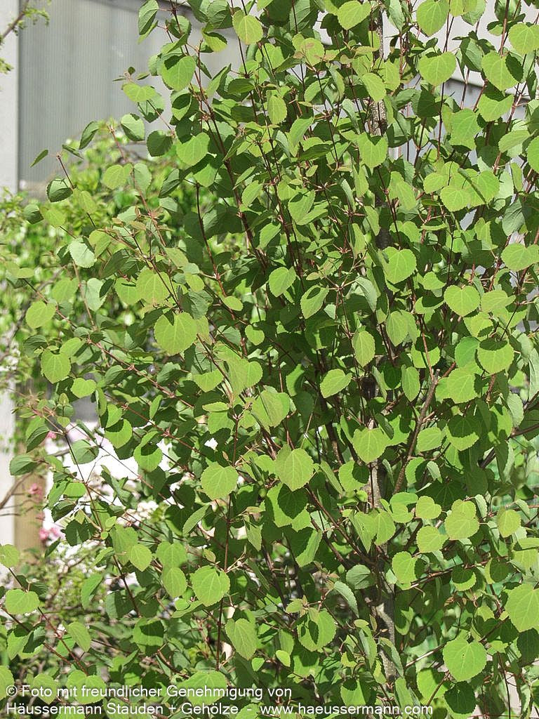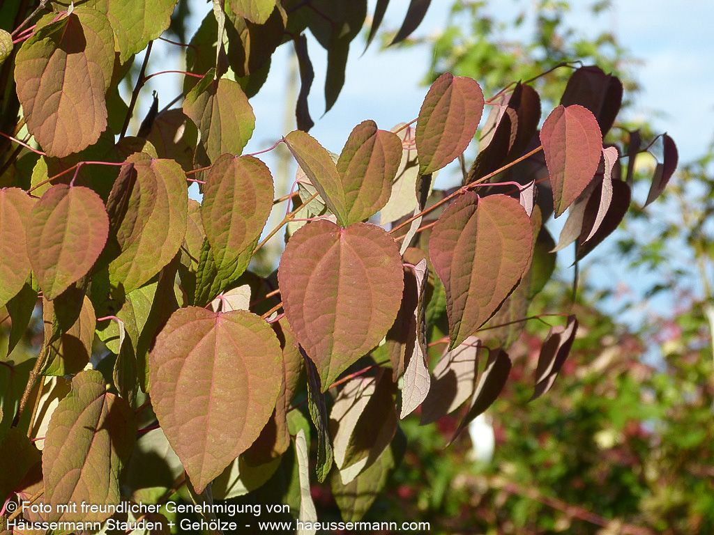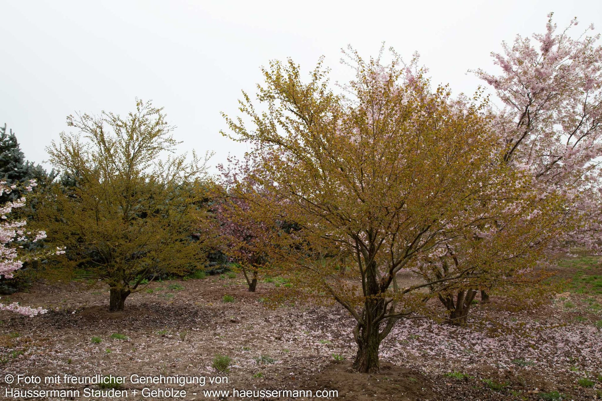 Der Kuchenbaum (Cercidiphyllum japonicum) ist ein außergewöhnlicher Kleinbaum, der Ihren Garten mit einem wahren Sinneserlebnis bereichert. Dieser oft mehrstämmige Baum erreicht eine Höhe von 8-10 Metern und begeistert mit seiner schmal aufrechten, kegelförmigen Wuchsform. Besonders faszinierend sind die Blätter, die rötlich austreiben, sich zu einem frischen Grün entwickeln und im Herbst in ein spektakuläres Goldgelb bis Rot verwandeln - ein echtes herbstfärbendes Highlight mit besonderer Blattform. Das Besondere: Das Fallaub verströmt einen betörenden Duft nach Zimt und Karamel, der dem Baum seinen Namen verleiht. Die kleinen purpurroten Blüten erscheinen im April vor dem Laubaustrieb an älteren Exemplaren. Als sommergrünes Laubgehölz bevorzugt dieser Kleinbaum einen sonnigen Standort mit frischen Bodenverhältnissen und ist eine perfekte Wahl für alle, die ein Laubgehölz mit Charakter suchen.