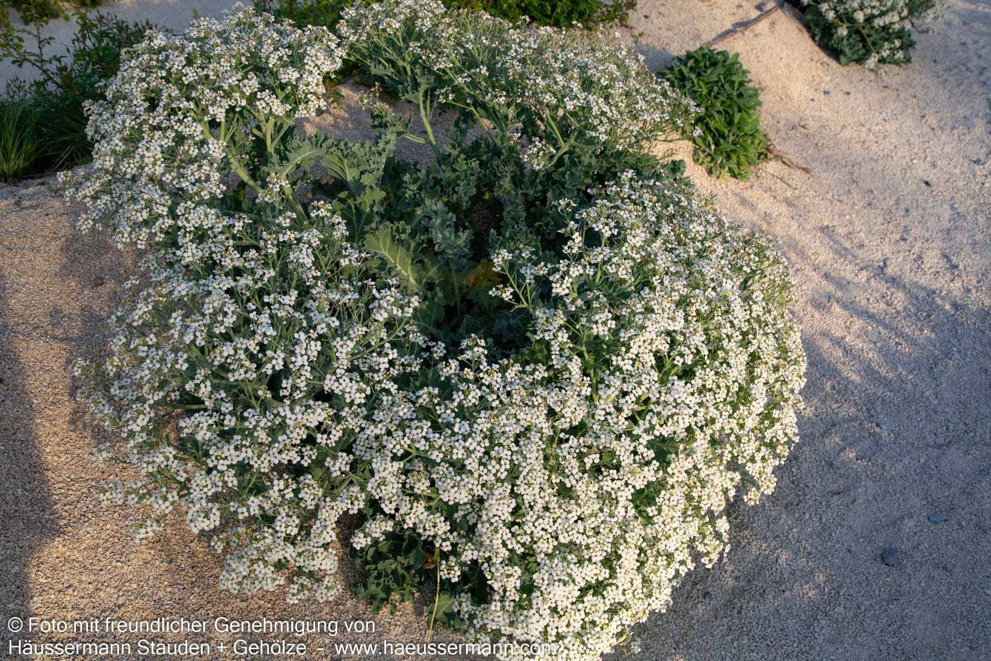 Der Küsten-Meerkohl (Crambe maritima) ist eine beeindruckende heimische Staude, die mit ihren spektakulären weißen Blüten von Mai bis Juli jeden Garten bereichert. Diese robuste Freiflächenstaude entwickelt imposante graugrüne Blätter und erreicht eine Blütenhöhe von bis zu 80 cm, während das dekorative Blattwerk kompakt bei 30 cm bleibt. Als wertvolles Koch-Kraut bietet der Küsten-Meerkohl nicht nur optischen Reiz, sondern auch kulinarischen Nutzen. Die winterharte Staude gedeiht optimal an sonnigen Standorten mit frischen Böden und sollte als Leitstaude mit einem Pflanzabstand von 40-80 cm gesetzt werden.