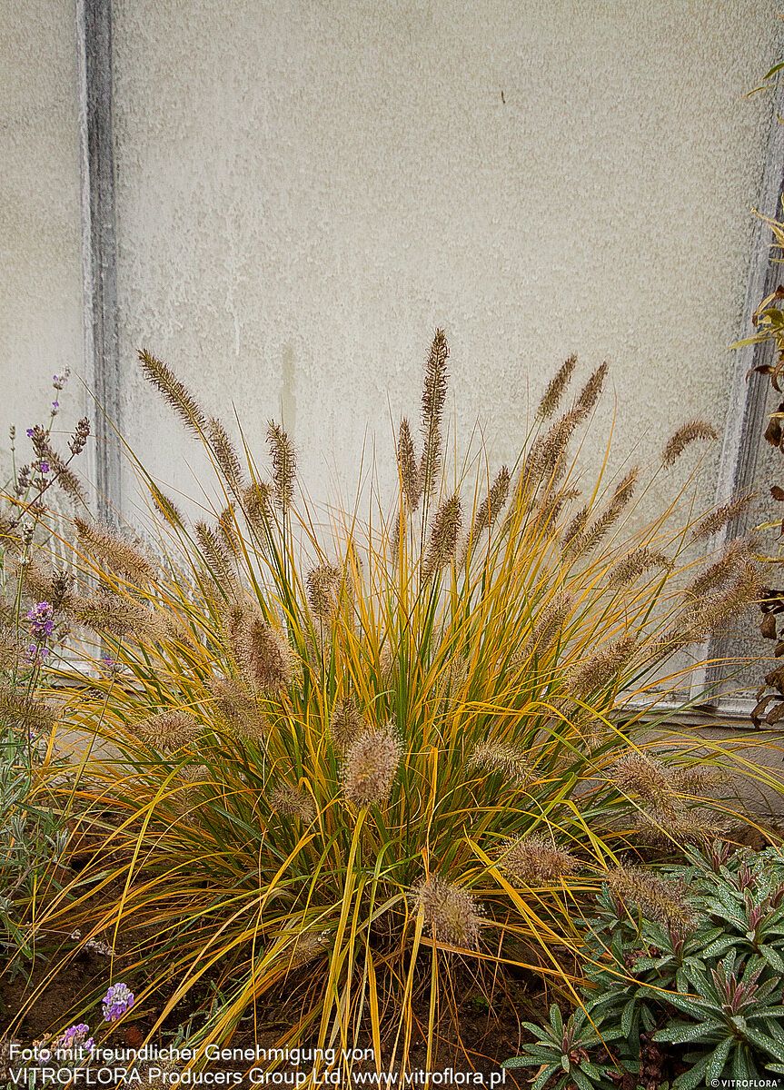 Das Lampenputzergras (Pennisetum alopecuroides 'Hameln') ist ein außergewöhnliches Ziergras, das mit seinen charakteristischen gelbbräunlichen Blütenähren von Juli bis Oktober für bewegte Akzente im Garten sorgt. Diese als Sternensorte ausgezeichnete Züchtung erreicht eine Blütenhöhe von 60 cm, während das frischgrüne, sommergrüne Blattwerk eine kompakte Höhe von 40 cm bildet. Der ausladende bis breitausladende und buschig-dichtbuschige Wuchs macht es zu einer idealen Leitstaude für sonnige Standorte mit frischen Böden. Als vielseitige Beetstaude und Freiflächenstaude eignet sich dieses winterharte Gras (bis -17°C) nicht nur als Strukturgeber im Beet, sondern auch für Schnittzwecke in der Floristik, wo seine dekorativen Fruchtstände als Fruchtschmuck besonders geschätzt werden.
