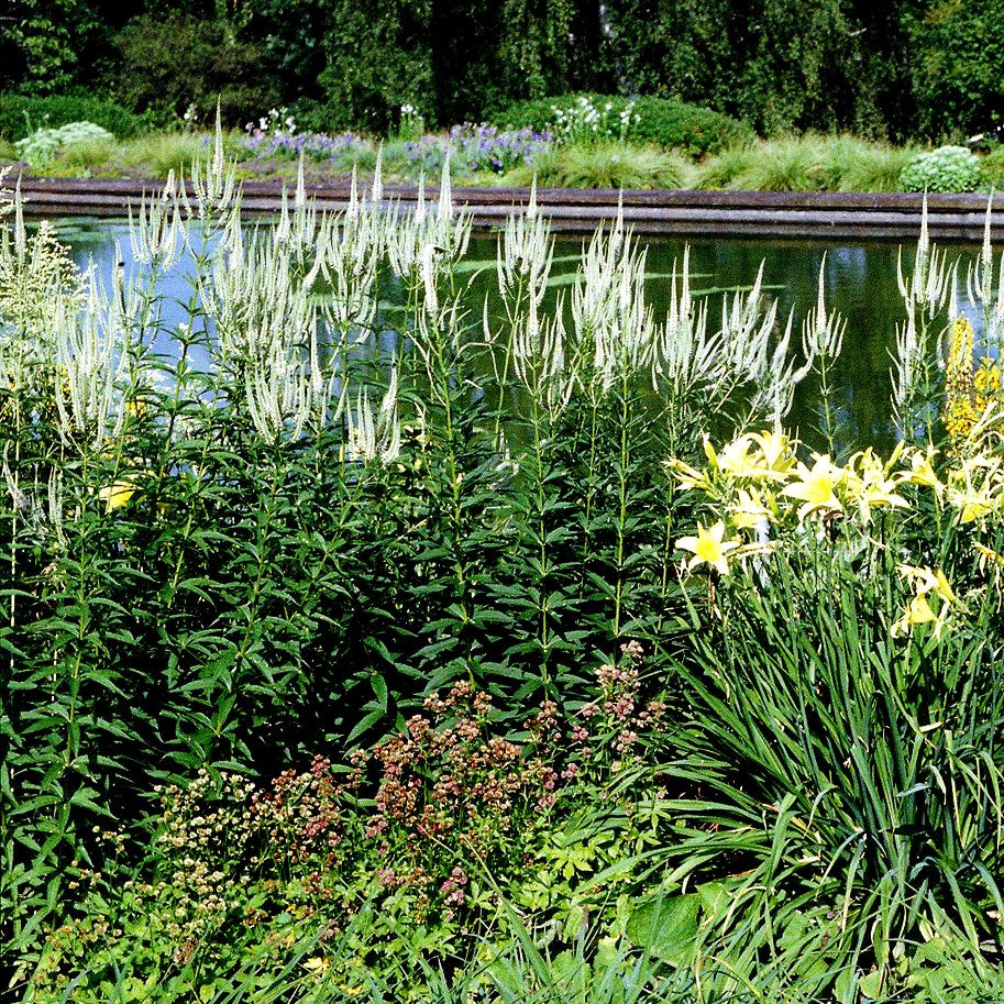Der Langblättrige Ehrenpreis (Veronica longifolia 'Schneeriesin') begeistert mit seinen eleganten, weißen Blütenkerzen, die von Juli bis August Ihren Garten in ein wahres Blütenmeer verwandeln. Diese prämierte Staude des Jahres 2007 erreicht eine stattliche Höhe von 80 bis 100 cm und gehört zu den ausgezeichneten Sternesorten der deutschen Staudensichtung.