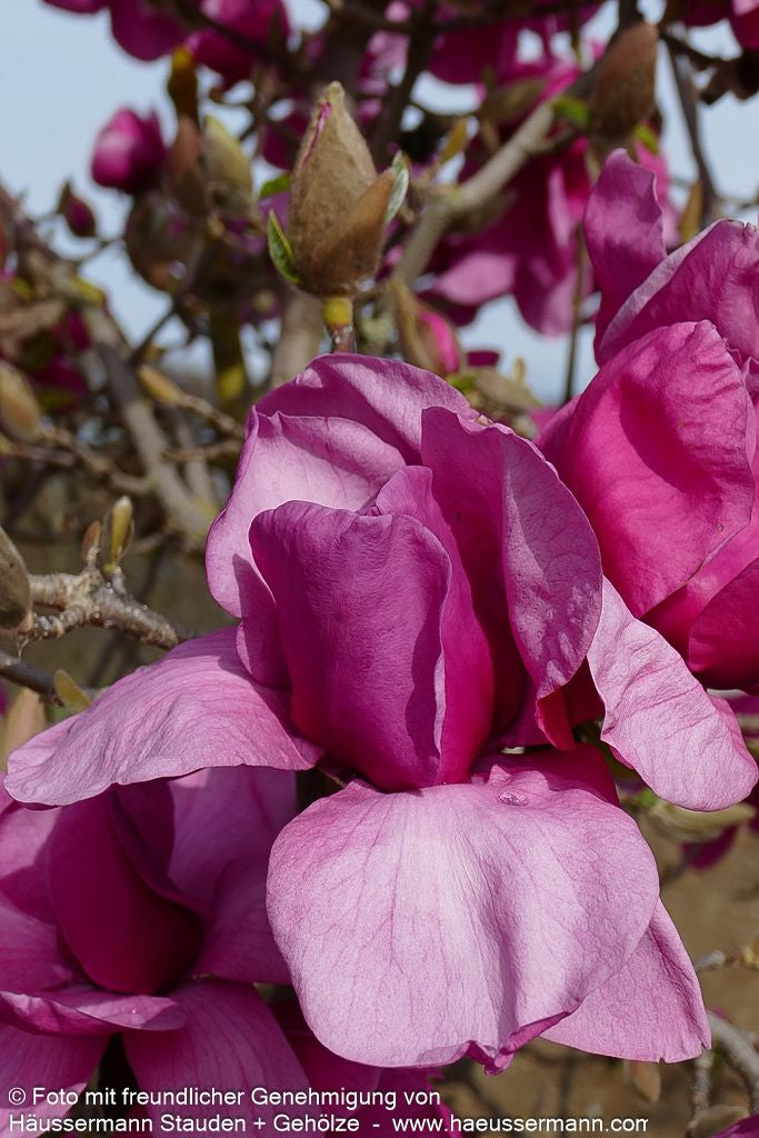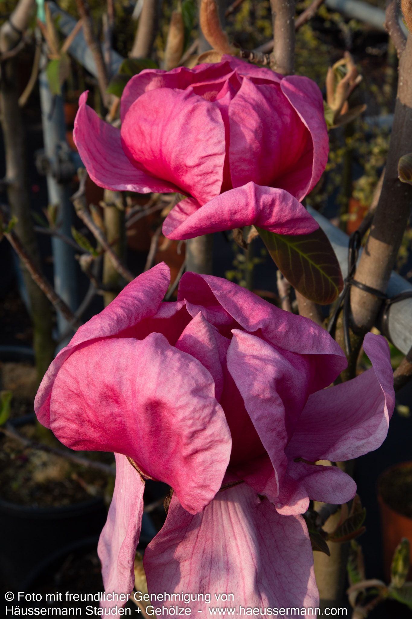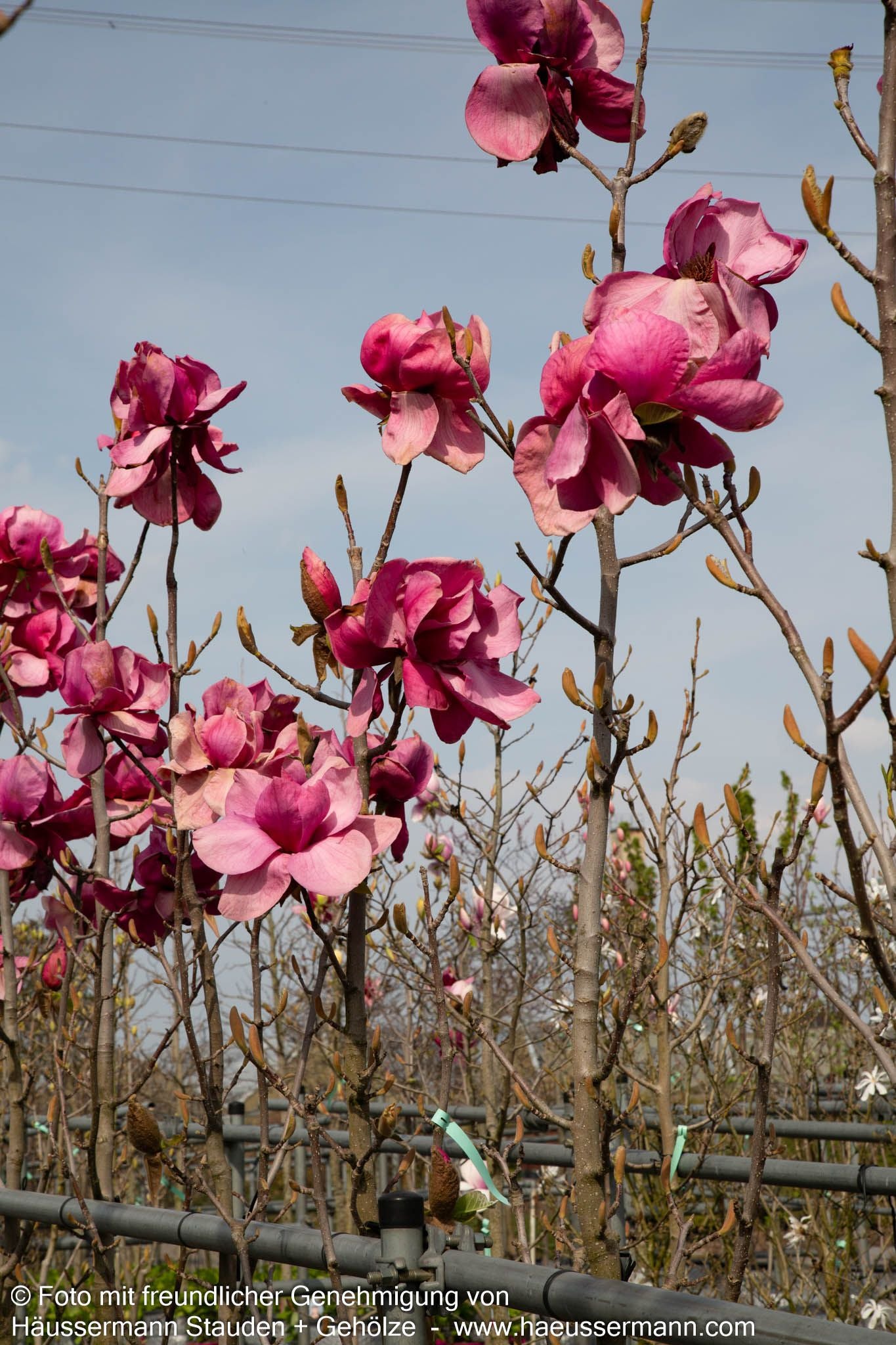 Die Magnolie (Magnolia x cult. 'Felix Jury') ist ein außergewöhnlicher Laubstrauch, der mit seinen spektakulären, 30-35 cm großen dunkel-rosa Blüten im April zu den absoluten Highlights im Garten zählt. Diese prämierte Züchtung des neuseeländischen Magnolien-Experten Vance Hooper entwickelt sich zu einem imposanten Großgehölz von 6-8 Metern Höhe mit einer eleganten breit aufrechten Wuchsform und ausgezeichneter Seitenverzweigung. Als wertvolles Gartengehölz bevorzugt sie absonnige bis sonnige Lagen sowie frische bis feuchte Böden. Dieses sommergrüne Gehölz ist der perfekte Blütenschmuck für jeden Gartenliebhaber, der Wert auf außergewöhnliche rosa Blütenpracht legt.