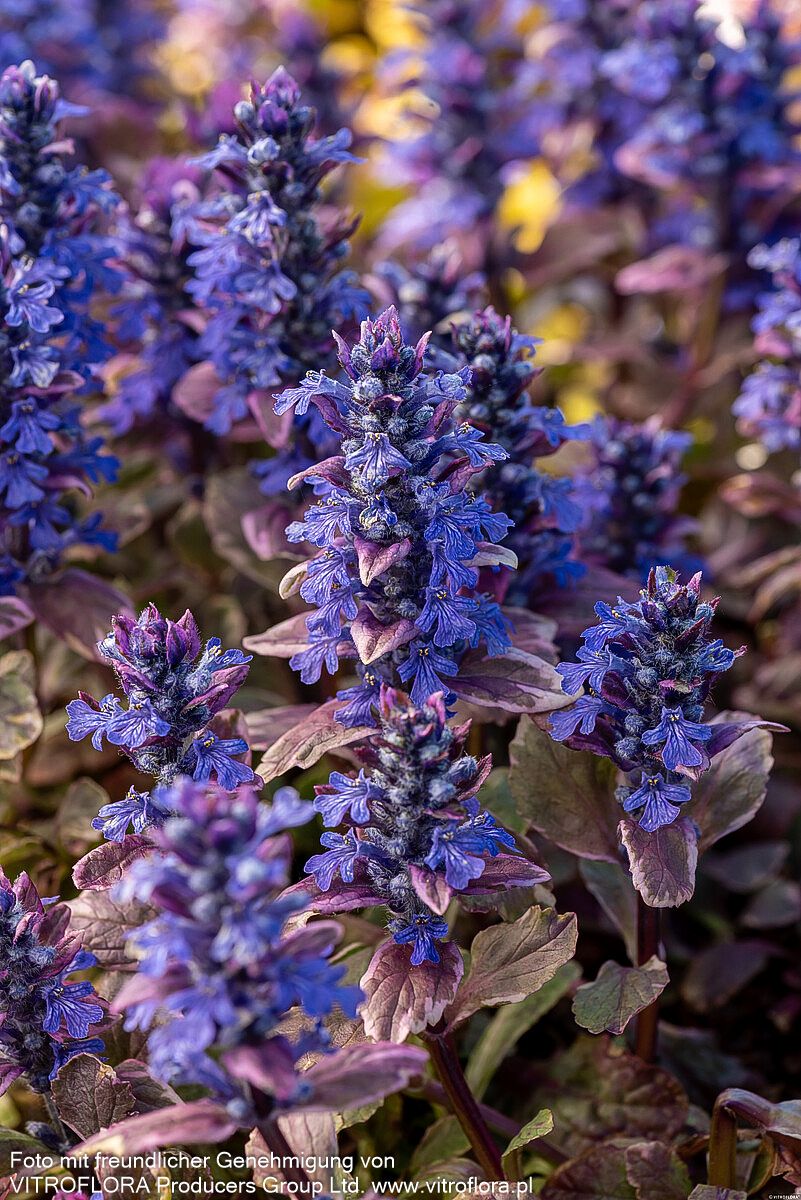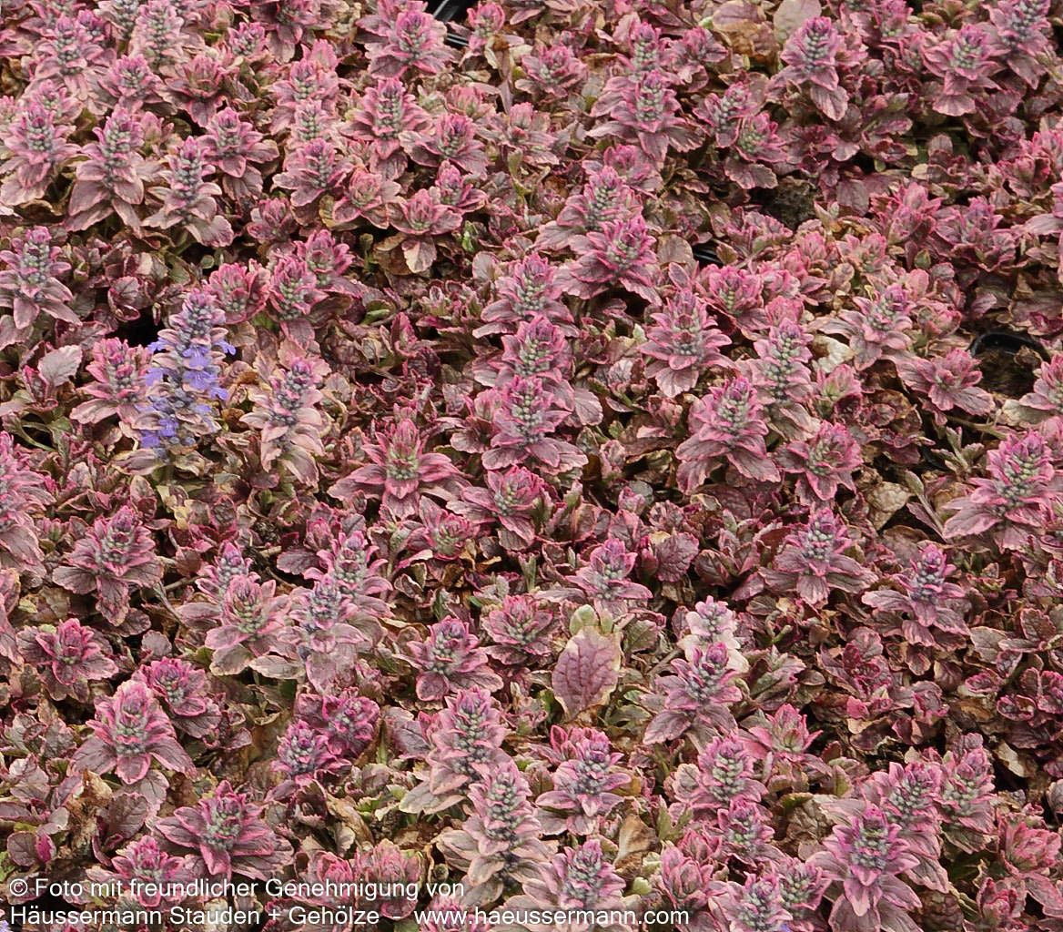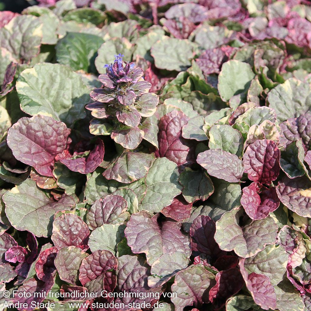 Der Mehrfarbige Günsel (Ajuga reptans 'Burgundy Glow') ist eine außergewöhnliche Staude mit spektakulärer Blattfärbung in grün, rosa und weiß. Diese wintergrüne Bodendecker-Schönheit bildet dichte Teppiche und begeistert von April bis Mai mit violettblauen Blüten, die bis zu 15 cm hoch werden. Als wertvolle Insektennährpflanze eignet sie sich perfekt für sonnige bis absonnige Bereiche am Gehölzrand und bevorzugt frische bis feuchte Böden. Mit ihrer teppichartigen Wuchsform und dem ausläuferbildenden Charakter ist diese winterharte Züchtung ideal als kleinflächiger Bodendecker oder als Begleitpflanze zu Rhododendron geeignet.