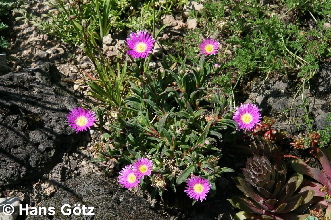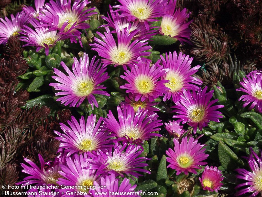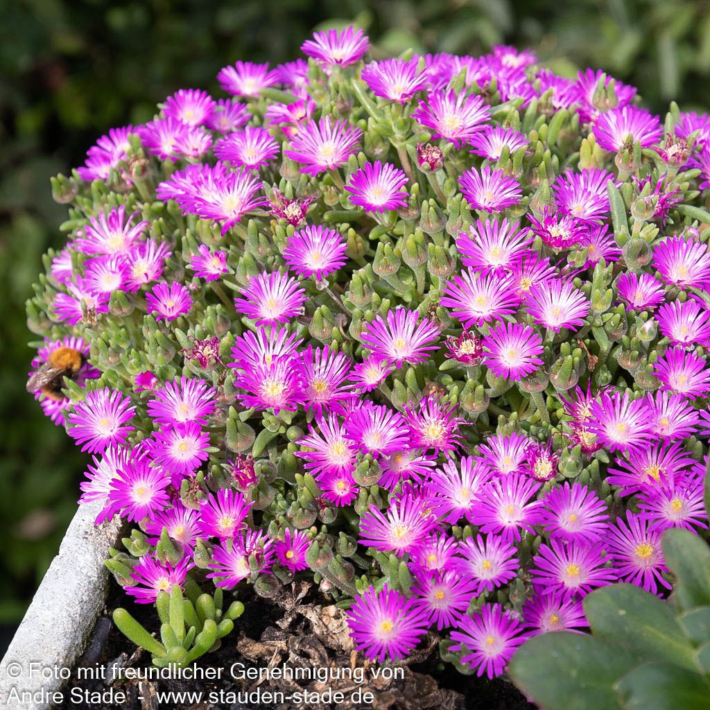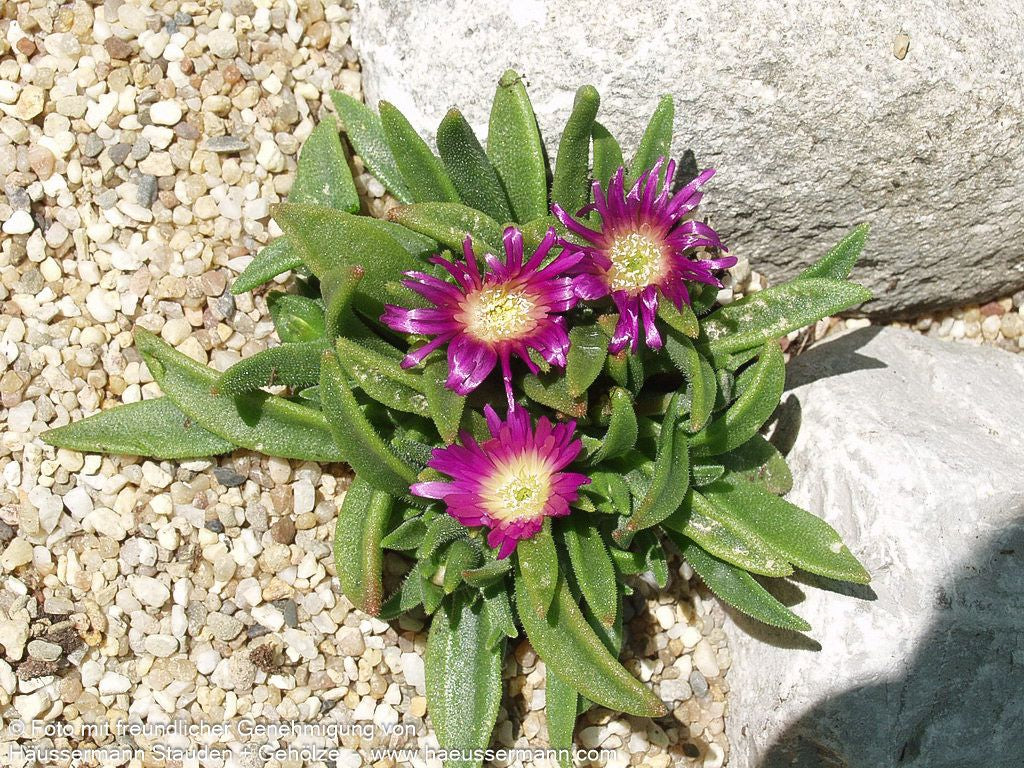 Die Mittagsblume (Delosperma sutherlandii) verzaubert mit ihren leuchtenden violettrosa Blüten von Juni bis August und ist ein wahrer Blickfang für Steinanlagen. Diese polsterartig wachsende Staude bildet mit ihren wintergrünen, grünen Blättern ganzjährig attraktive Teppiche. Als kleinflächiger Bodendecker bevorzugt sie sonnige Standorte mit trockenem, durchlässigem Boden. Die einfachen, etwa 5 cm großen Blüten öffnen sich charakteristisch zur Mittagszeit und schaffen ein faszinierendes Farbspiel. Bei einem Pflanzabstand von 15-20 cm entfaltet diese Gerüststaude ihre volle Pracht und eignet sich hervorragend für mediterrane Gartengestaltung, wobei unbedingt Staunässe zu vermeiden ist.