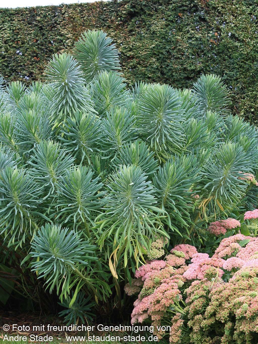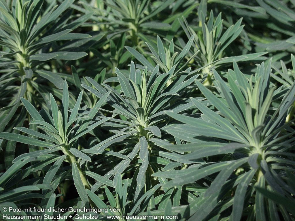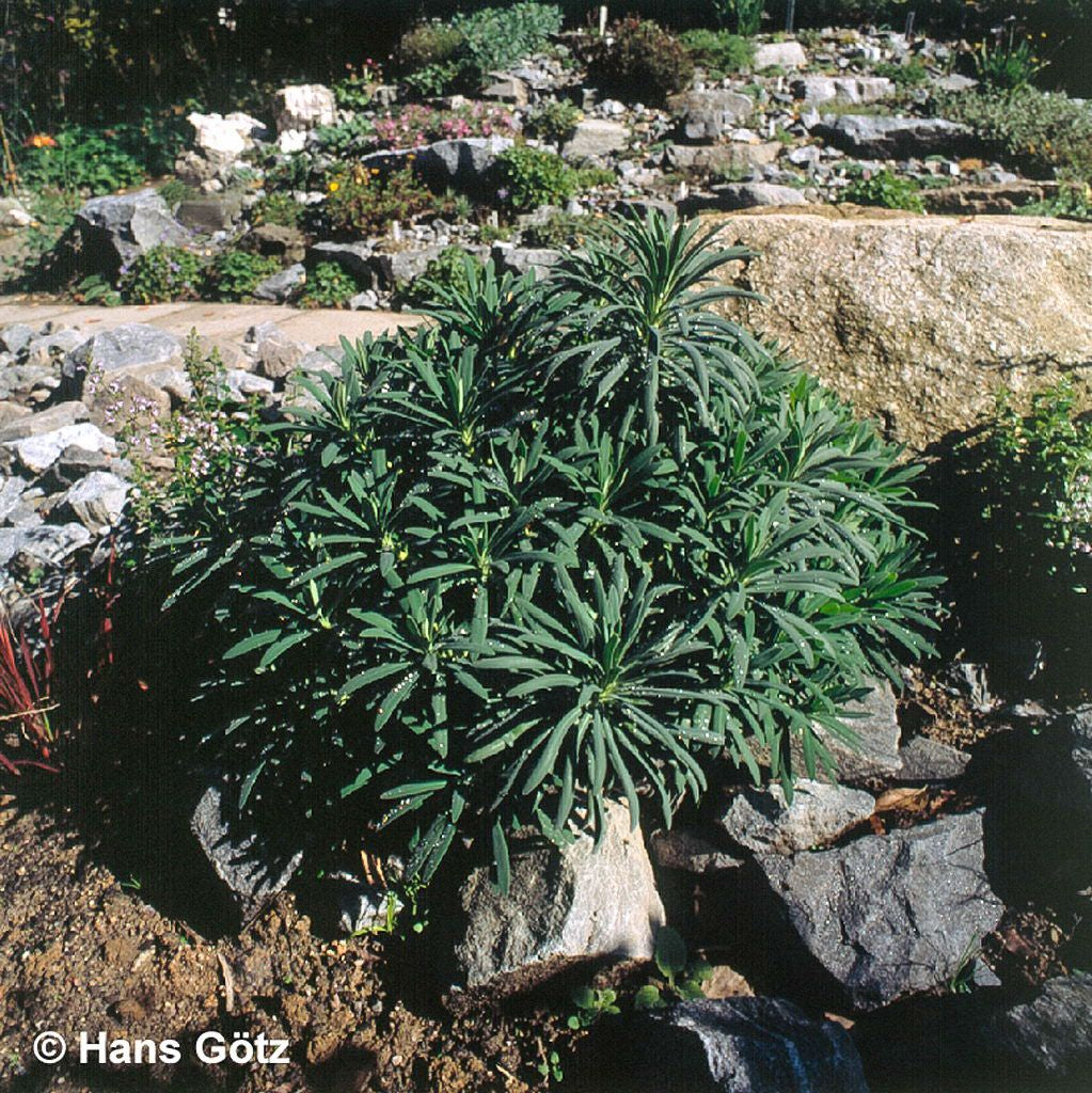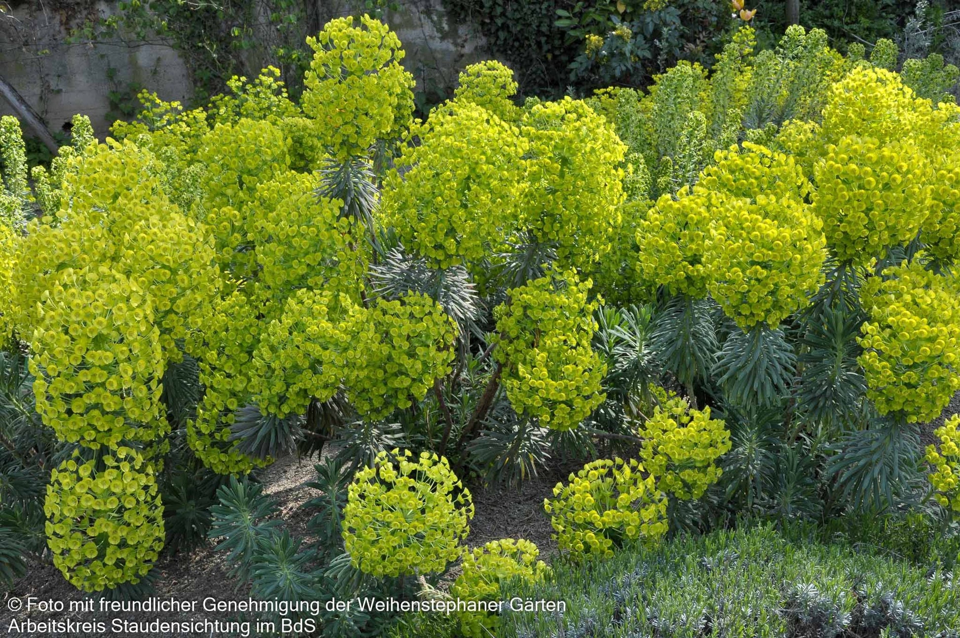 Die Mittelmeer-Wolfsmilch (Euphorbia characias ssp. wulfenii) ist eine imposante Staude mit außergewöhnlicher Ausstrahlung, die als Staude des Jahres 2013 besondere Anerkennung fand. Diese mediterrane Schönheit beeindruckt von April bis Juni mit ihren charakteristischen hell-gelben Blütenständen, die eine Höhe von 60 bis 120 cm erreichen. Ihre graugrünen, wintergrünen Blätter mit besonderer Blattform sorgen das ganze Jahr für strukturelle Akzente. Diese stark wachsende Leitstaude gedeiht optimal an sonnigen Standorten auf trockenen Böden und eignet sich hervorragend für Freiflächen, Steinanlagen oder Felssteppenbereiche.