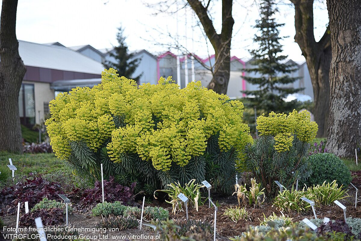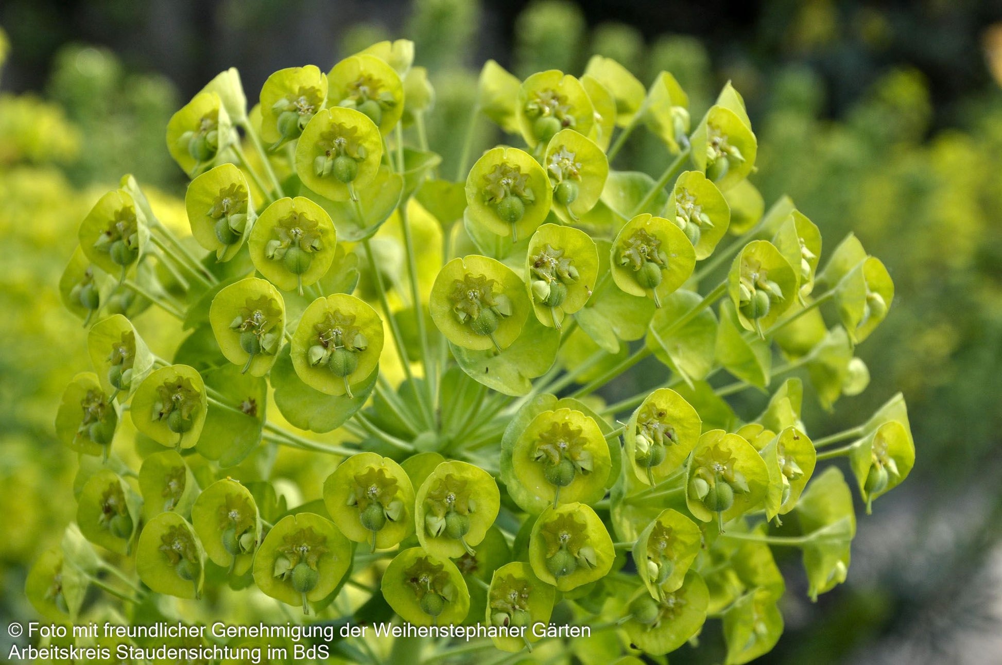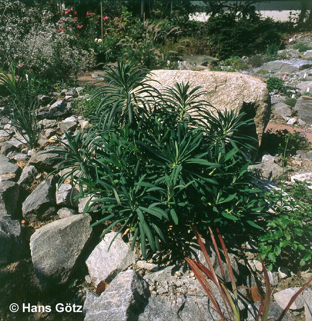 Die Mittelmeer-Wolfsmilch (Euphorbia characias ssp. wulfenii) ist eine imposante Staude mit außergewöhnlicher Ausstrahlung, die als Staude des Jahres 2013 besondere Anerkennung fand. Diese mediterrane Schönheit beeindruckt von April bis Juni mit ihren charakteristischen hell-gelben Blütenständen, die eine Höhe von 60 bis 120 cm erreichen. Ihre graugrünen, wintergrünen Blätter mit besonderer Blattform sorgen das ganze Jahr für strukturelle Akzente. Diese stark wachsende Leitstaude gedeiht optimal an sonnigen Standorten auf trockenen Böden und eignet sich hervorragend für Freiflächen, Steinanlagen oder Felssteppenbereiche.