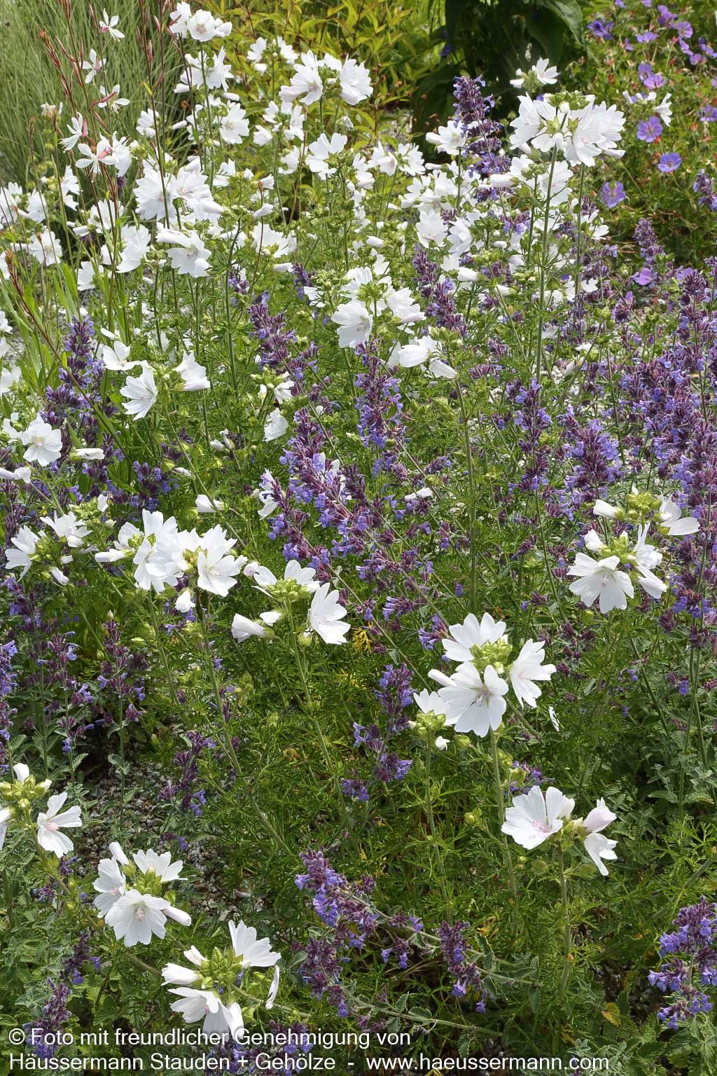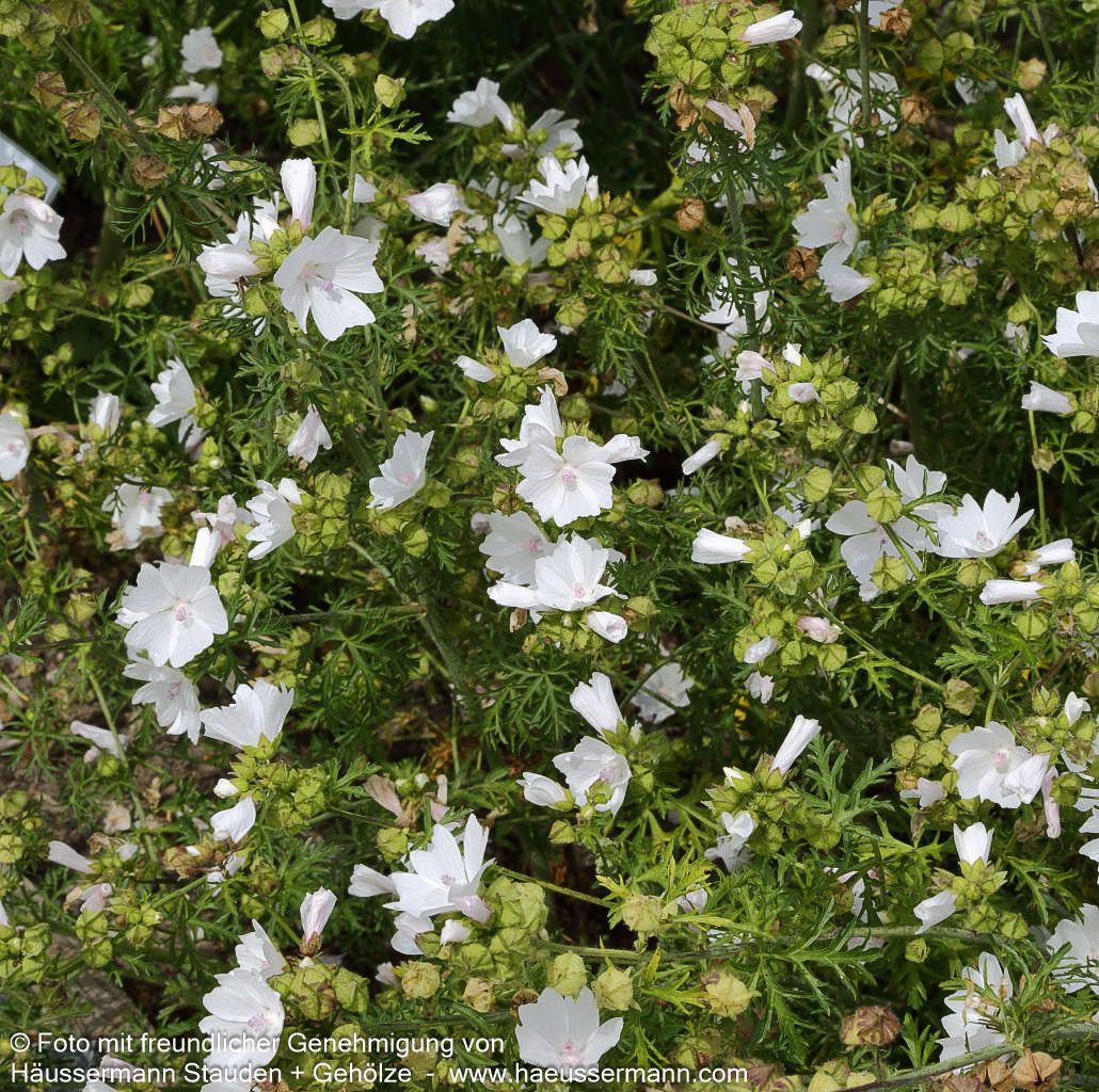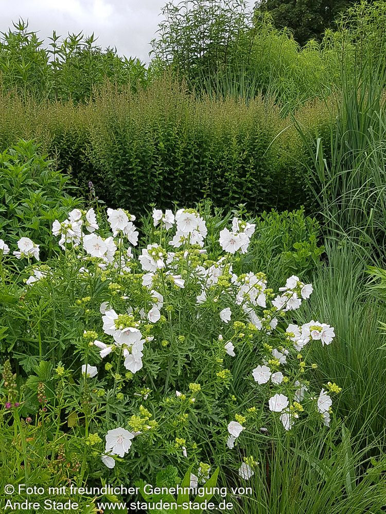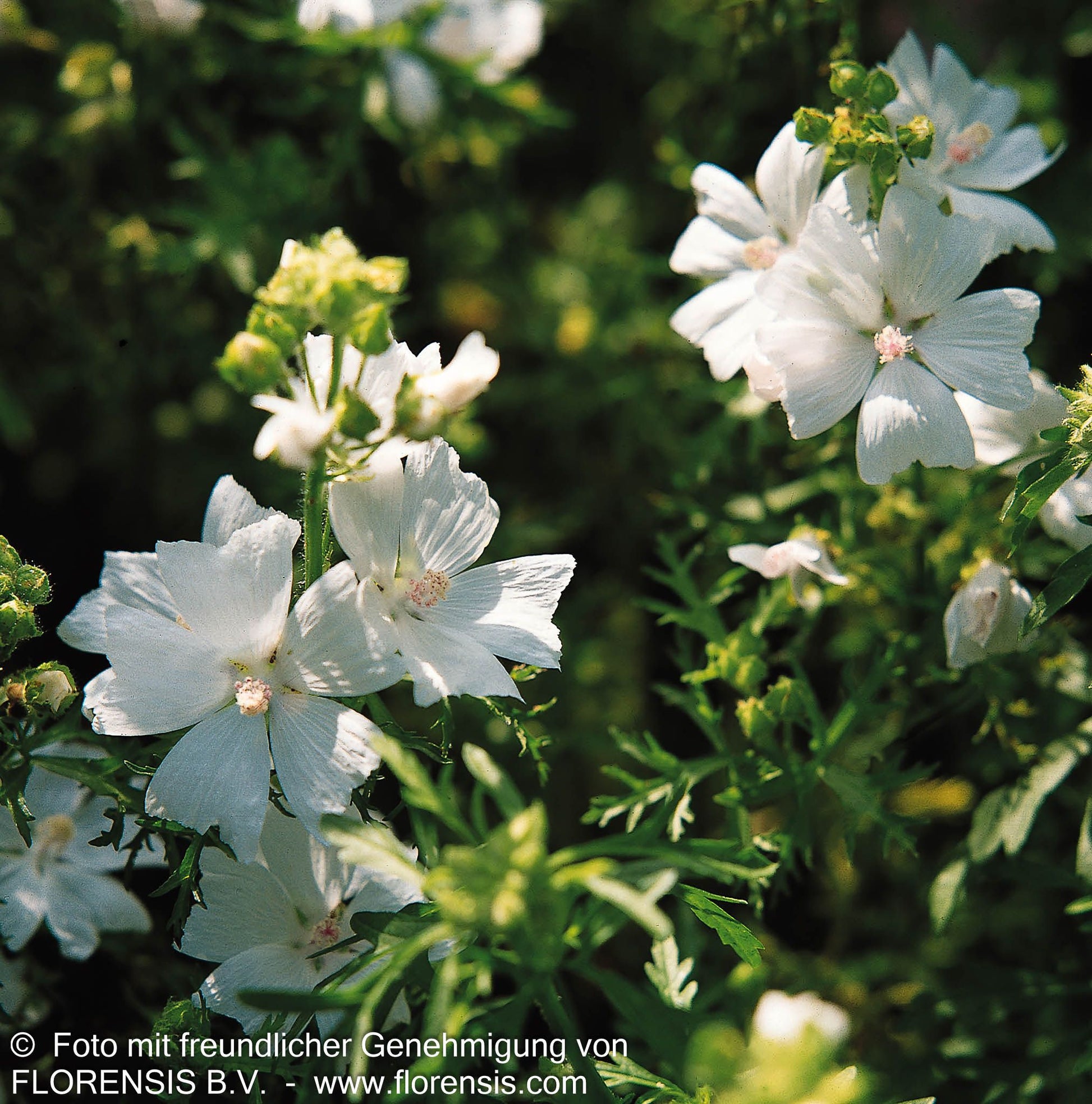 Die Moschus-Malve (Malva moschata 'Alba') ist eine bezaubernde Staude, die mit ihren reinweißen, einfachen Blüten von Juni bis September für eine langanhaltende Blütenpracht sorgt. Diese robuste Sternensorte erreicht eine Blütenhöhe von 60-80 cm und überzeugt mit ihrem charakteristischen Blatt- oder Blütenduft. Als vielseitige Insektennährpflanze ist sie perfekt für den Bauerngarten geeignet und gedeiht sowohl als Gehölzrandstaude als auch als Freiflächenstaude. Die winterharte Malve bevorzugt sonnige Standorte und toleriert sowohl trockene als auch frische Böden, was sie zu einer pflegeleichten und zuverlässigen Gartenschönheit macht.