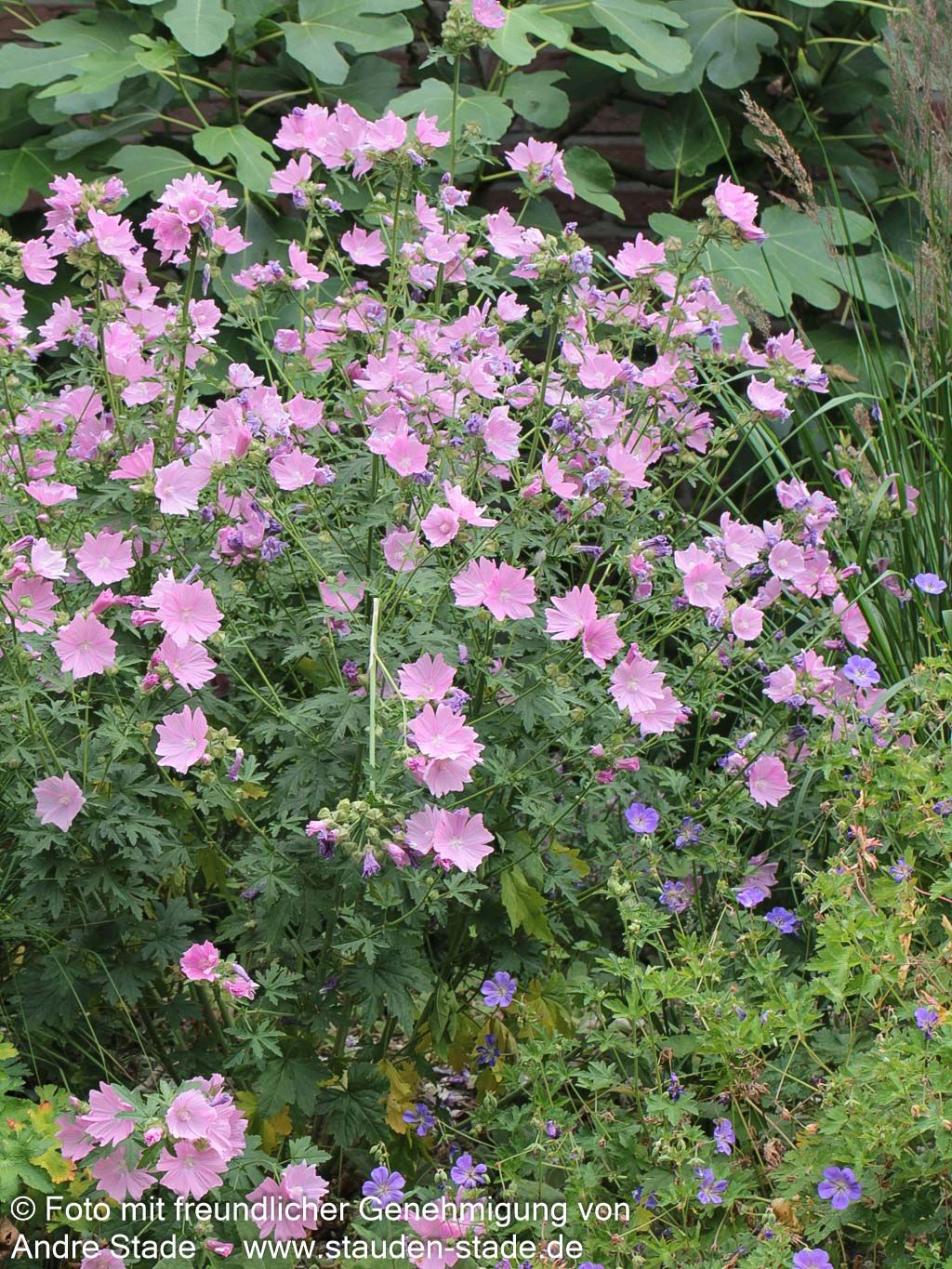 Die Moschus-Malve (Malva moschata) ist eine bezaubernde heimische Staude, die mit ihren duftenden, weißlichrosa bis rosa Blüten von Juni bis September begeistert. Diese robuste Staude erreicht eine Blütenhöhe von 40 bis 60 cm und entwickelt sich buschig und dichtbuschig. An sonnigen Standorten mit trockenem bis frischem Boden entfaltet sie ihre volle Pracht und wird mit ihren einfachen Blüten zur wertvollen Insektennährpflanze. Der charakteristische Blüten- und Blattduft sowie die grünen, sommergrünen Blätter machen sie zur idealen Wahl für den Bauerngarten. Mit ihrer extremen Winterhärte bis -39°C ist diese charmante Wildstaude eine zuverlässige Bereicherung für jeden naturnahen Garten.
