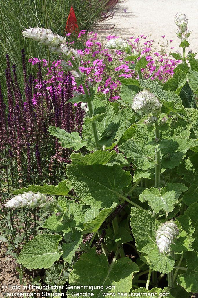 Der Muskateller-Salbei (Salvia sclarea var.turkest.'Vatican White') ist eine außergewöhnliche zweijährige Staude, die mit ihren reinweißen Blüten von Juni bis August ein wahres Highlight im Garten darstellt. Diese prachtvolle Staude des Jahres 2003 erreicht eine beeindruckende Blütenhöhe von 70-80 cm und besticht durch ihre graugrünen, duftenden Blätter. Als wertvolle Insektennährpflanze ist sie perfekt für den Bauerngarten geeignet und bevorzugt sonnige Standorte mit trockenen Böden. Diese winterharte Leitstaude mit ihrem charakteristischen Blatt- und Blütenduft entwickelt eine buschige Wuchsform und sollte mit einem Pflanzabstand von 60-120 cm gesetzt werden, um ihre volle Schönheit zu entfalten.