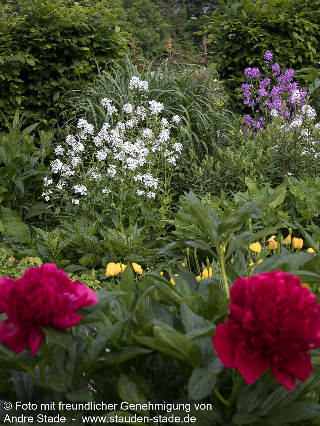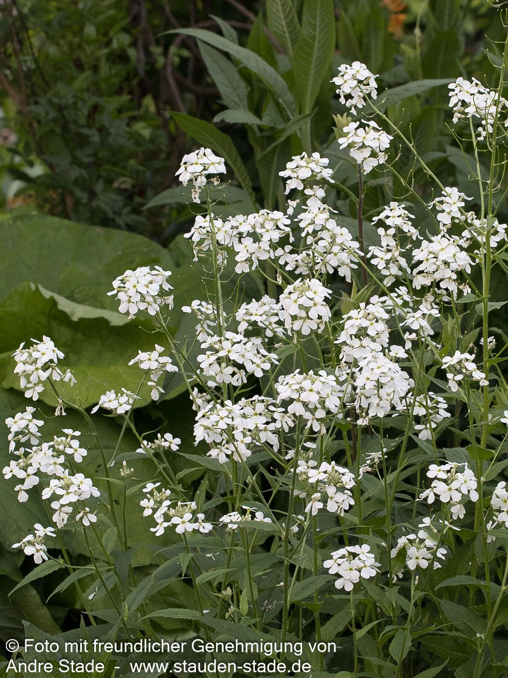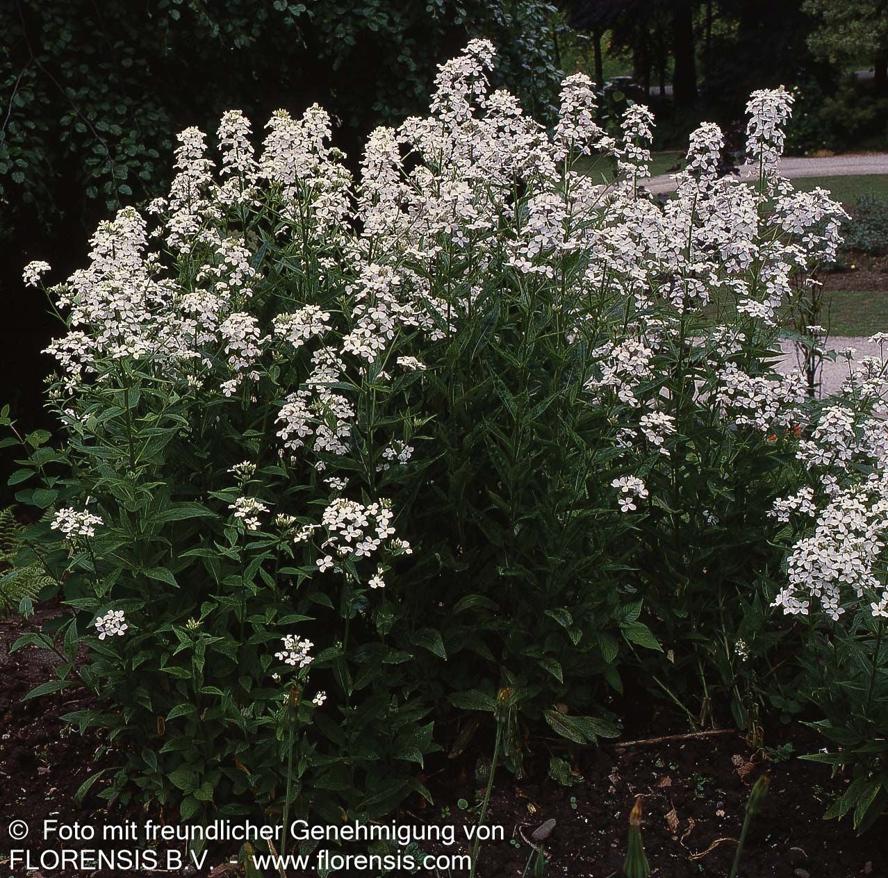 Die Nachtviole (Hesperis matronalis var. albiflora) verzaubert mit ihren duftenden, weißen Blüten von Mai bis Juli und erreicht dabei eine imposante Höhe von 60-70 cm. Diese charmante Staude gedeiht sowohl an sonnigen als auch halbschattigen Standorten und bevorzugt frischen Boden. Als klassische Bauerngartenpflanze mit buschigem Wuchs ist sie nicht nur optisch ein Highlight, sondern auch eine wertvolle Insektennährpflanze. Die winterharte zweijährige Pflanze eignet sich hervorragend als Gehölzrandstaude und verströmt besonders am Abend ihren charakteristischen Blütenduft.