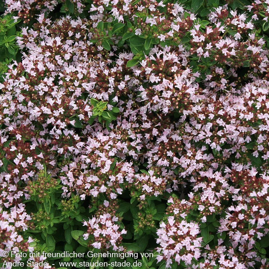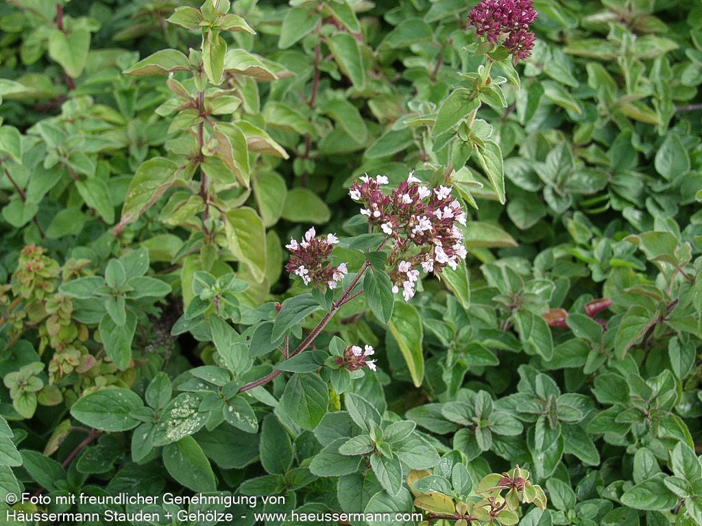 Der Oregano (Origanum vulgare) ist eine vielseitige, heimische Staude, die als unverzichtbares Würzkraut in keinem Garten fehlen sollte. Von Juli bis September schmückt sich dieser robuste Staude mit zarten, hell-rosa Blüten, die eine Höhe von 30-50 cm erreichen und als wertvolle Insektennährpflanze dienen. Die grünen, wintergrünen Blätter verströmen einen intensiven Blatt- oder Blütenduft und sind reich an ätherischen Ölen. Diese buschig wachsende Koch-Kräuter und Grill-Kräuter gedeiht hervorragend an sonnigen Standorten mit trockenem Boden und eignet sich perfekt für Bauerngarten, Steinanlagen oder als kleinflächiger Bodendecker. Als traditionelle Heil- und Medizinpflanze lindert Oregano als Tee Husten und Blähungen und ist winterhart bis -28°C.