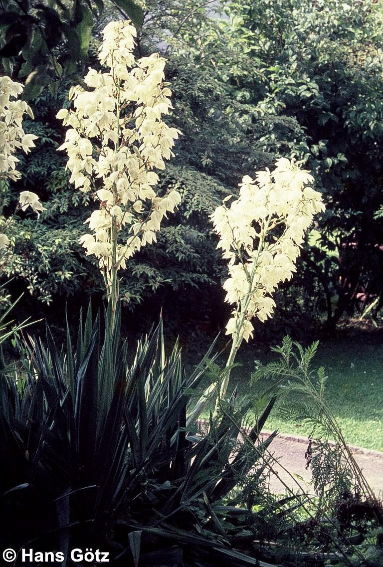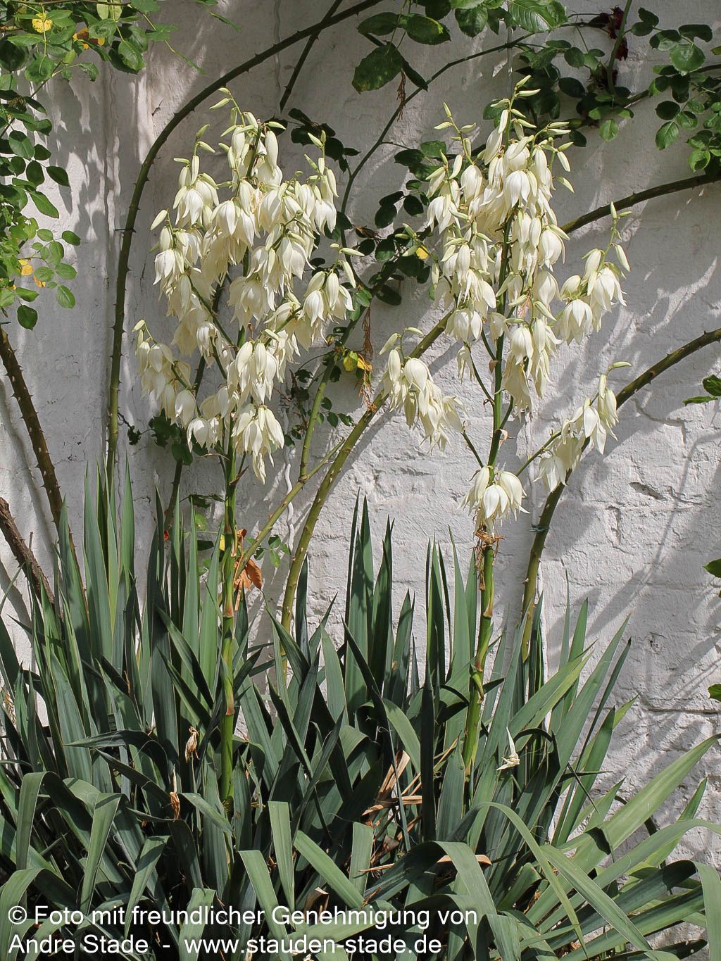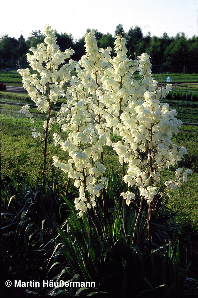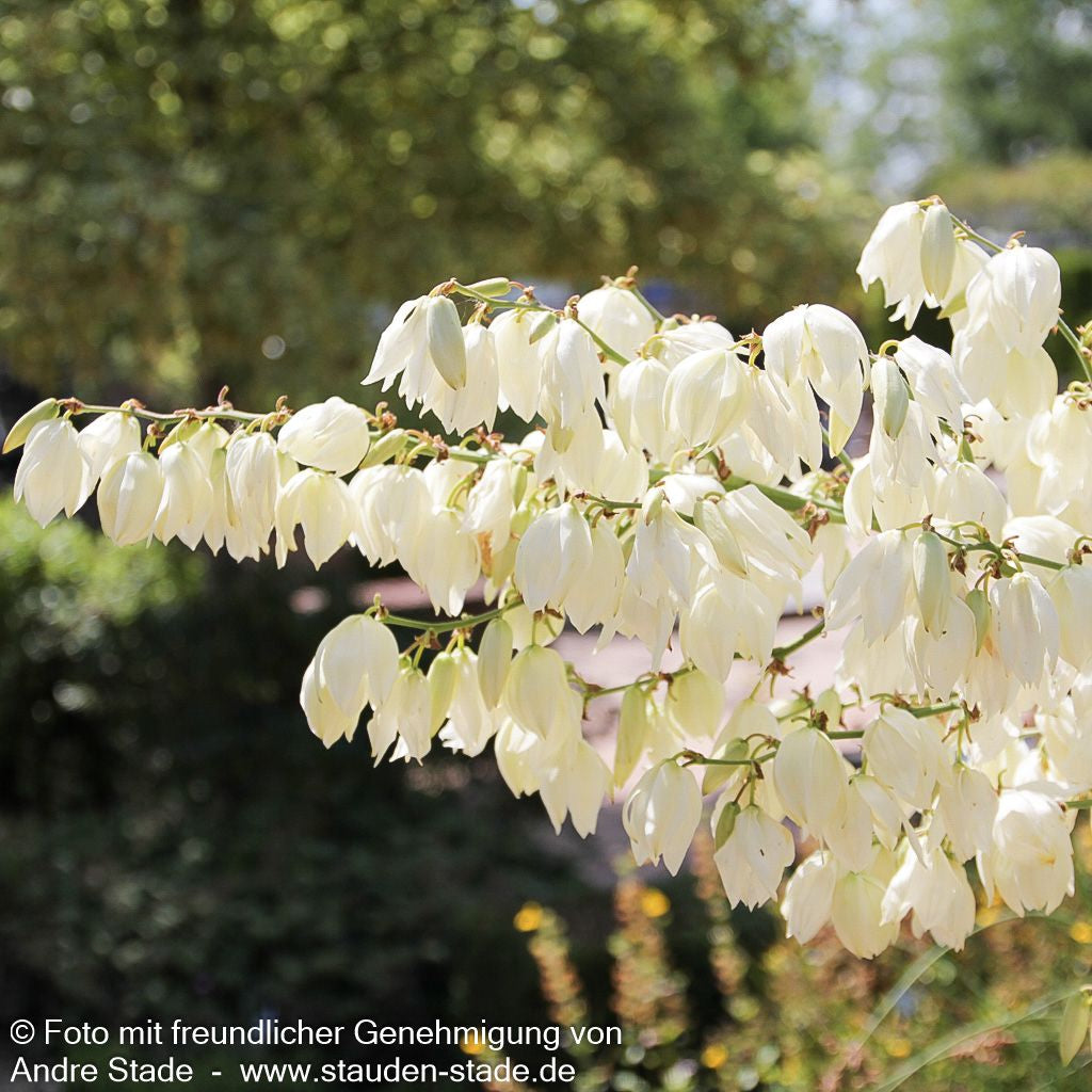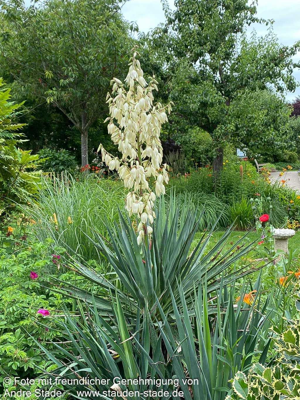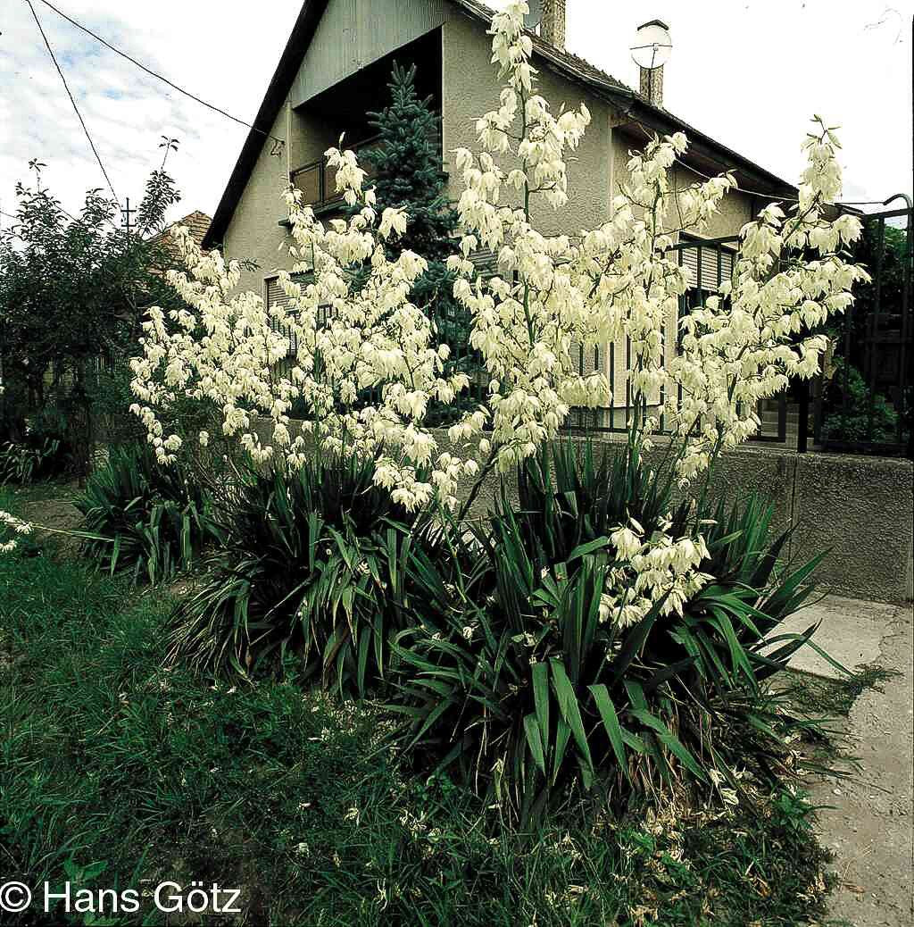 Die Palmlilie (Yucca filamentosa) ist ein außergewöhnlicher immergrüner Halbstrauch, der mit seinen spektakulären gelblichweißen Blütenrispen jeden Garten zu einem exotischen Paradies verwandelt. Diese robuste Staude erreicht eine beeindruckende Blütenhöhe von 150 cm und präsentiert ihre eleganten weißen Blüten von Juli bis August, teilweise sogar bis in den September. Die charakteristischen graugrünen, etwa 60 cm langen Blätter bilden das ganze Jahr über eine attraktive Rosette und machen diese Staude zu einem ganzjährigen Blickfang. Besonders wohl fühlt sich die Palmlilie an sonnigen Standorten im Steingarten auf trockenem Boden, wo sie ihre volle Pracht entfalten kann. Diese pflegeleichte und winterharte Pflanze ist die perfekte Wahl für moderne Gartengestaltung und bringt mediterranes Flair in jeden Außenbereich.