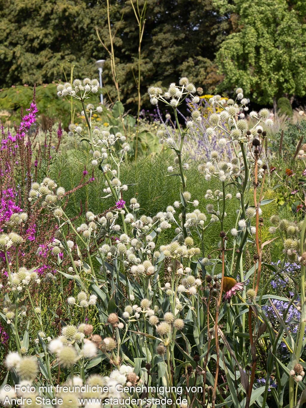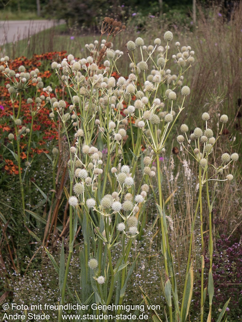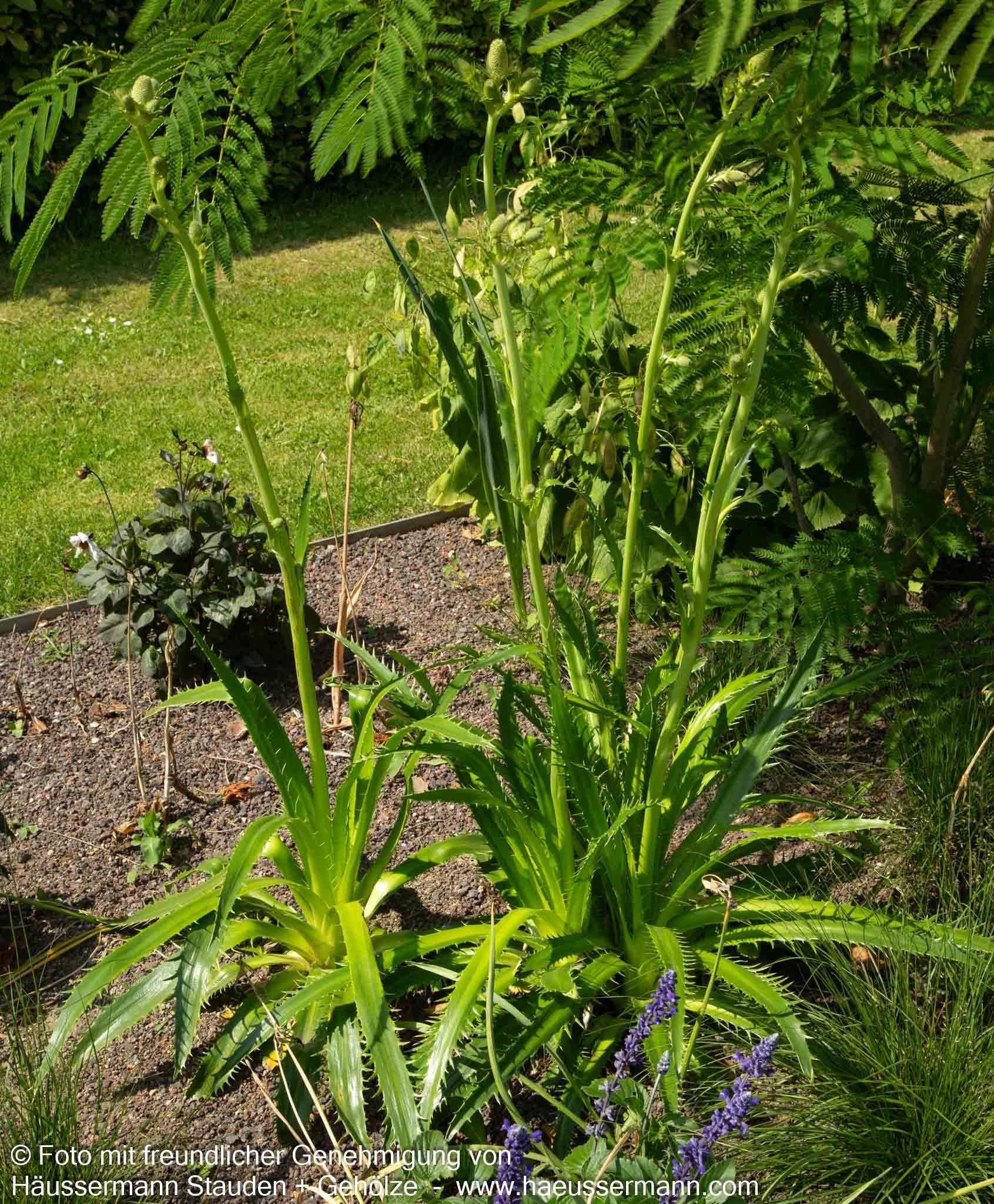 Die Palmlilienblättrige Edeldistel (Eryngium yuccifolium) ist eine außergewöhnliche Staude, die als Staude des Jahres 2019 besondere Aufmerksamkeit verdient. Diese imposante Freiflächenstaude erreicht eine beeindruckende Blütenhöhe von 150 bis 180 cm und entwickelt von Juli bis September ihre charakteristischen grünlichweißen Blütenstände. Die grünen, wintergrünen Blätter bilden mit 50-80 cm Höhe einen attraktiven Kontrast zur hohen Blüte. An sonnigen Standorten mit frischen bis feuchten Böden entfaltet sie ihre volle Pracht und dient als wertvolle Insektennährpflanze. Die bogig geneigte Wuchsform macht sie zur idealen Leitstaude für den Bauerngarten und eignet sich hervorragend für Schnittzwecke.