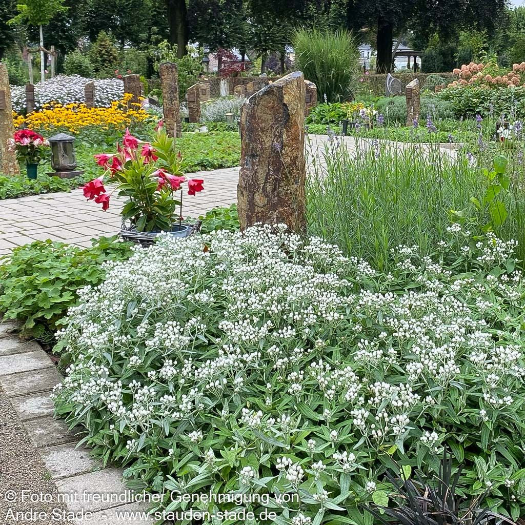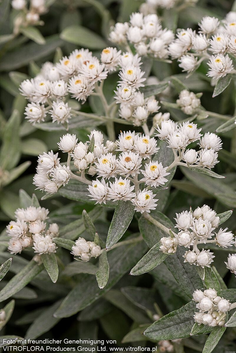 Das Perlkörbchen (Anaphalis triplinervis 'Sommerschnee') ist eine bezaubernde Staude mit strahlend weißen Blüten, die von Juli bis September eine elegante Blütenpracht entfaltet. Diese robuste Sternensorte erreicht eine Blütenhöhe von 20-25 cm und begeistert mit ihren charakteristischen graugrünen, sommergrünen Blättern. Das winterharte Perlkörbchen gedeiht optimal an sonnigen Standorten und toleriert sowohl trockene als auch frische Böden. Diese vielseitige Pflanze eignet sich hervorragend für Steinanlagen, als kleinflächiger Bodendecker und sogar für die extensive Dachbegrünung. Dank ihrer buschigen Wuchsform und der Eignung für Schnittzwecke ist 'Sommerschnee' eine wertvolle Bereicherung für jeden Garten.