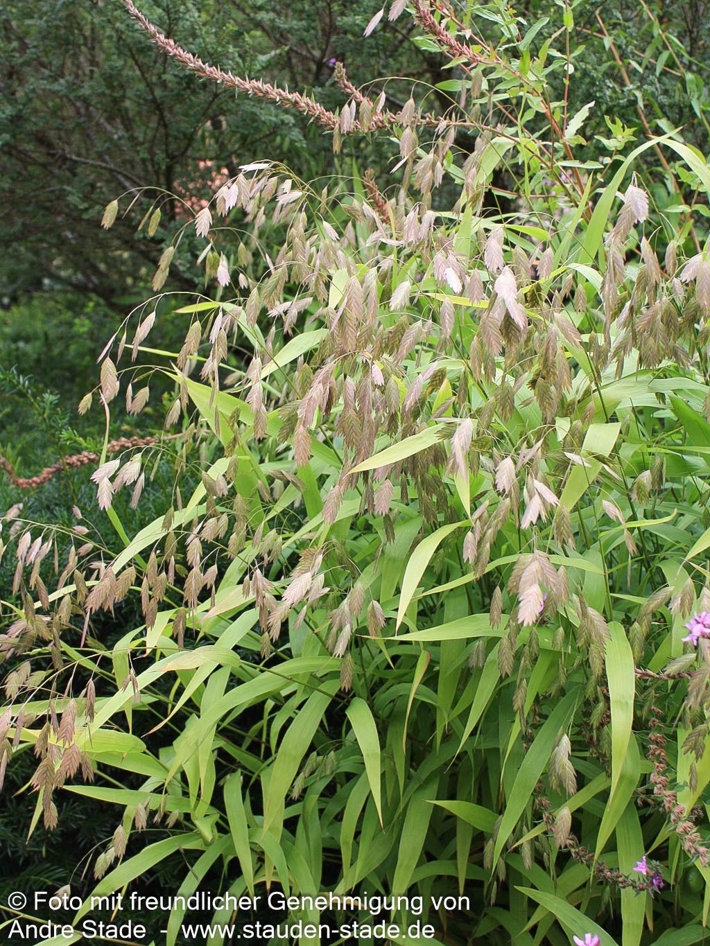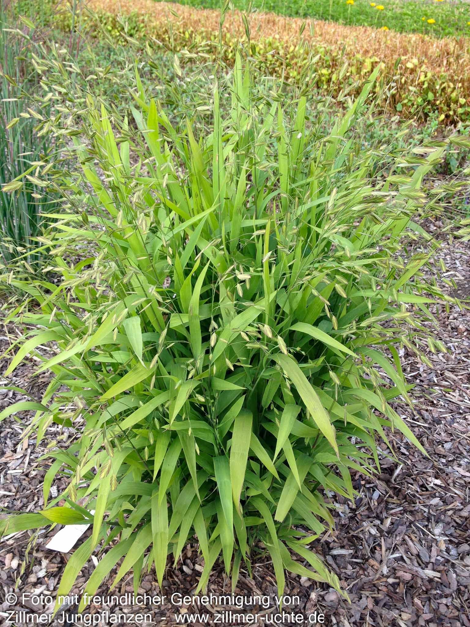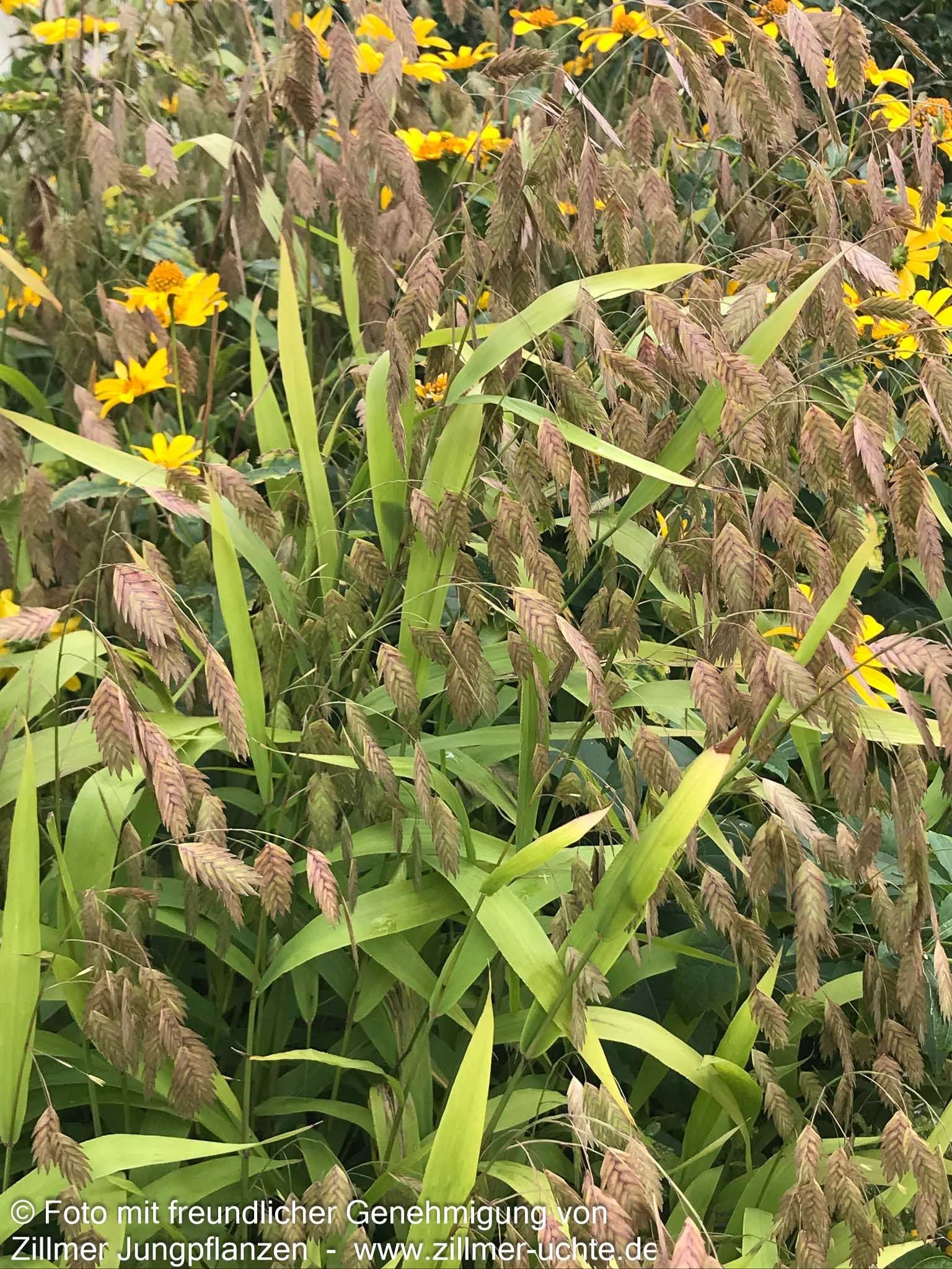 Das Plattährengras (Chasmanthium latifolium) ist ein außergewöhnliches Ziergras, das Ihren Garten mit seiner eleganten Erscheinung bereichert. Diese Sternensorte entwickelt einen malerischen, bogigen Wuchs und erreicht eine beeindruckende Höhe von 80-100 cm. Von August bis Oktober schmückt sich das sommergrüne Gras mit charakteristischen, bräunlichen Blütenähren, die einen reizvollen Fruchtschmuck bilden. Das winterharte Gras gedeiht optimal an sonnigen bis absonnigen Standorten auf frischen bis feuchten Böden. Als vielseitige Leitstaude eignet es sich hervorragend für den Bauerngarten, als Gehölzrandstaude und für Schnittzwecke.
