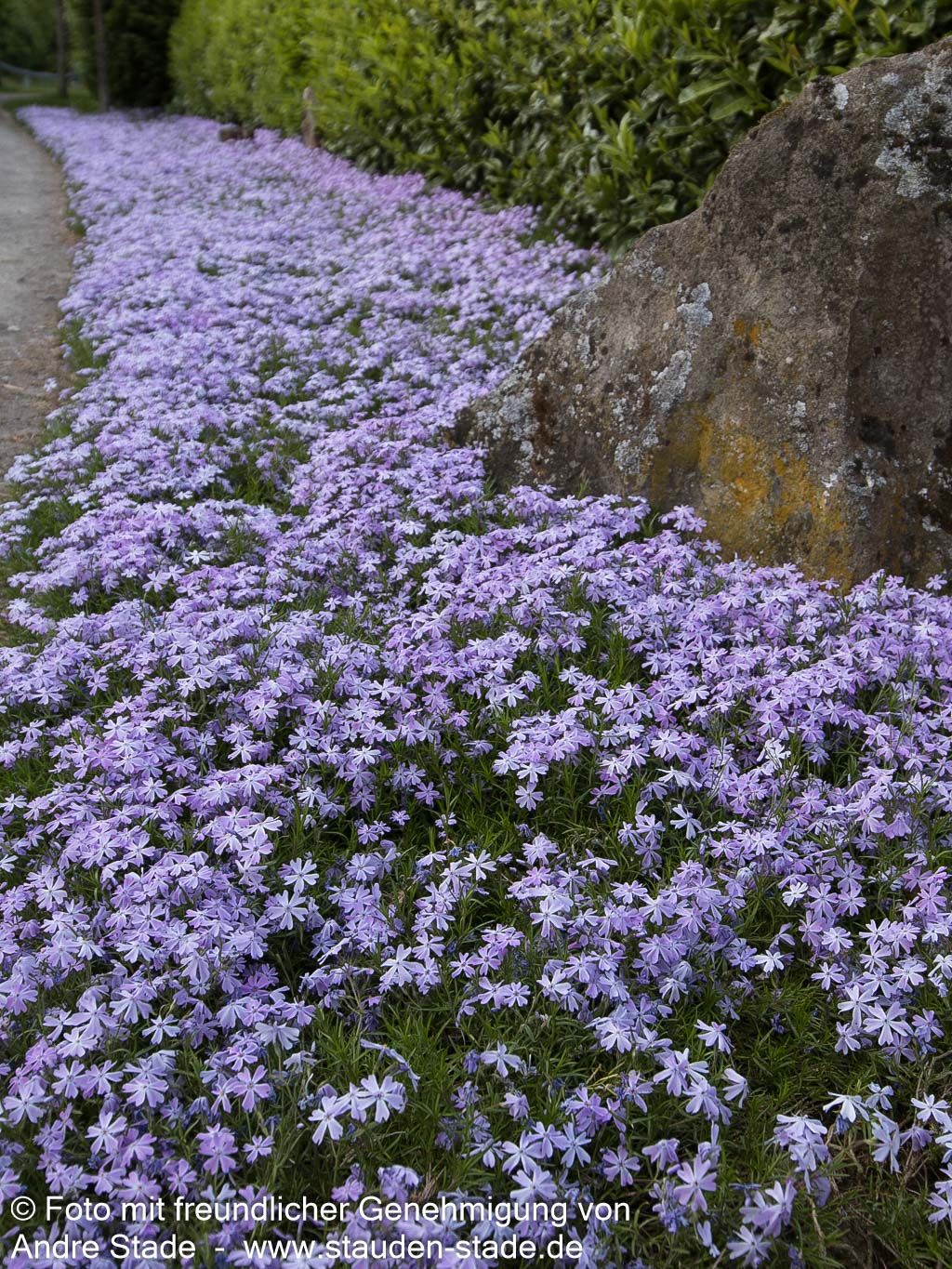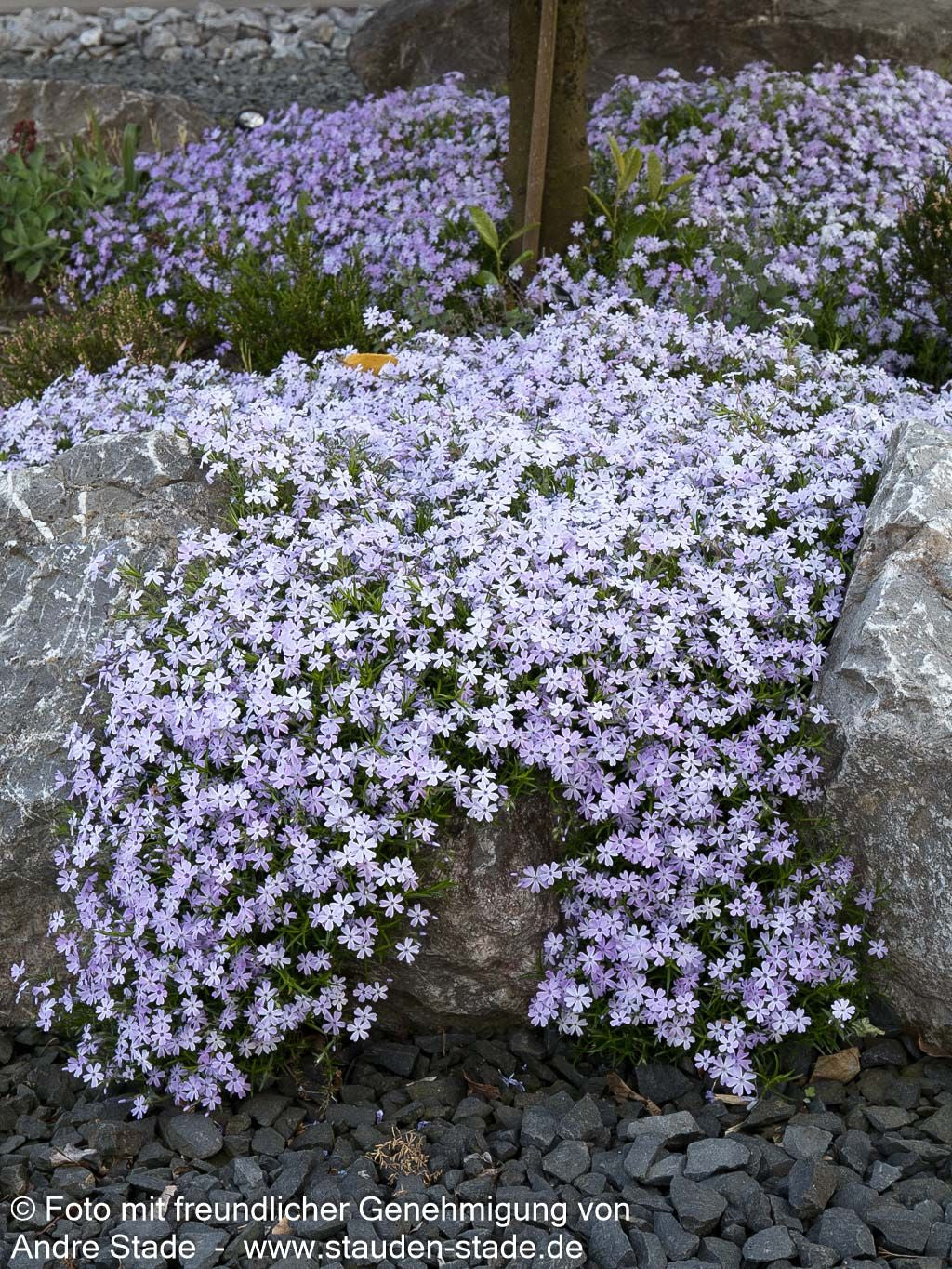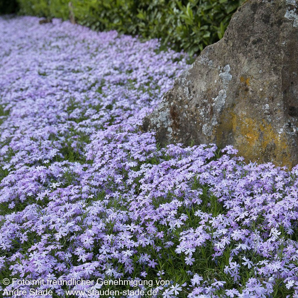 Die Polster-Flammenblume (Phlox subulata 'Emerald Cushion Blue') ist eine ausgezeichnete Staude, die als Staude des Jahres 2006 besondere Anerkennung fand. Diese Sternensorte verzaubert von April bis Mai mit ihren hell-violetten, einfachen Blüten und bildet dabei einen nur 10-15 cm hohen, teppichartigen Blütenteppich. Die flächig wachsende Pflanze gedeiht hervorragend an sonnigen Standorten und toleriert sowohl trockene als auch frische Böden. Als idealer kleinflächiger Bodendecker eignet sich diese kriechend wachsende Schönheit perfekt für Steinanlagen, Felssteppen und Mauerkronen, wobei ihre wintergrünen Blätter auch außerhalb der Blütezeit für Struktur sorgen.