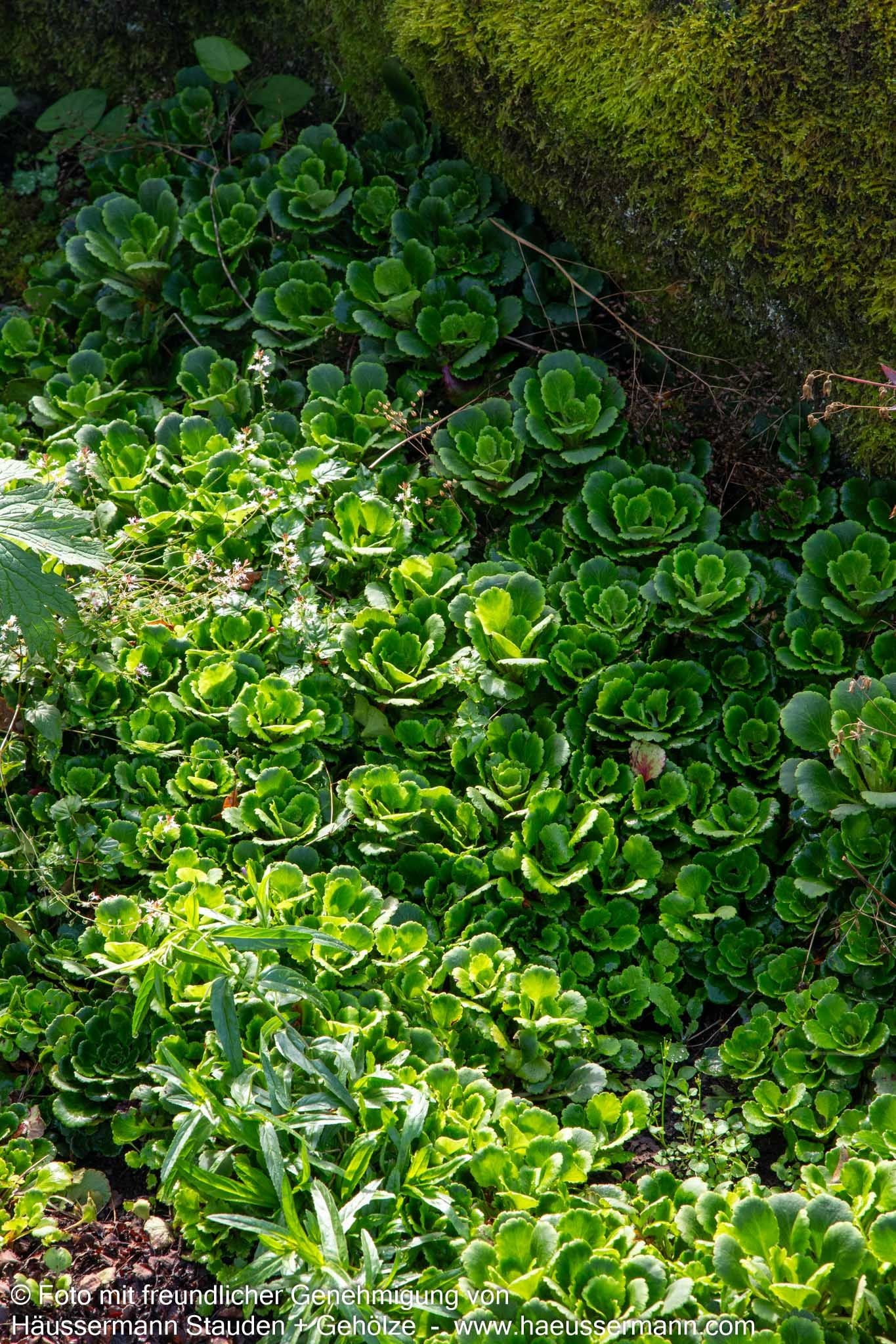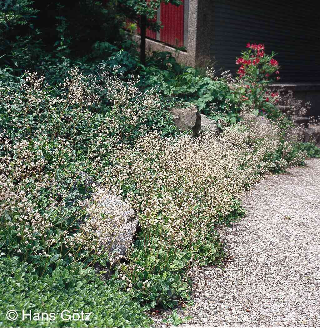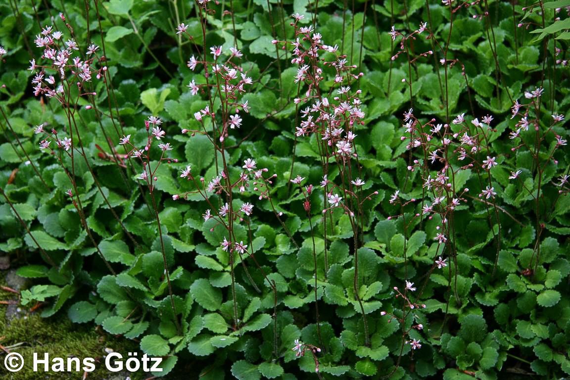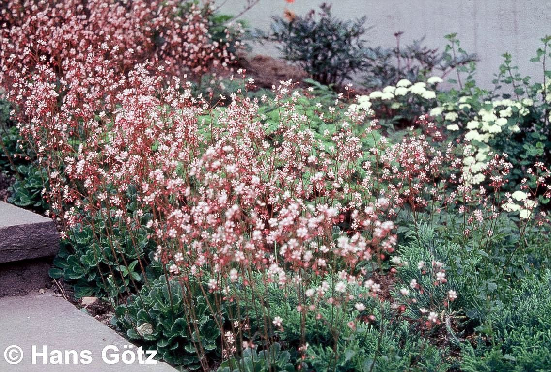 Das Porzellanblümchen (Saxifraga x urbium) ist eine bezaubernde Staude, die mit ihren zarten hell-rosa Blüten von Juni bis Juli jeden Garten bereichert. Diese robuste Staude bildet attraktive, rosettenartige Blattschöpfe mit dunkel-grünen, wintergrünen Blättern und erreicht eine Wuchshöhe von 10-15 cm. Das Porzellanblümchen gedeiht optimal an absonnigen Standorten mit frischem Boden und eignet sich hervorragend als kleinflächiger Bodendecker. Mit ihrer starken Wuchskraft und Winterhärte bis -17°C ist diese vielseitige Pflanze ideal für Gehölzunterpflanzungen, Gehölzränder und Steinanlagen geeignet.