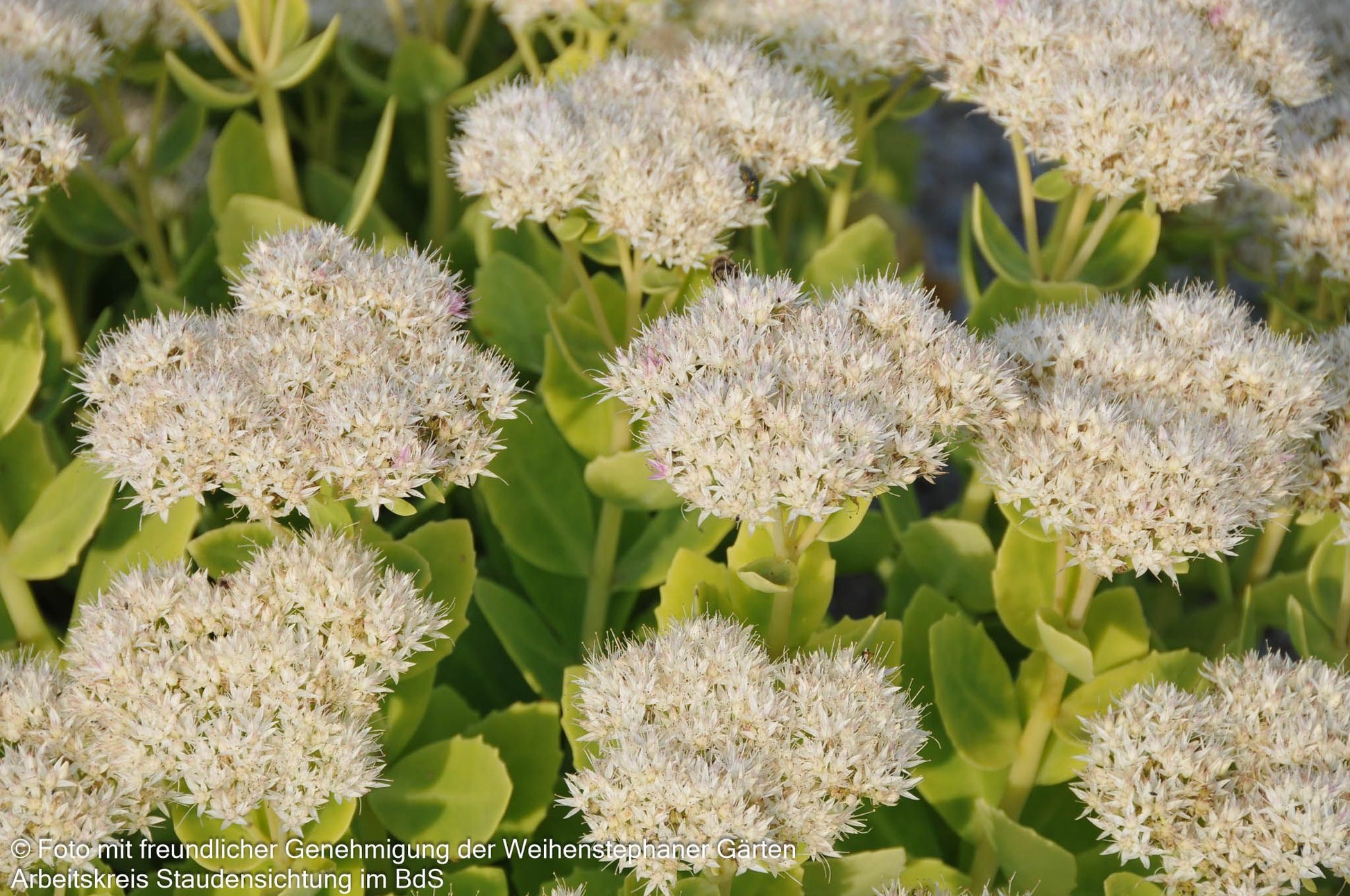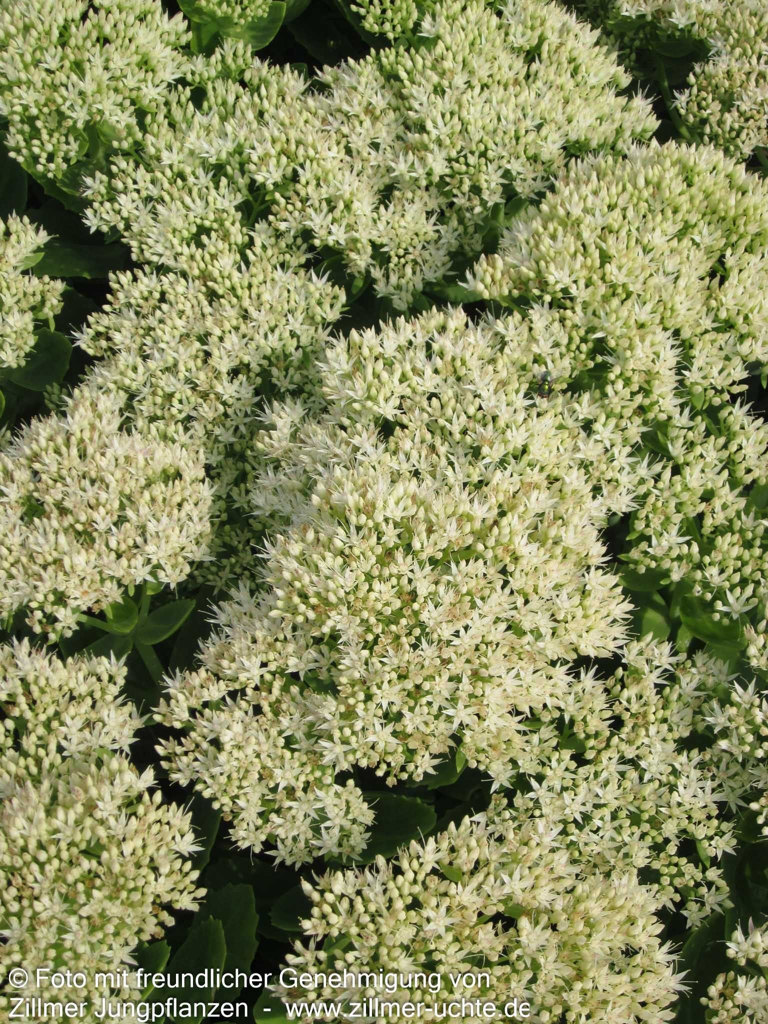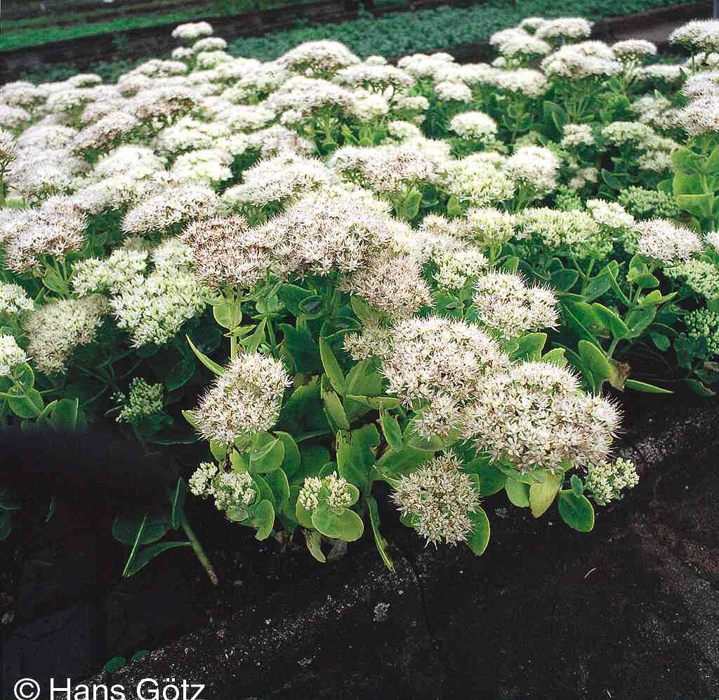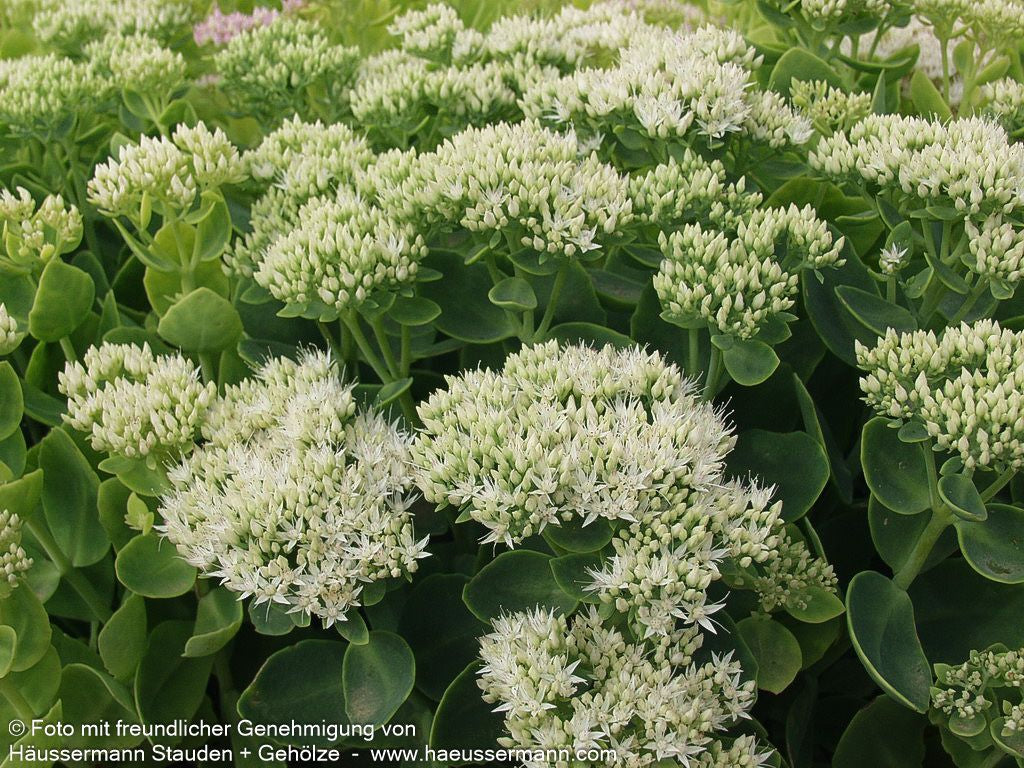 Die Prächtige Fetthenne (Sedum spectabile 'Stardust') ist eine außergewöhnliche Sorte, die als Staude des Jahres 2000 und Staude des Jahres 2011 doppelt ausgezeichnet wurde. Diese robuste Staude begeistert von August bis Oktober mit ihren strahlend weißen, einfachen Blüten, die eine Höhe von 30-40 cm erreichen. Das hell-grüne Laub bildet einen reizvollen Kontrast zu den leuchtenden Blütendolden und macht sie zur perfekten Insektennährpflanze. Diese buschig wachsende Sorte gedeiht optimal an sonnigen Standorten mit trockenen bis frischen Böden und ist bis -22°C winterhart. Als vielseitige Beetstaude eignet sie sich hervorragend für Steinanlagen, den Bauerngarten oder Schnittzwecke.